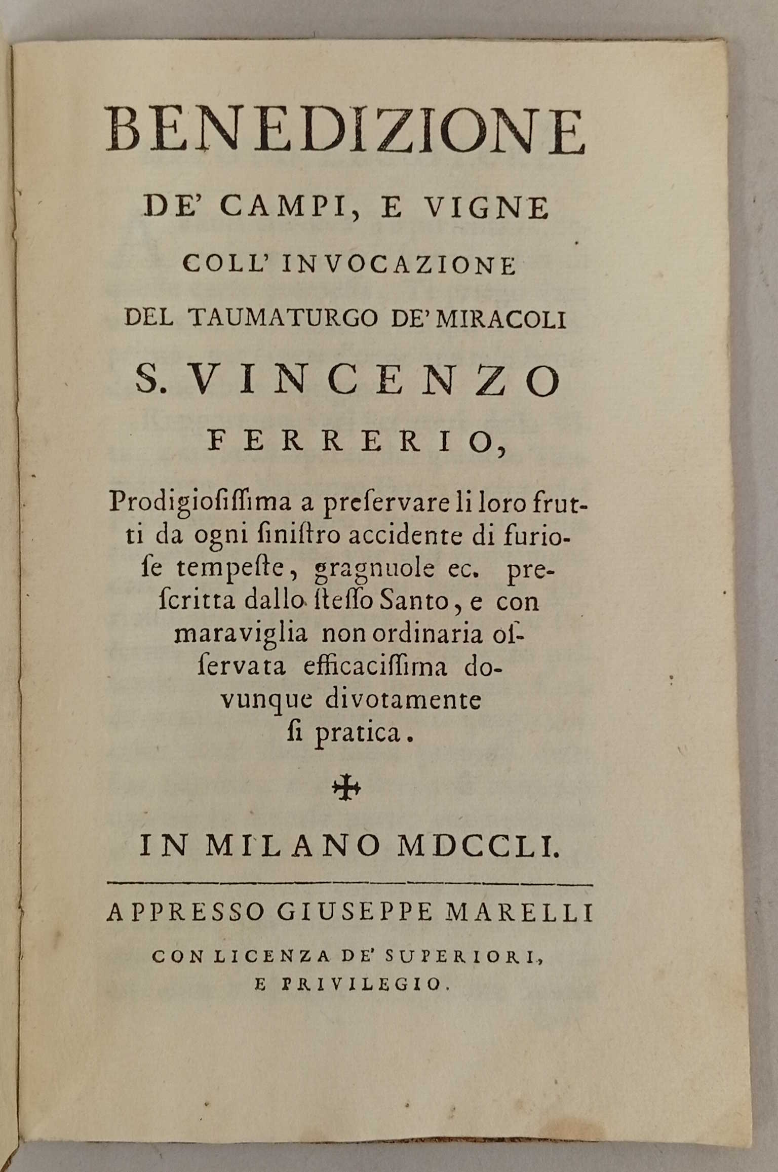 Benedizione de' campi, e vigne coll'invocazione del taumaturgo de' miracoli S. Vincenzo Ferrerio