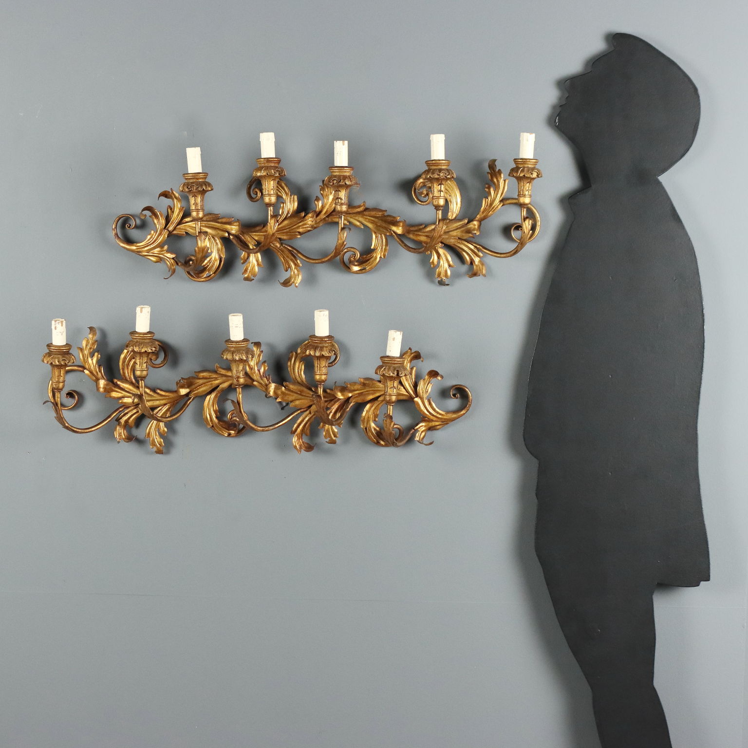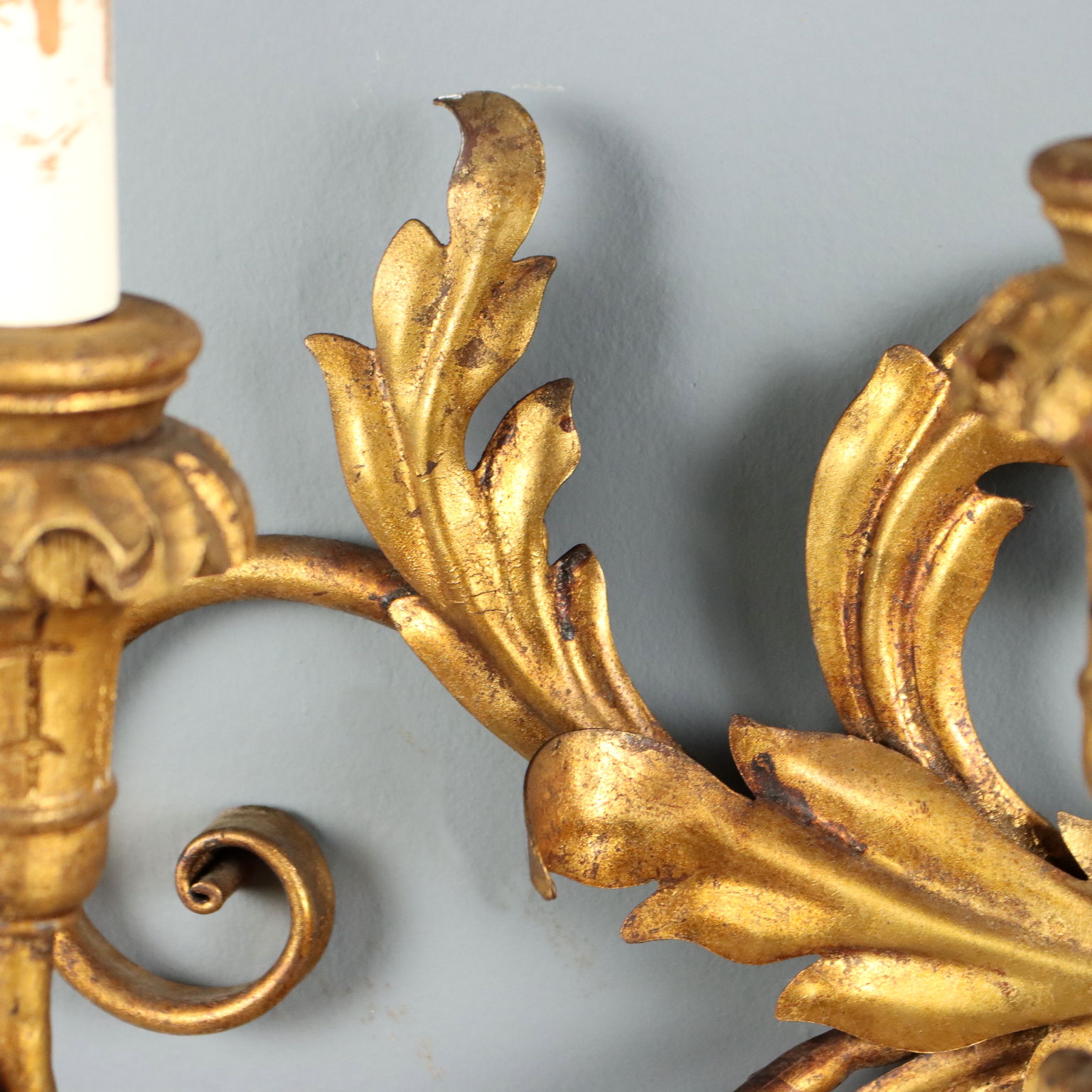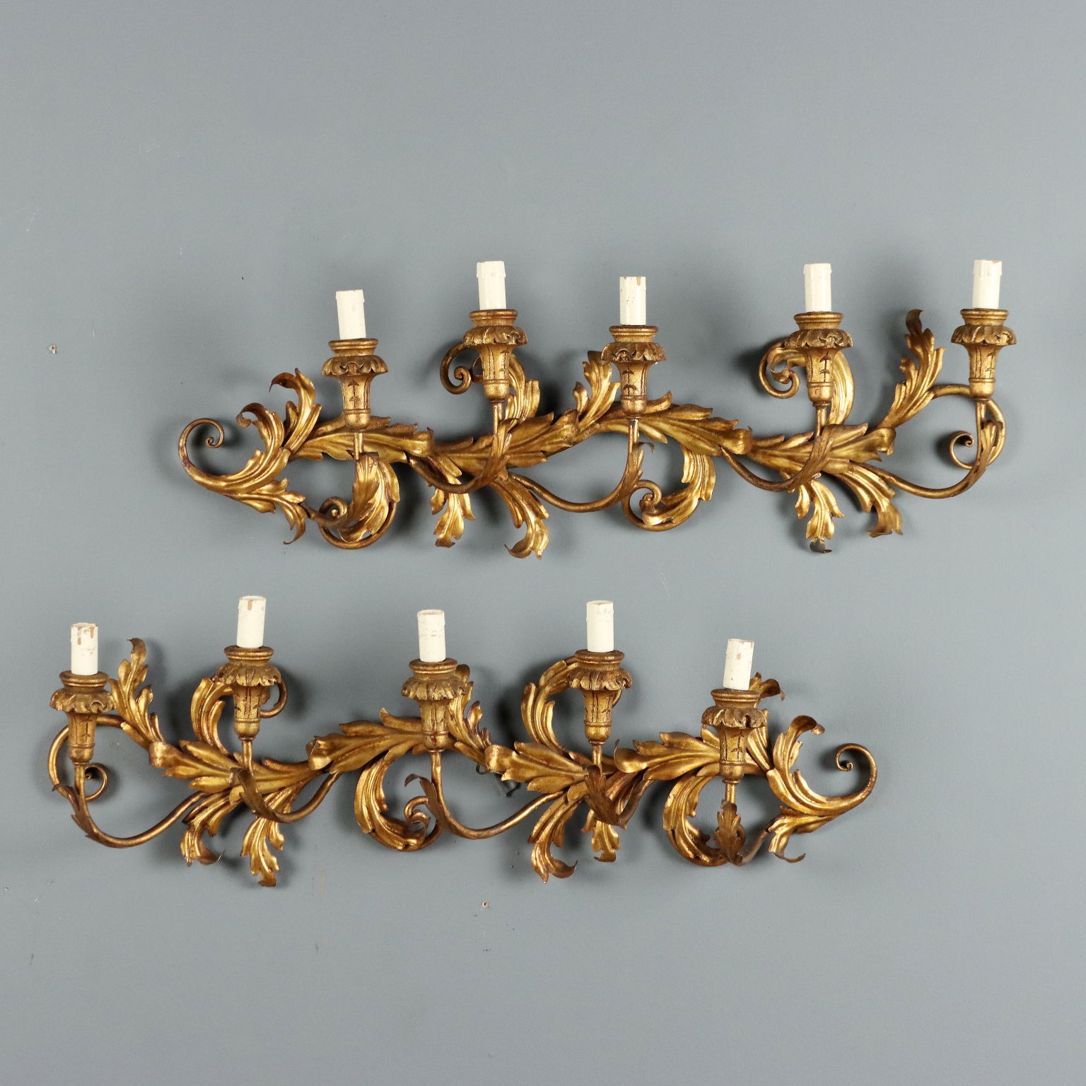 Paar Wandlampen aus geschmiedetem und vergoldetem Eisen. Fünf Lichter, getragen von geschwungenen Armen, geschnitzten Holzbobeches. Verzierungen aus Blech mit Blättern und Schnörkeln. Italien, frühes 20. Jahrhundert.