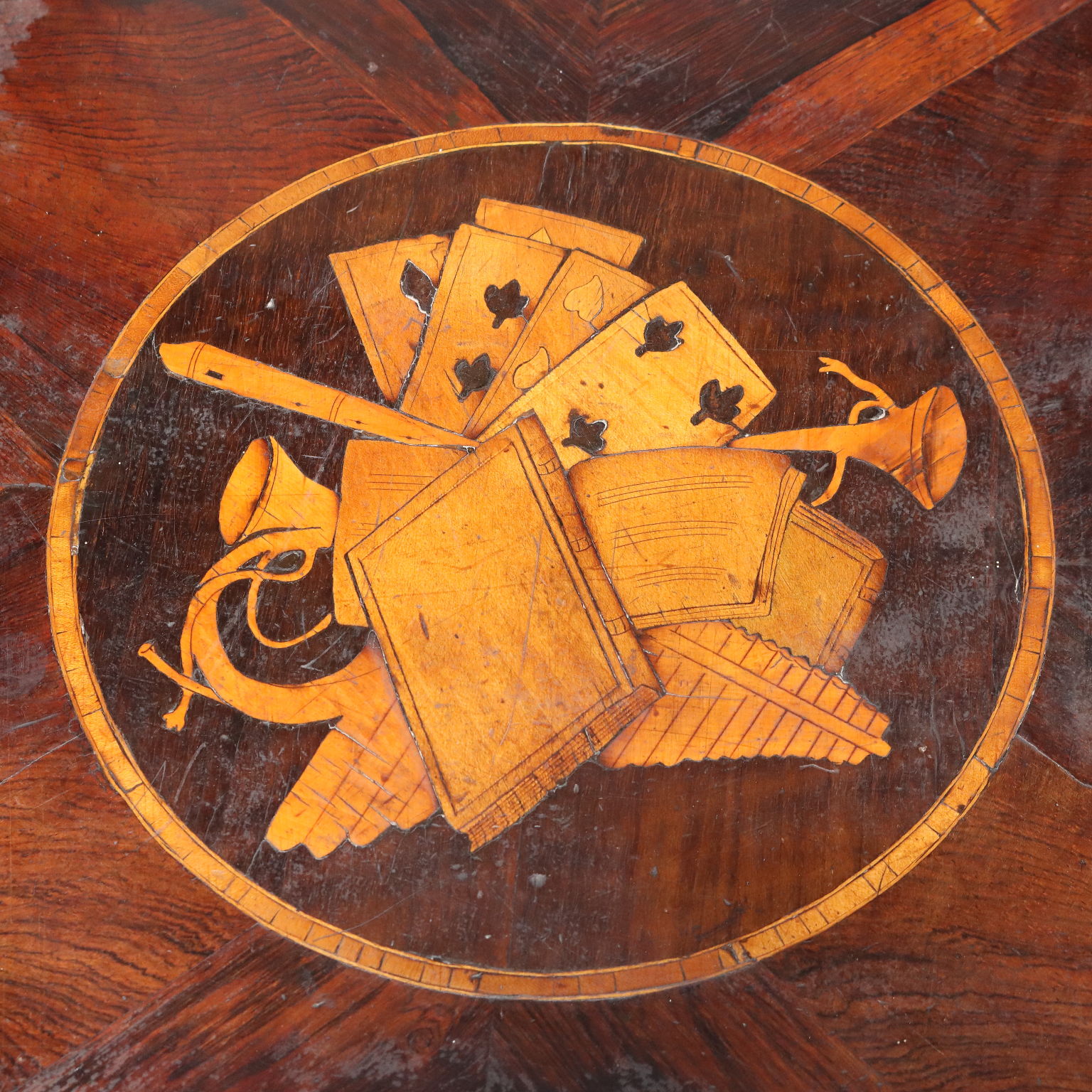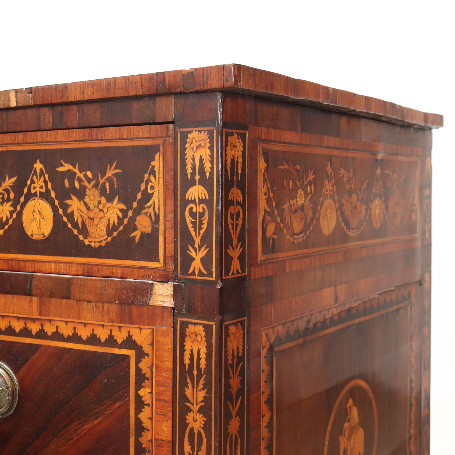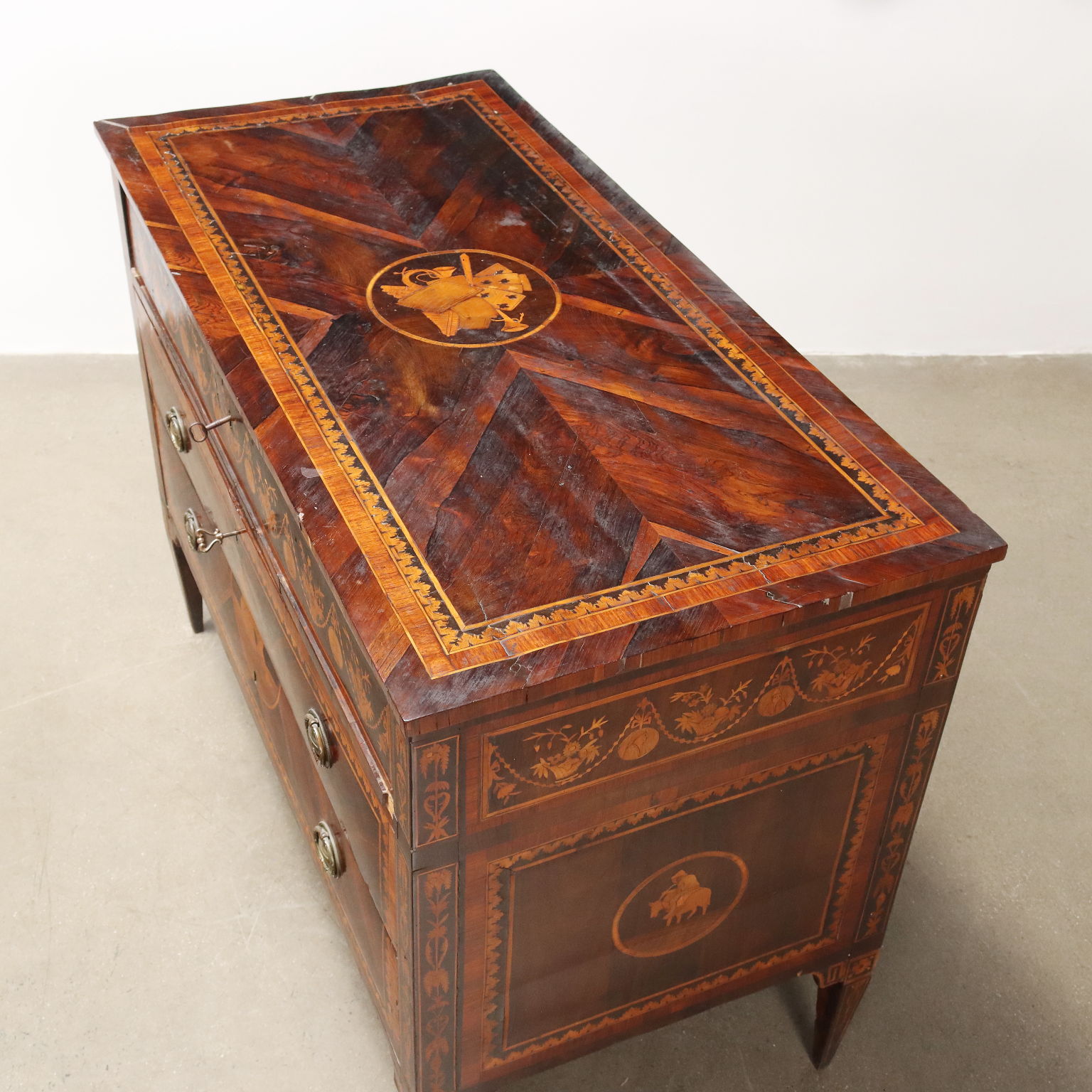 Paar neoklassizistische lombardische Kommoden. Sie sind aus Nussbaum- und Tannenholz gefertigt und verfügen über drei Schubladen an der Vorderseite, eine in das Band unter der Oberseite eingelassen und zwei größere ohne sichtbare Kette. Vollständig in Palisander furniert mit Palisanderrändern, Ahorn-Einlage und Intarsien aus verschiedenen Hölzern. Im Band unter dem Boden ist ein Intarsienmotiv mit einer Perlenkette mit Kameen zu sehen, die von Gallen gehalten werden, auf denen Blumenkörbe ruhen, in den Reserven der Vorderseite und der Seiten eine Rosette mit eingelegten volkstümlichen Figuren, auf den Böden eine Rosette mit einem musikalischen Panoply, auf den Pfosten, die in pyramidenstumpfförmigen Füßen enden, eingelegte Kandelaber mit Stucksockel.