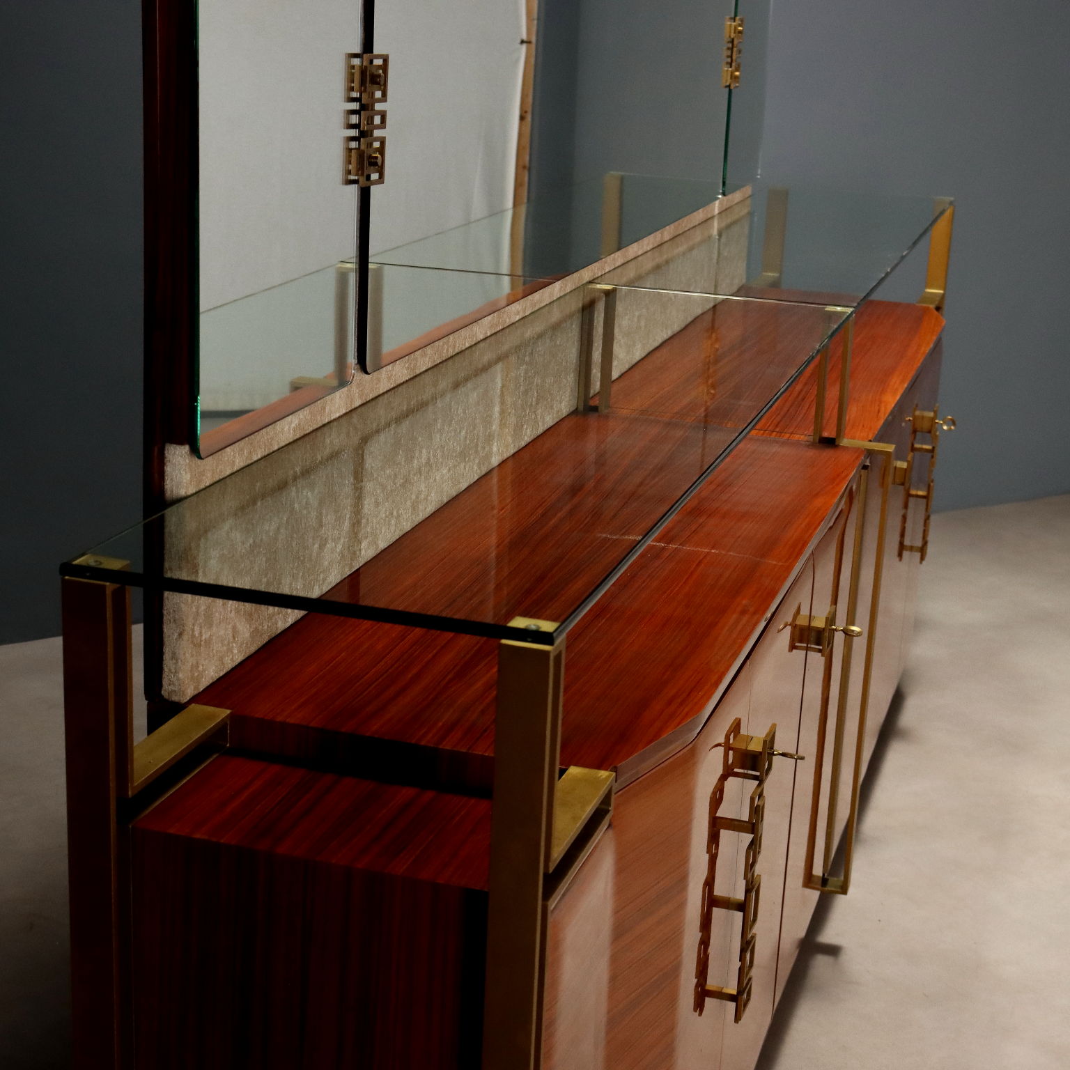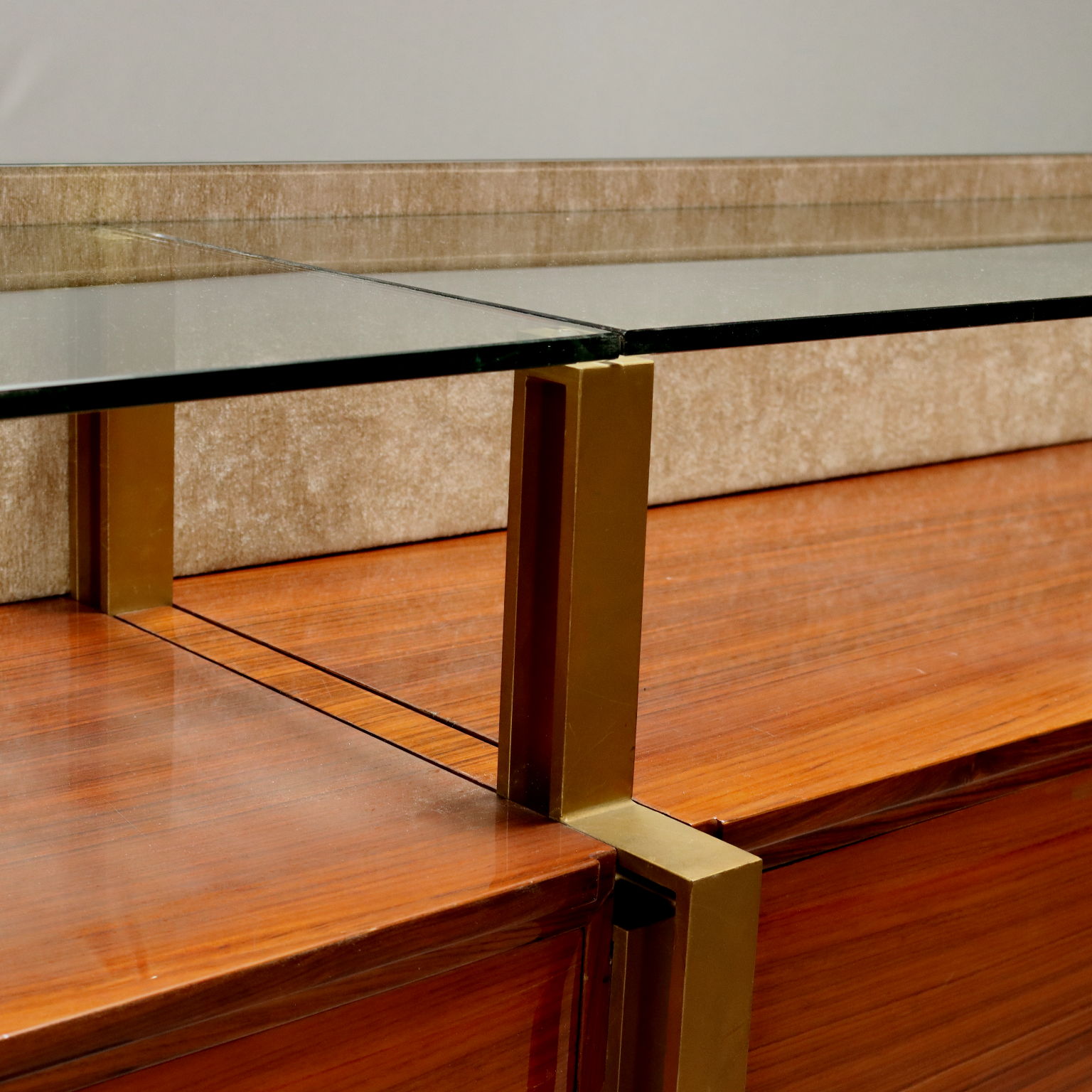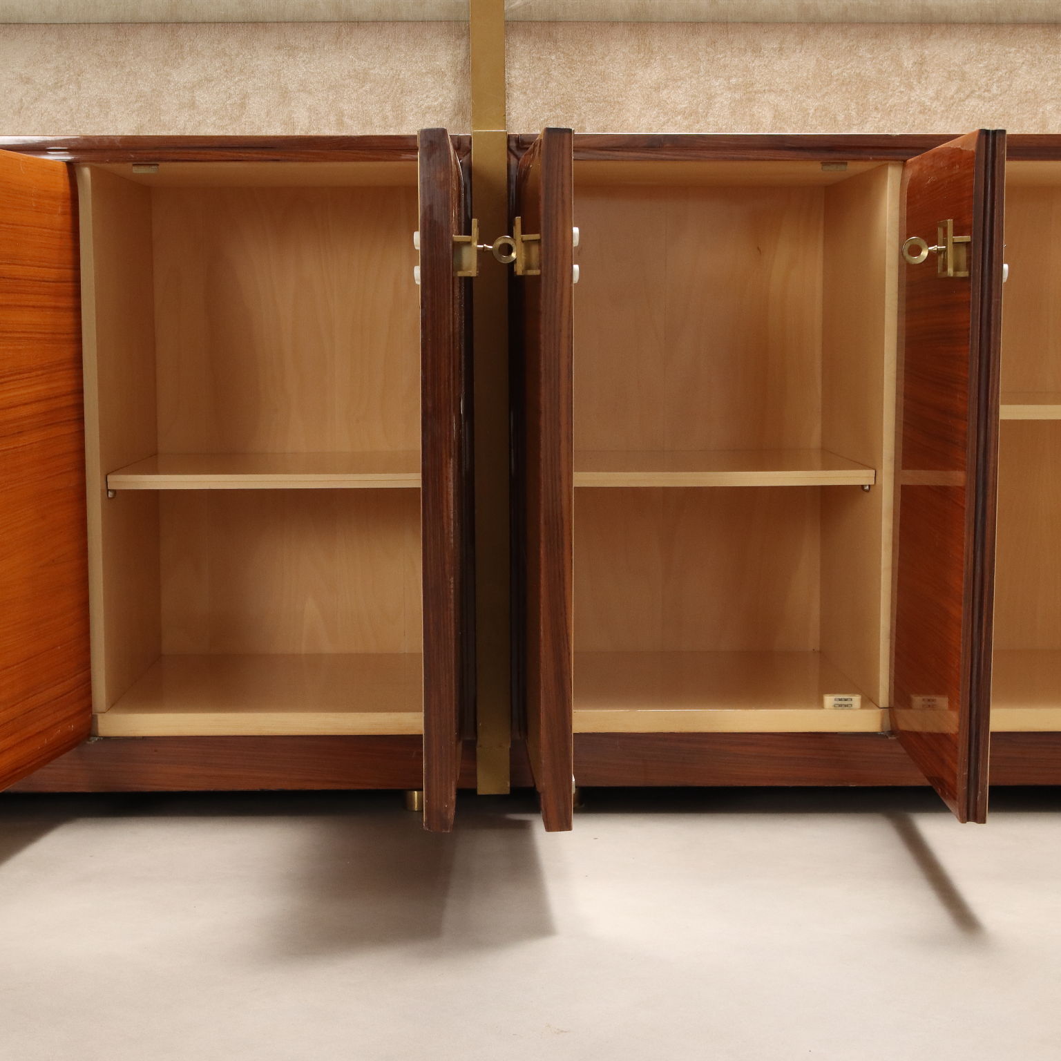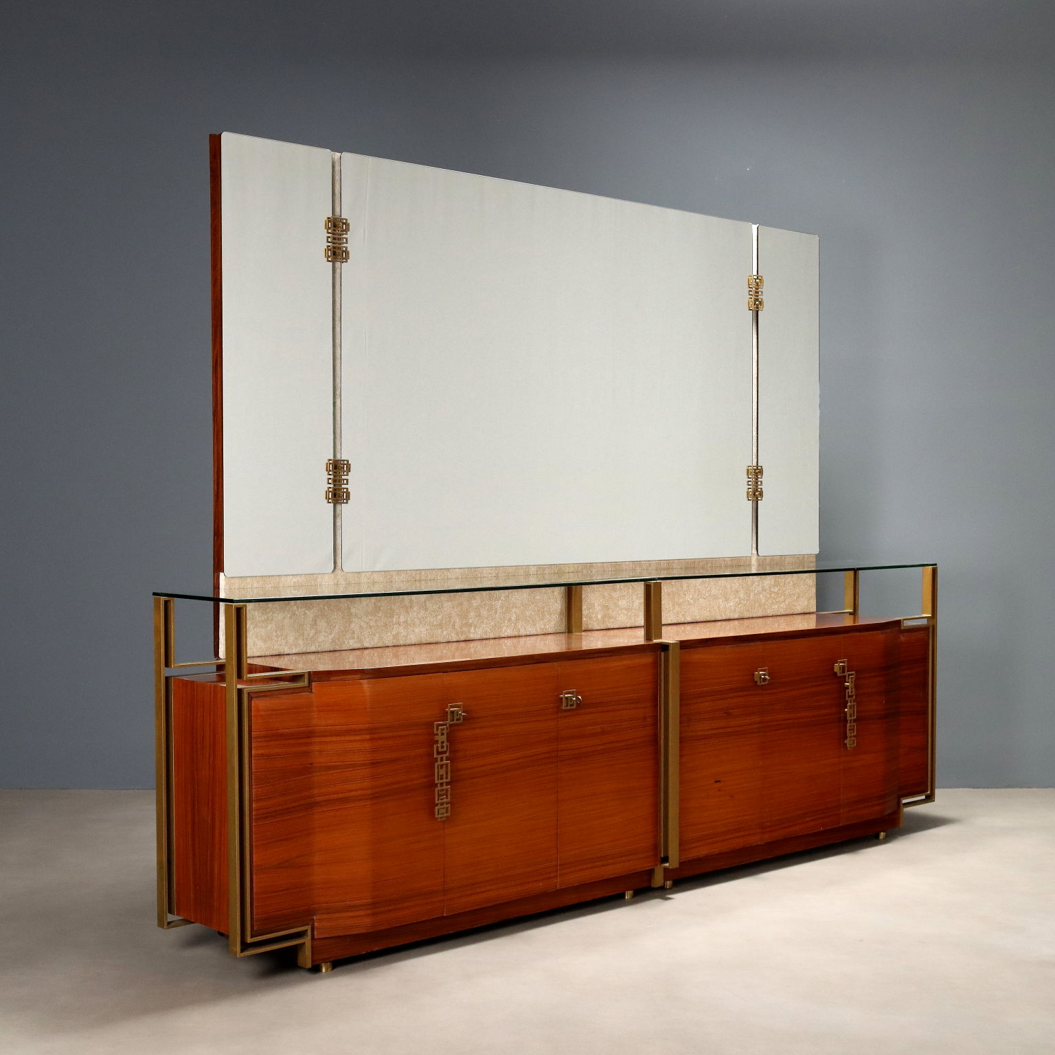 Hochwertige, handgefertigte Wohnzimmermöbel von Canturina mit messingbeschichtetem Metallgestell, Staufächern mit Flügeltüren aus exotischem Holzfurnier und Polyesterlackierung, Schubladen und Einlegeböden, einer Glasrückwand und einem großen rechteckigen Spiegel über einer neu renovierten, weißen Stoffrückwand. Restauriert.