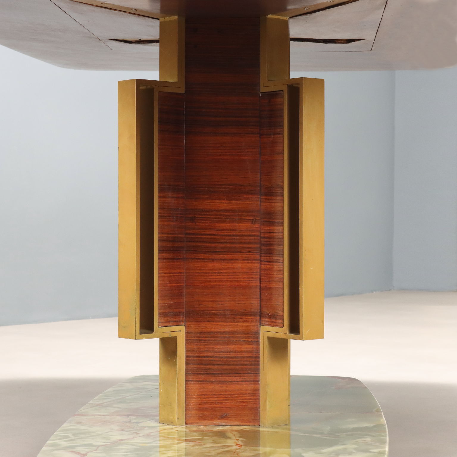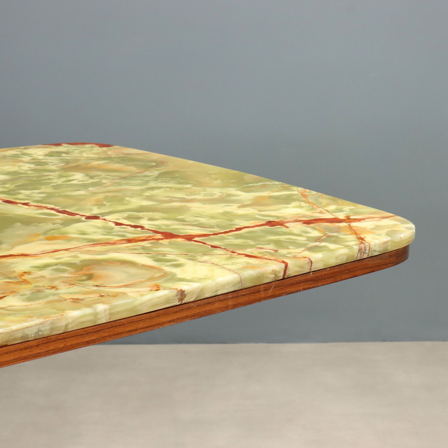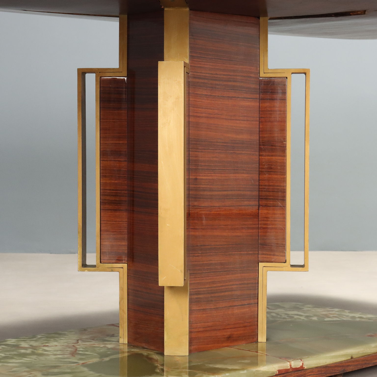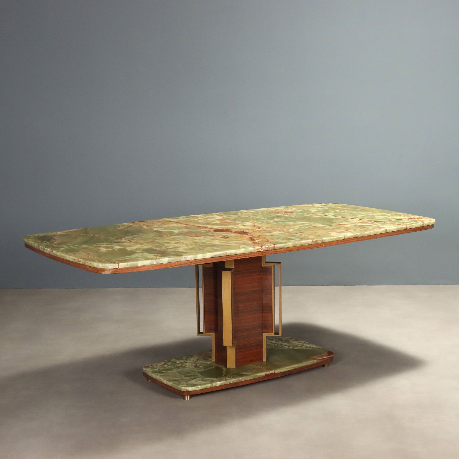 Eleganter, handgefertigter Tisch von Canturina. Das Gestell besteht aus exotischem Holzfurnier und ist mit einem dekorativen, messingbeschichteten Metallrahmen verziert. Die Tischplatte ist aus edlem, hochwertigem Onyx gefertigt. Leichte Gebrauchsspuren auf der Tischplatte.