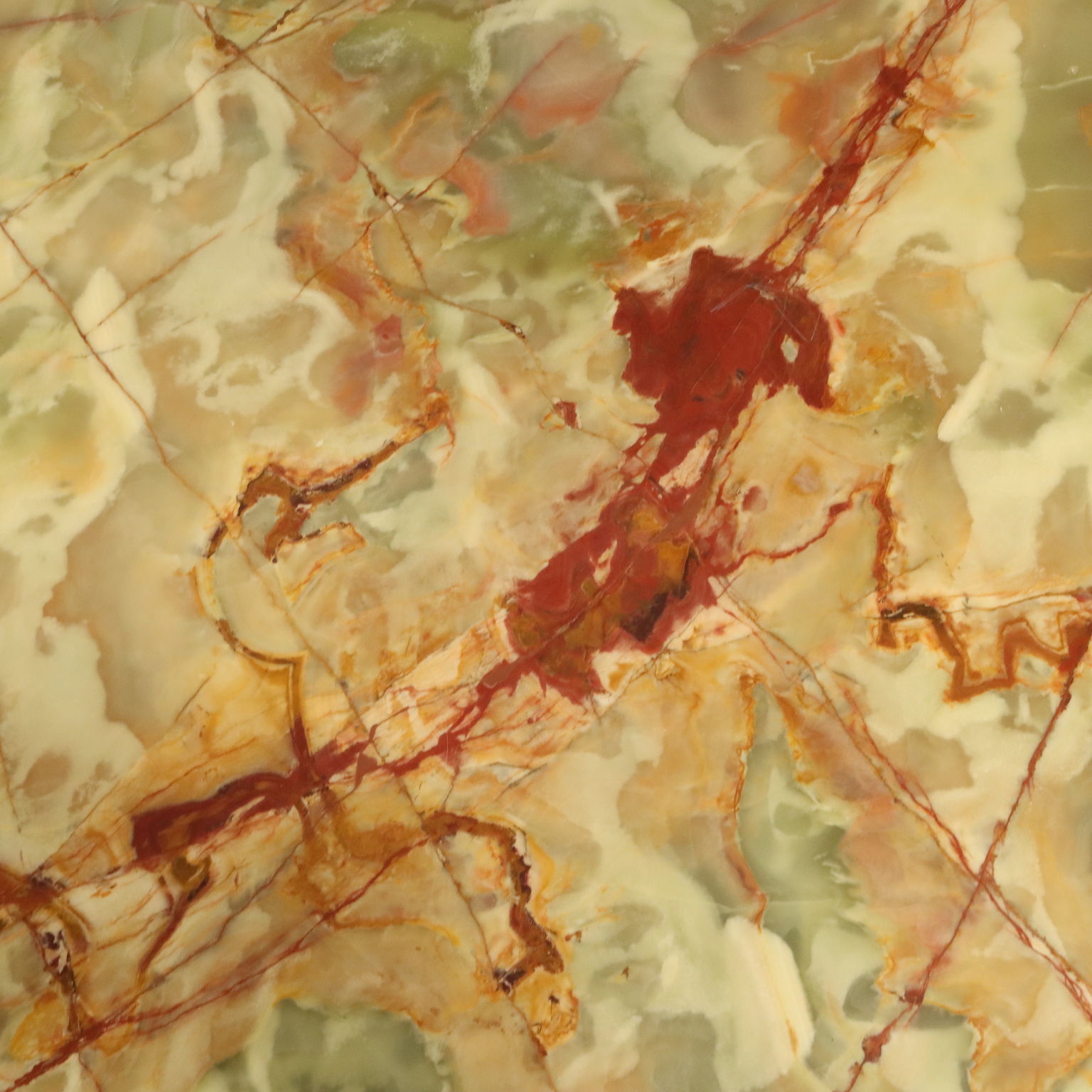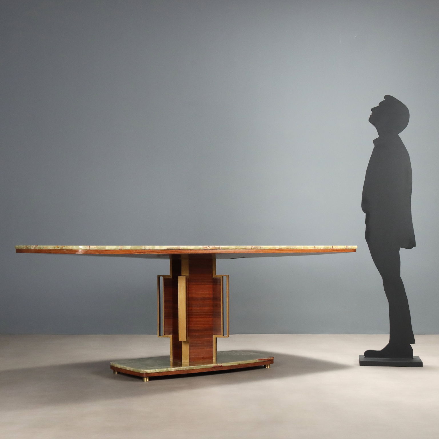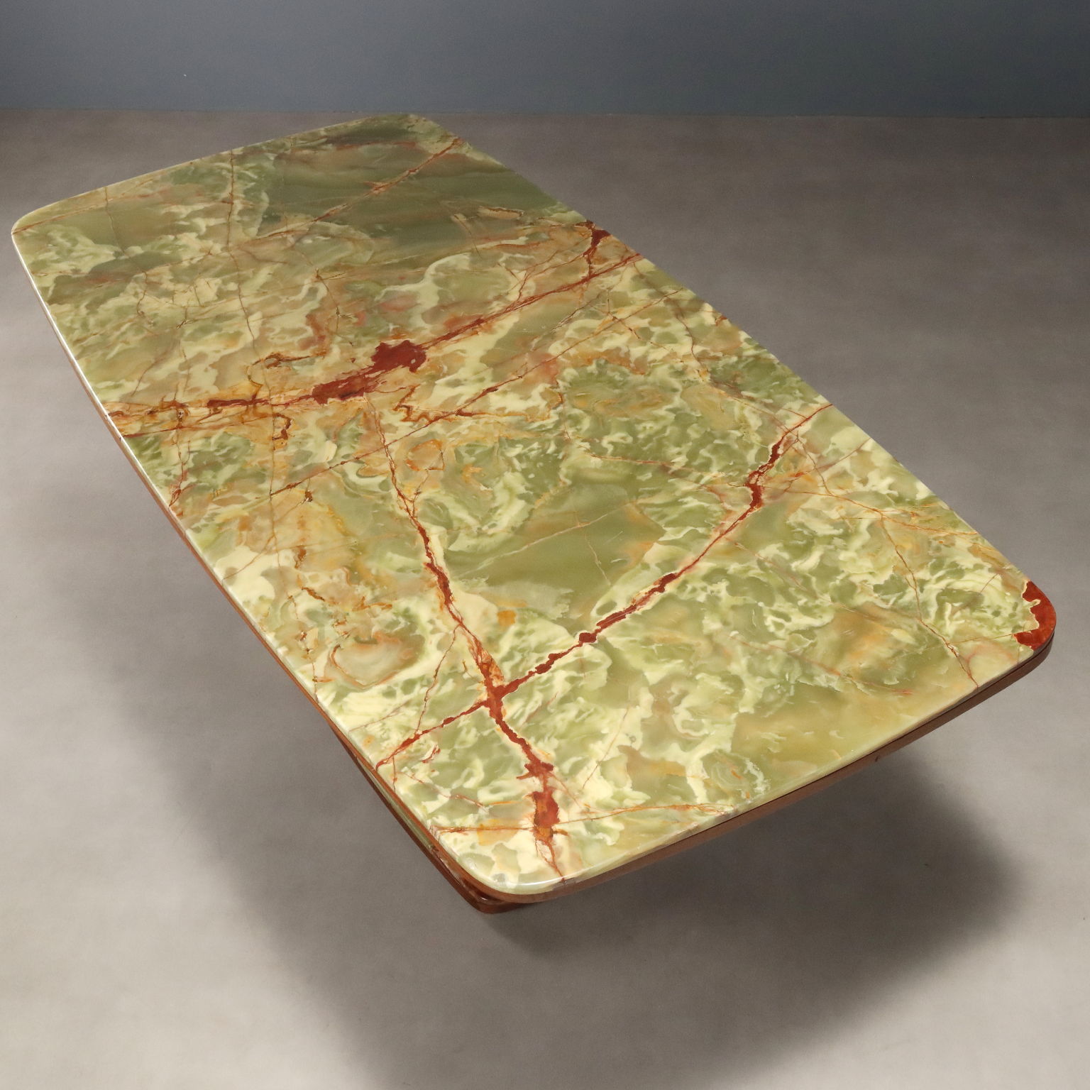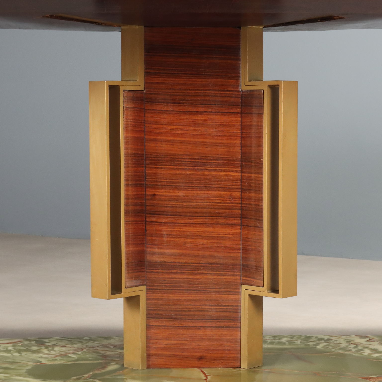 Eleganter, handgefertigter Tisch von Canturina. Das Gestell besteht aus exotischem Holzfurnier und ist mit einem dekorativen, messingbeschichteten Metallrahmen verziert. Die Tischplatte ist aus edlem, hochwertigem Onyx gefertigt. Leichte Gebrauchsspuren auf der Tischplatte.