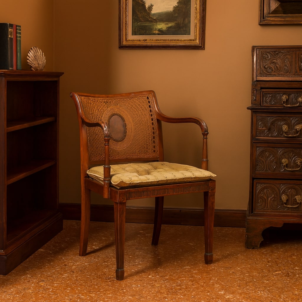 Sessel aus nussbaumfarben gebeizter Buche. Rückenlehne aus Rohrgeflecht mit zentralem Holzeinsatz, geschwungene Armlehnen auf gedrechselten Säulen, pyramidenstumpfförmige Beine mit floralen Schnitzereien, wie auch auf der Traverse. Gepolsterte Sitzfläche. Italien, Ende des 19. Jahrhunderts.