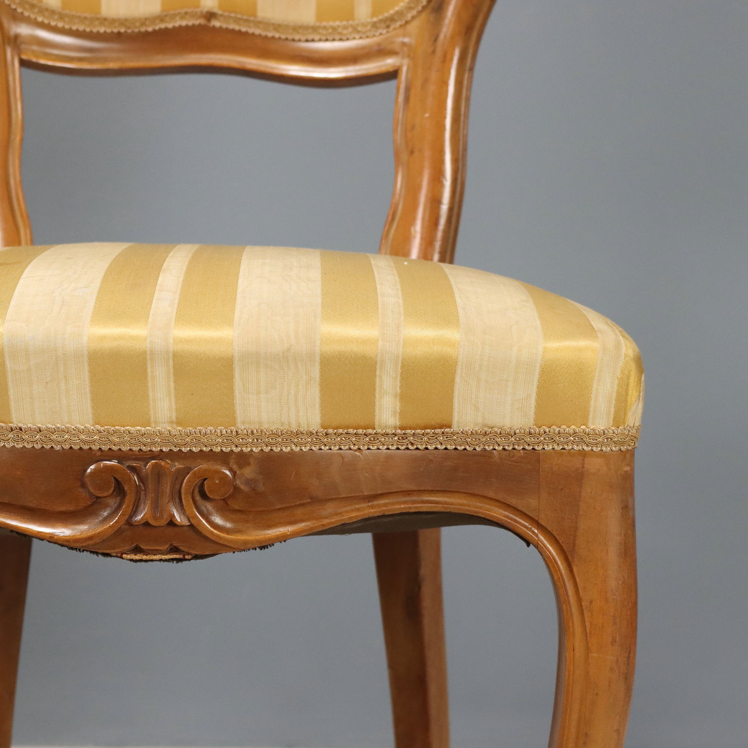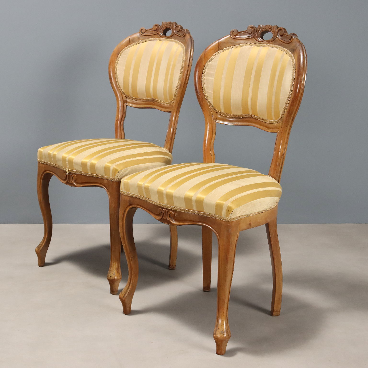 Satz von vier Louis-Philippe-Stühlen aus Nussbaumholz. Geschnitzter und durchbrochener Rückenlehnen-Architrav, geschwungene Beine. Gepolsterte Sitz- und Rückenlehnenplatte. Italien, zweites Viertel des 19. Jahrhunderts.