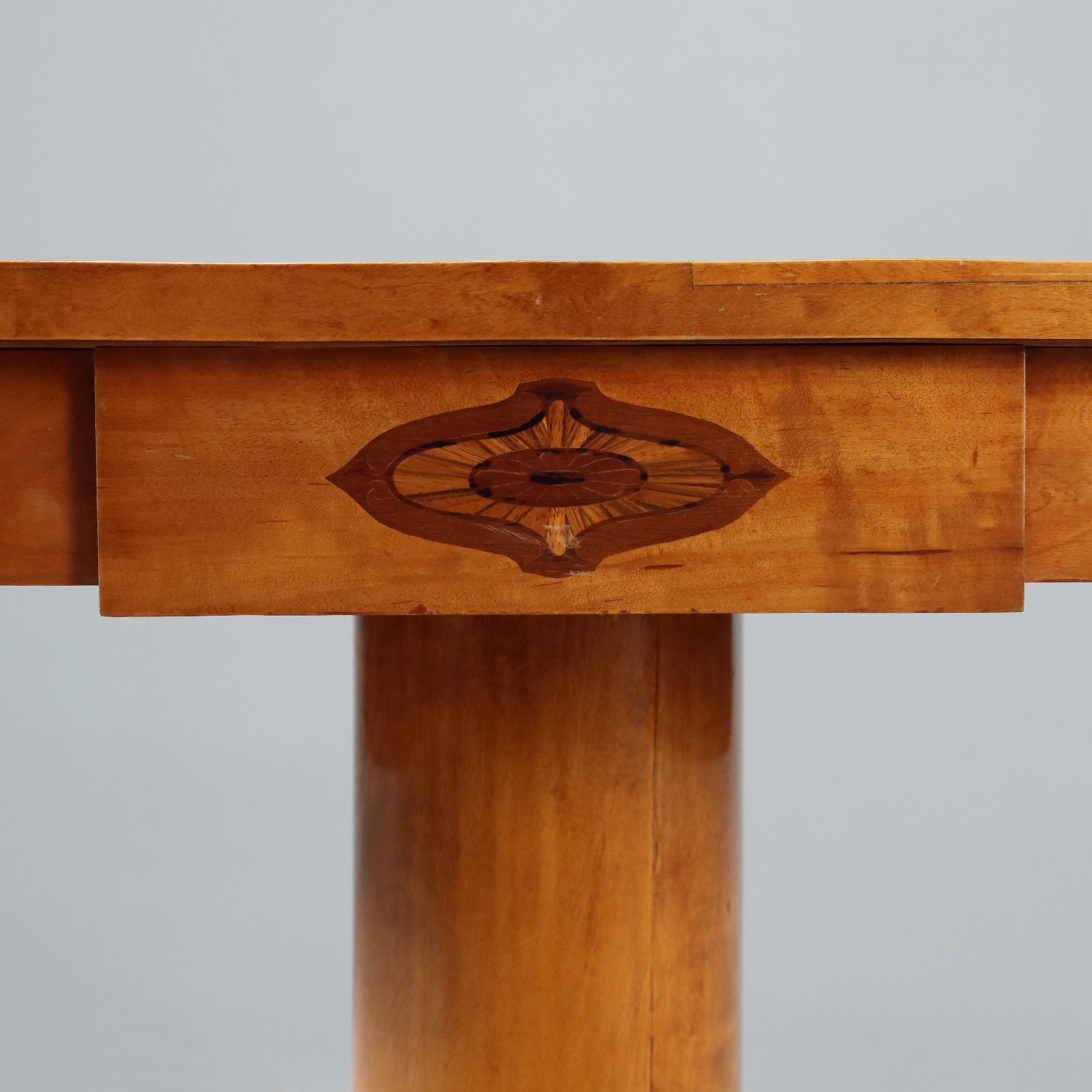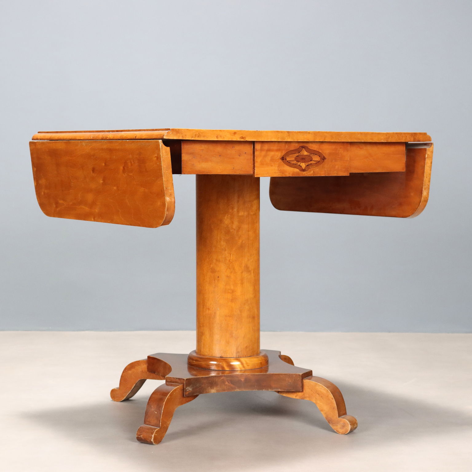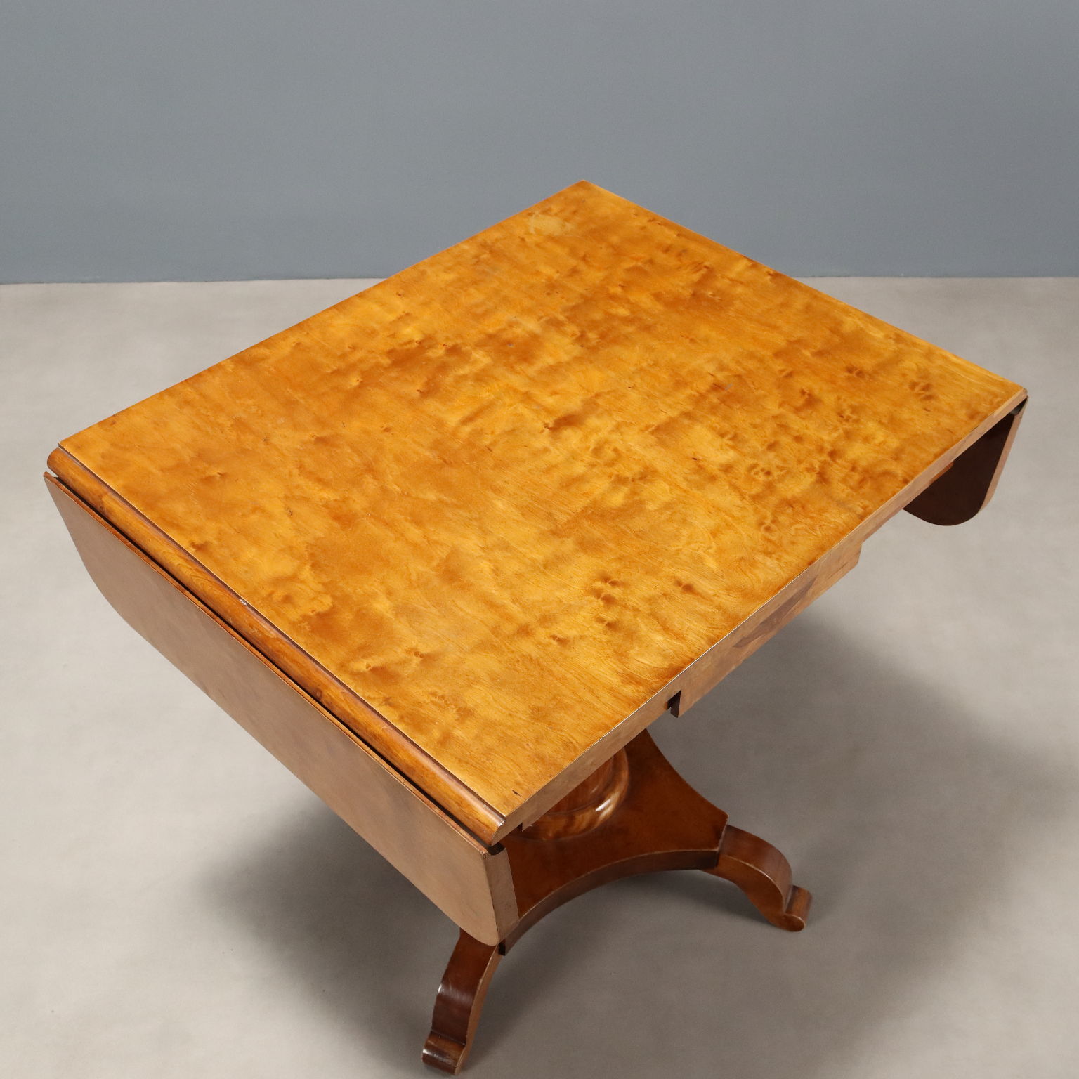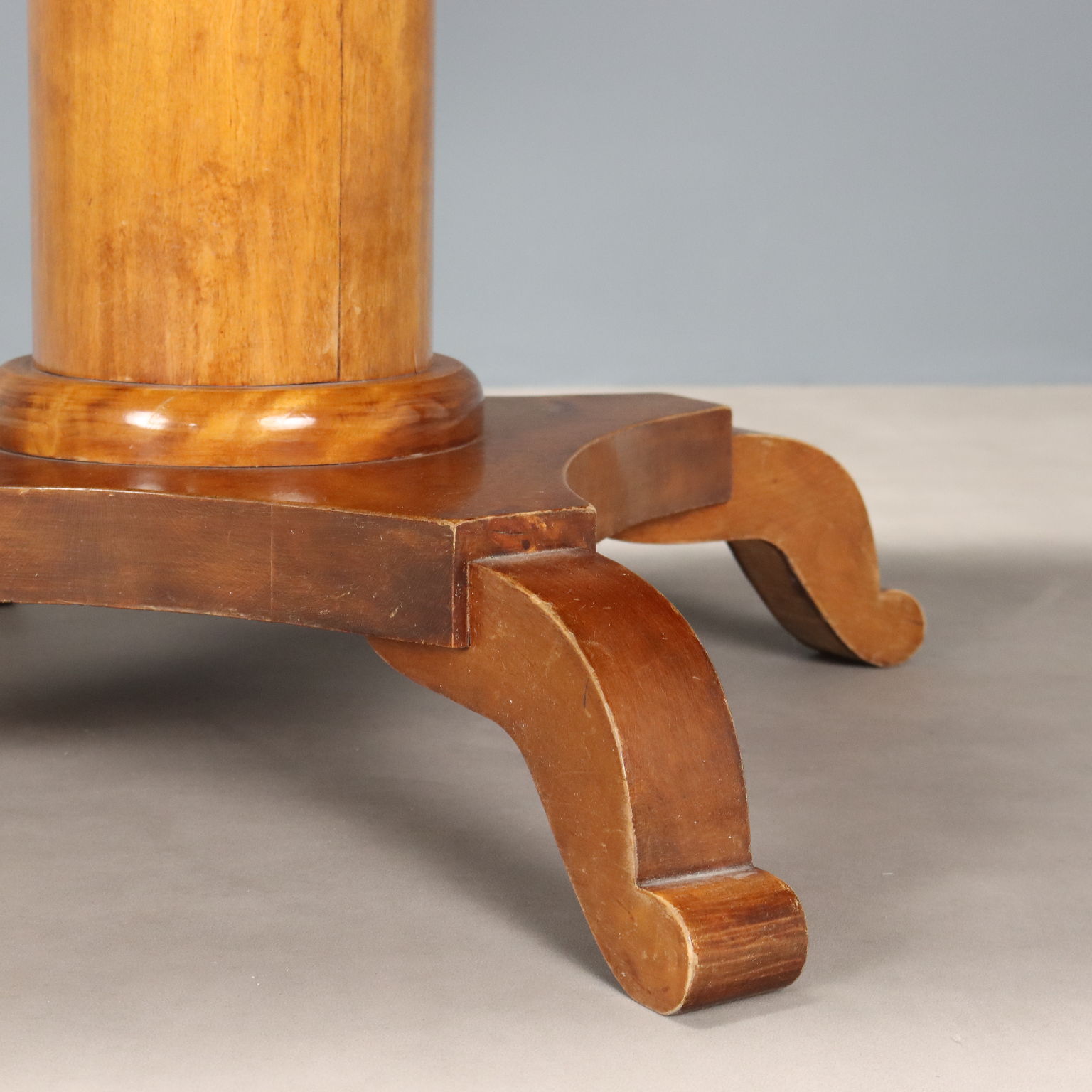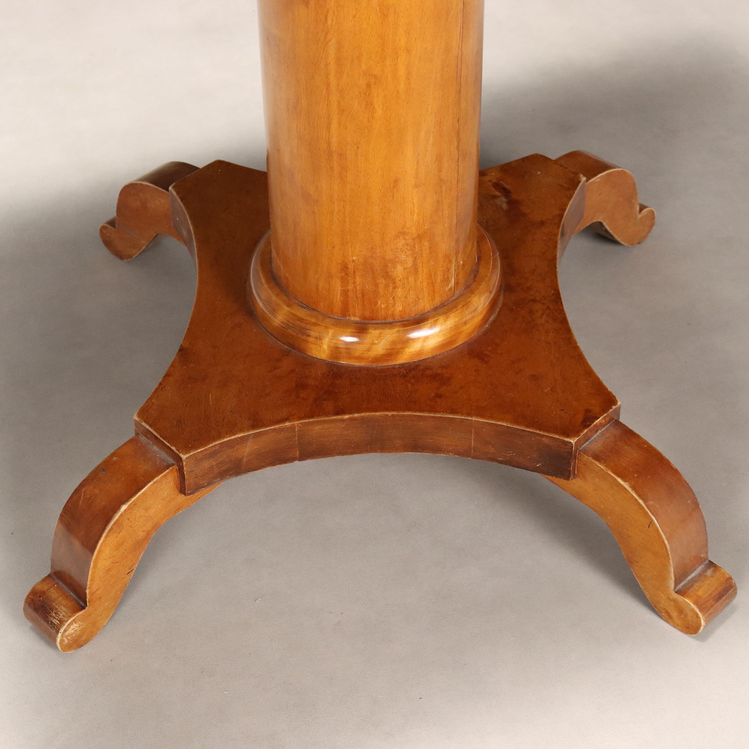 Beistelltisch aus Ahornholz. An der Unterseite des Tisches befinden sich gegeneinander versetzte Schubladen. Das gedrechselte Mittelbein ruht auf einem Sockel mit vier geschwungenen Füßen. Österreich, Ende des 19. Jahrhunderts.