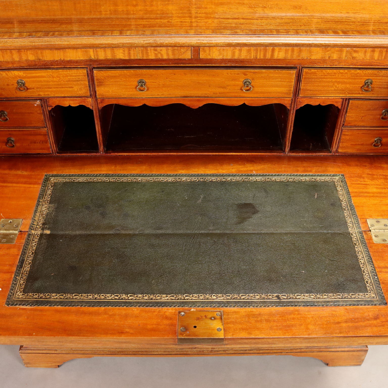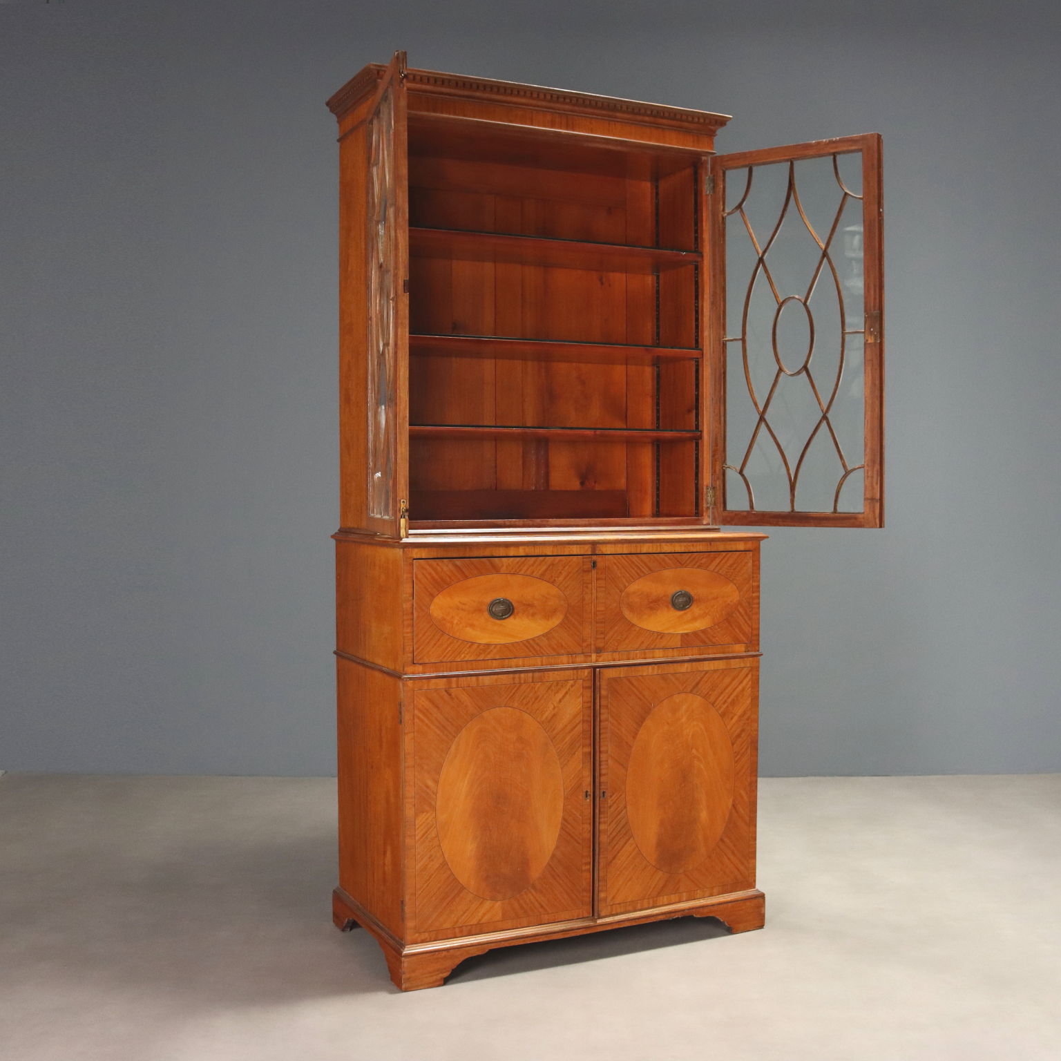 Englisches Bücherregal aus Satinholz. Der obere Teil verfügt über zwei geformte Glastüren und drei verstellbare Einlegeböden. Über den beiden Türen befindet sich eine zentrale Schublade mit Klappe und Auszug. Darin verborgen befinden sich ein Schreibtisch mit grünem Ledereinsatz und ein Schrank mit sieben Schubladen und drei offenen Fächern. Konsolenfüße, Griffe aus gemeißeltem Blech und bündige Schlüsselschilder. England, spätes 19. Jahrhundert.