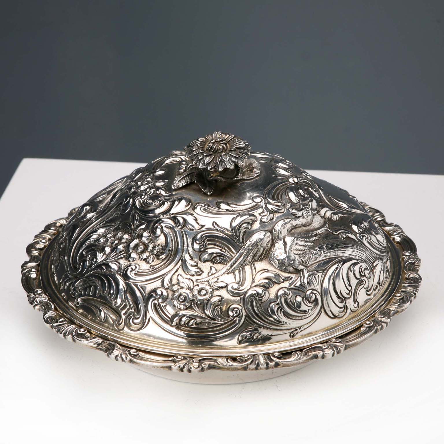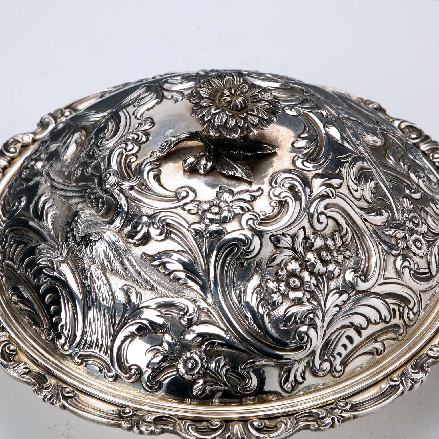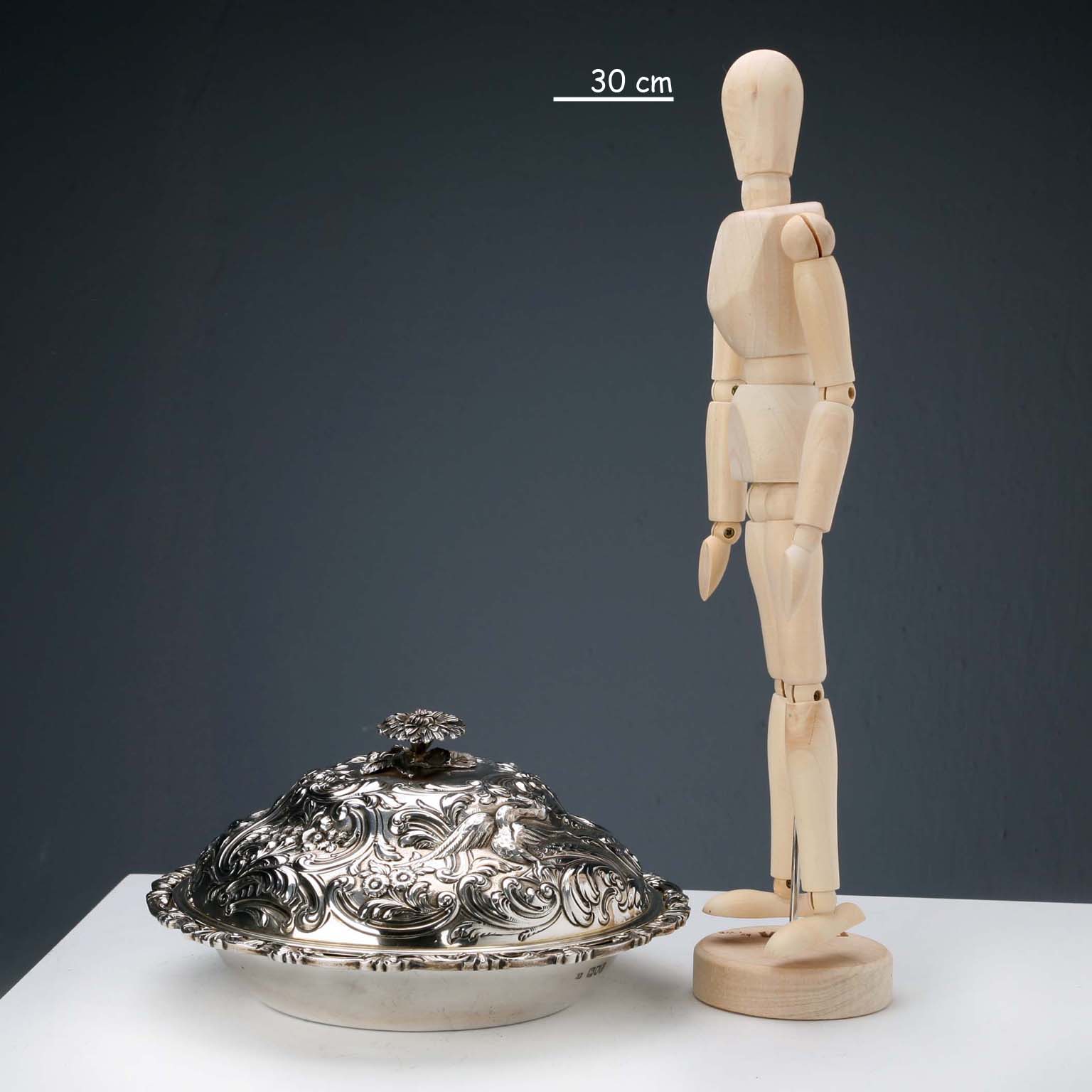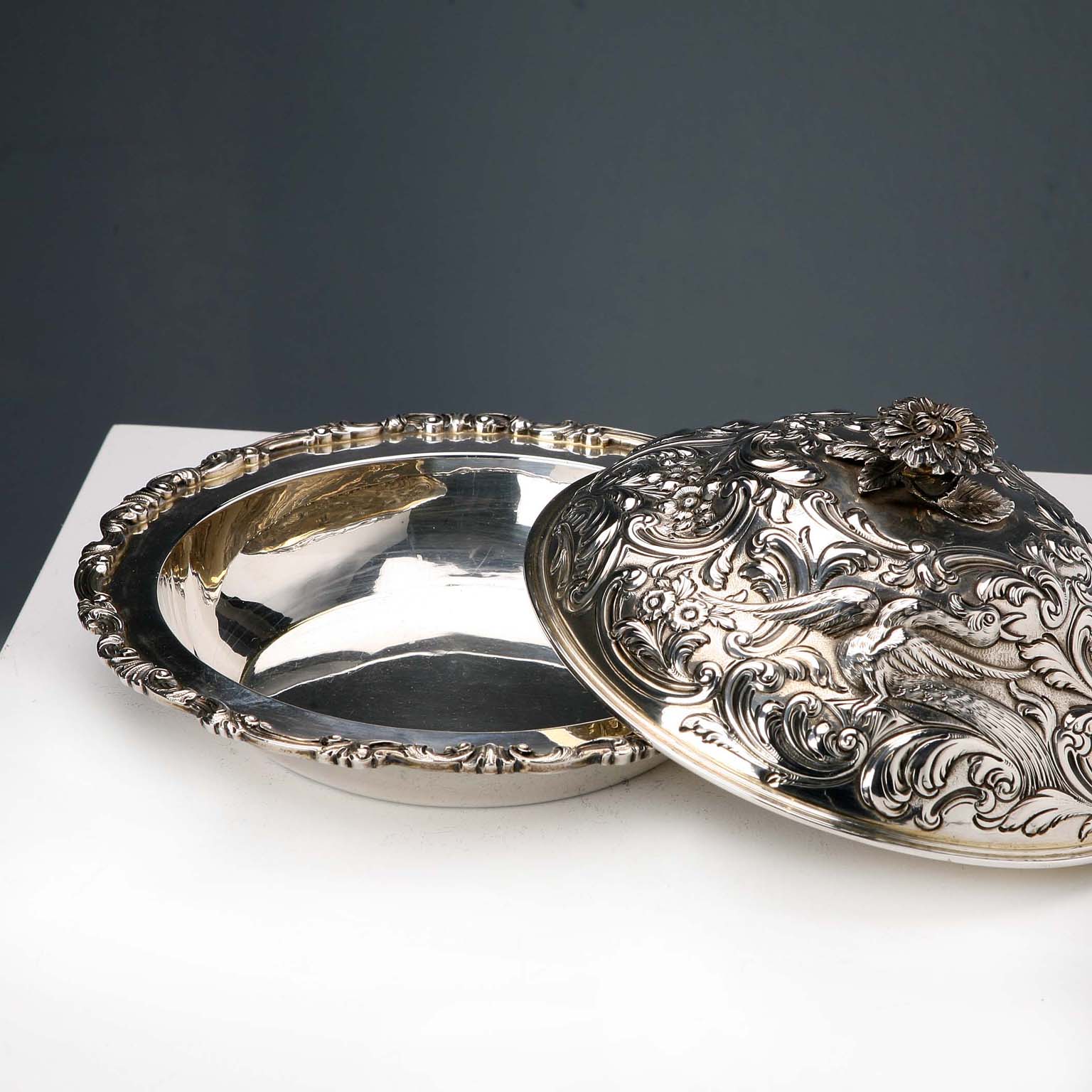 Schale aus 925er Silber mit geprägtem und ziseliertem Deckel, der ein Allover-Motiv aus Blattranken, Blütenzweigen und Vögeln zeigt. Der Henkel ist blütenförmig, der Rand gewellt und mit erhabenem Dekor verziert. Die Silberschmiede- und Silberschmiedepunzen (HB) sind außen auf der Schale und unter dem Deckel eingraviert. Gewicht: 548 Gramm.