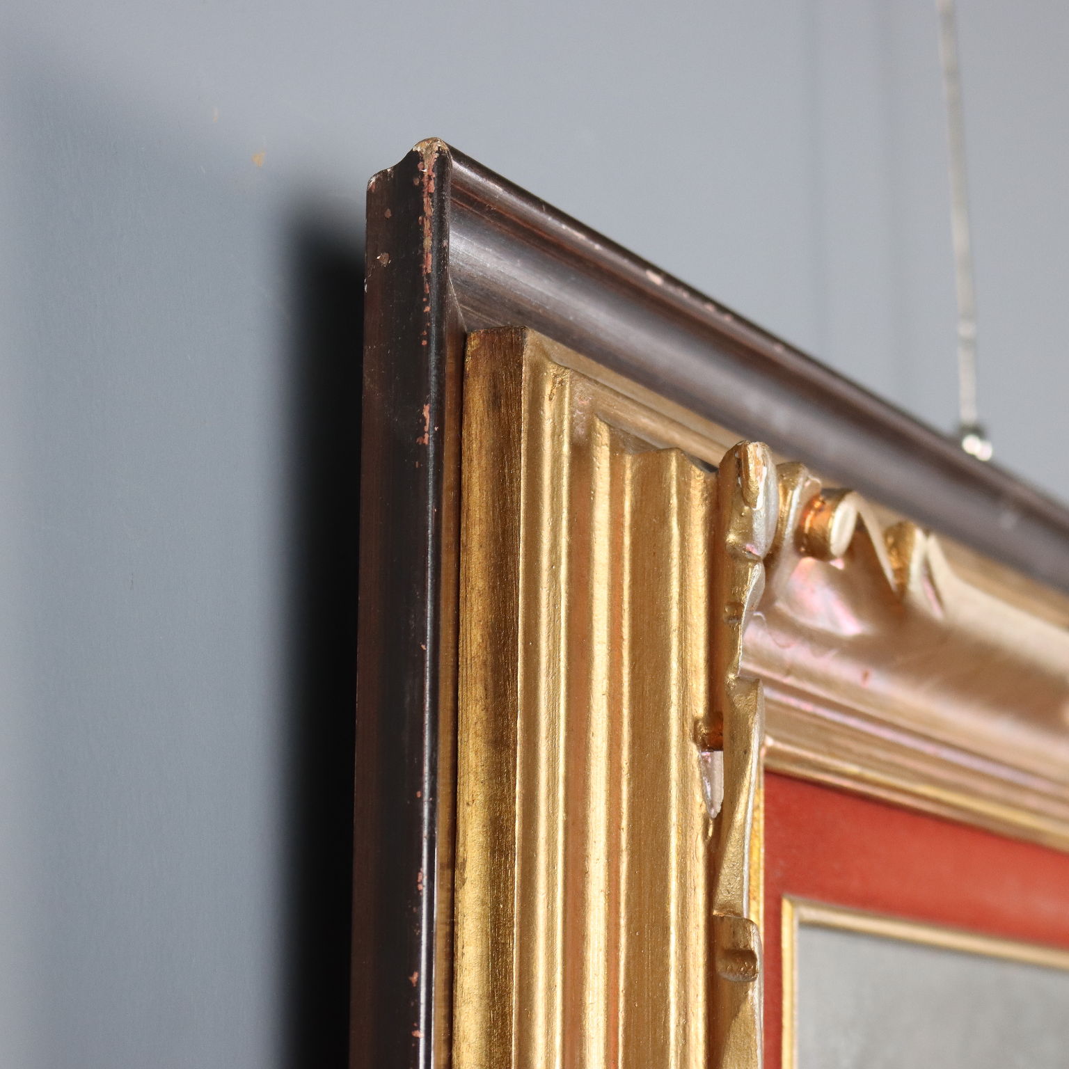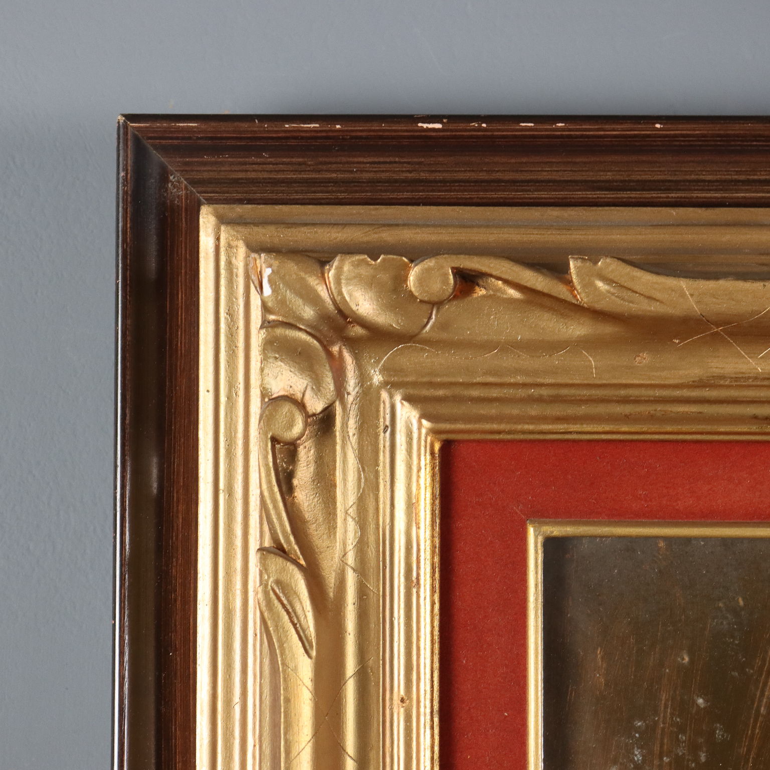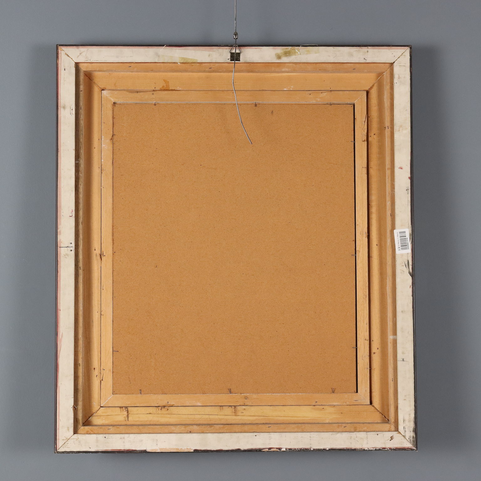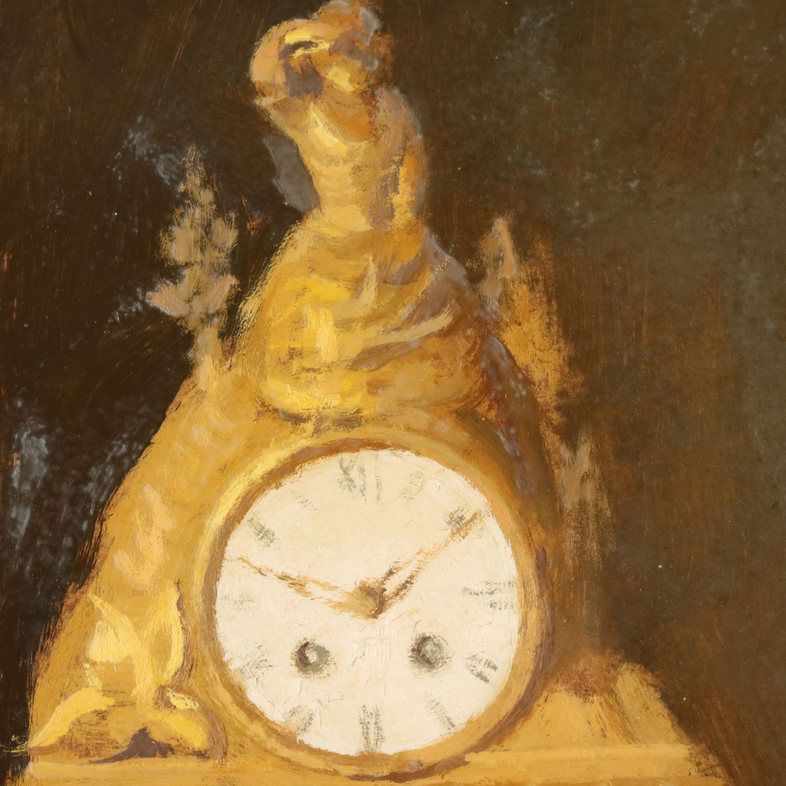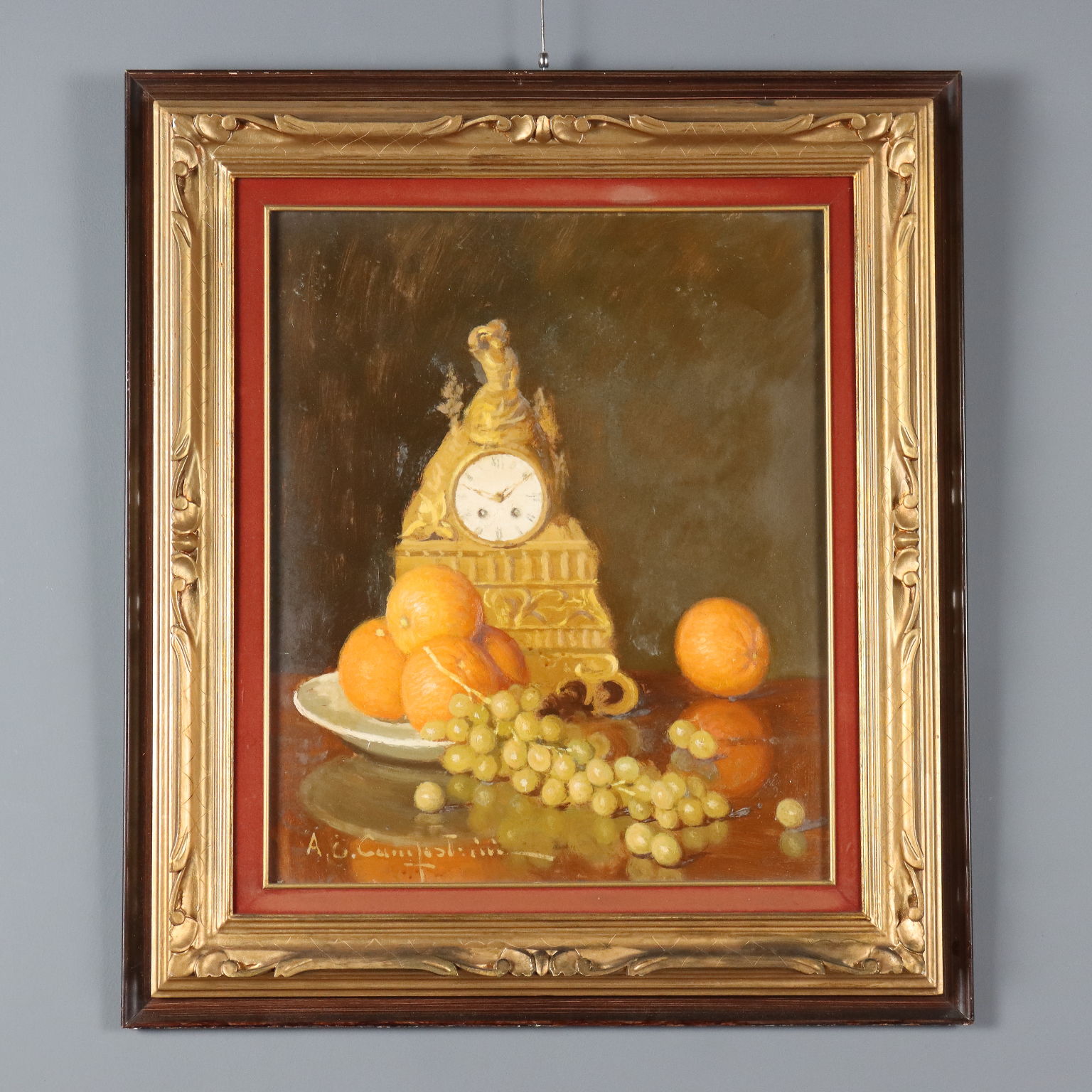 Öl auf Hartfaserplatte. Links unten signiert. Der Mailänder Künstler, Sohn des berühmten Malers Alcide Davide Campestrini, widmete sich Stillleben, Figurenmalerei und Alpenlandschaften und verwendete dabei eine Technik, die in der Schule seines Vaters und der Tradition des späten 19. Jahrhunderts verwurzelt war. Typisch für sein Werk ist die hier gezeigte Komposition, die verstreutes Obst – in diesem Fall Orangen und Trauben – einer eleganten, antiken Tischuhr gegenüberstellt. Das Gemälde wird in einem zeitgenössischen Rahmen (1960er-1970er Jahre) präsentiert.