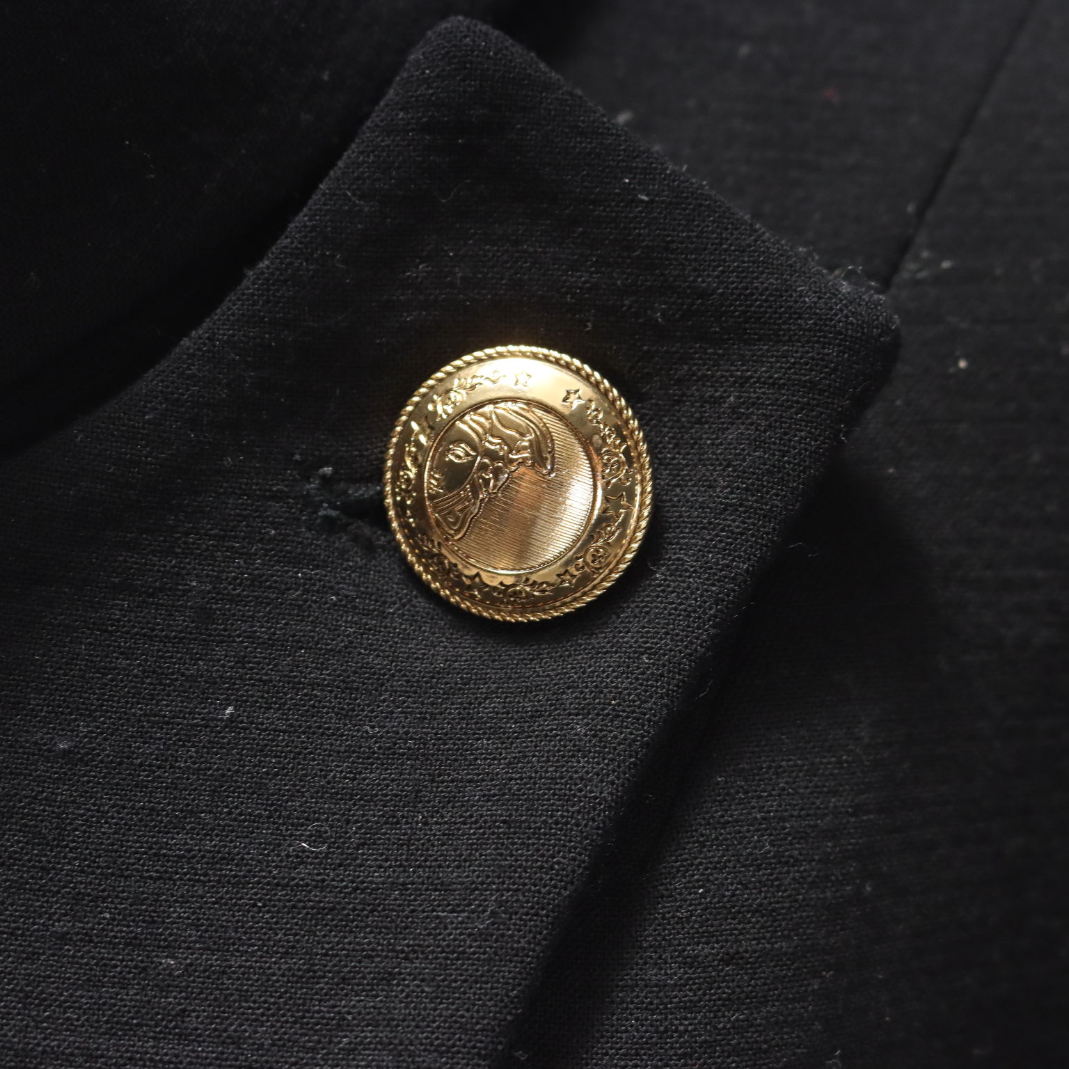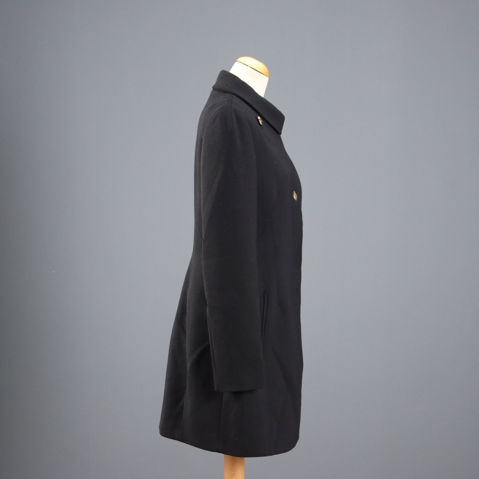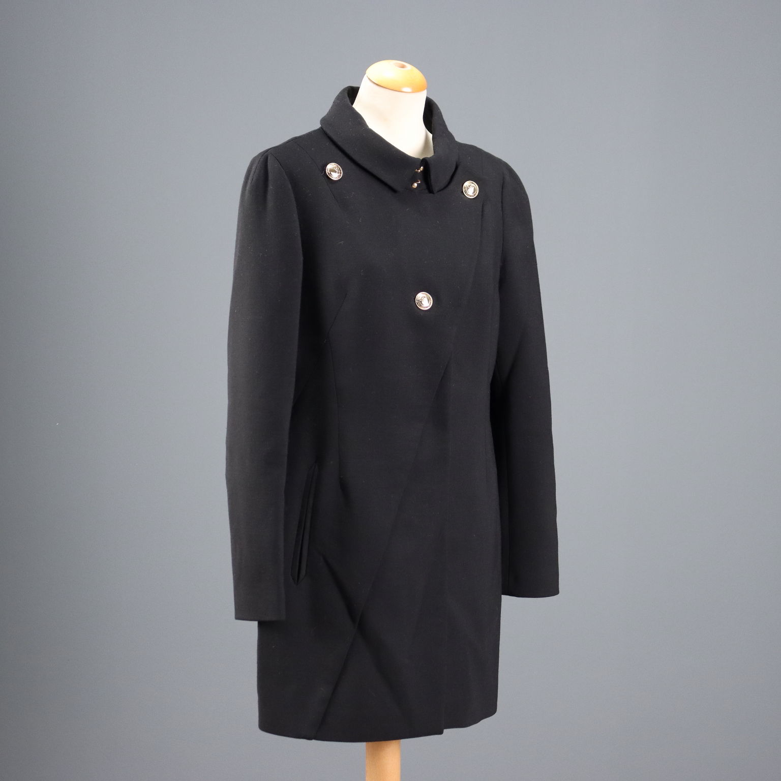 Gefütterter Mantel mit zwei Taschen und markanten Goldknöpfen mit dem Medusa-Emblem des Hauses und verdeckten Druckknöpfen. Länge: 86 cm. Schulterbreite: 42 cm. Ärmellänge: 65 cm. Armloch: 52 cm.