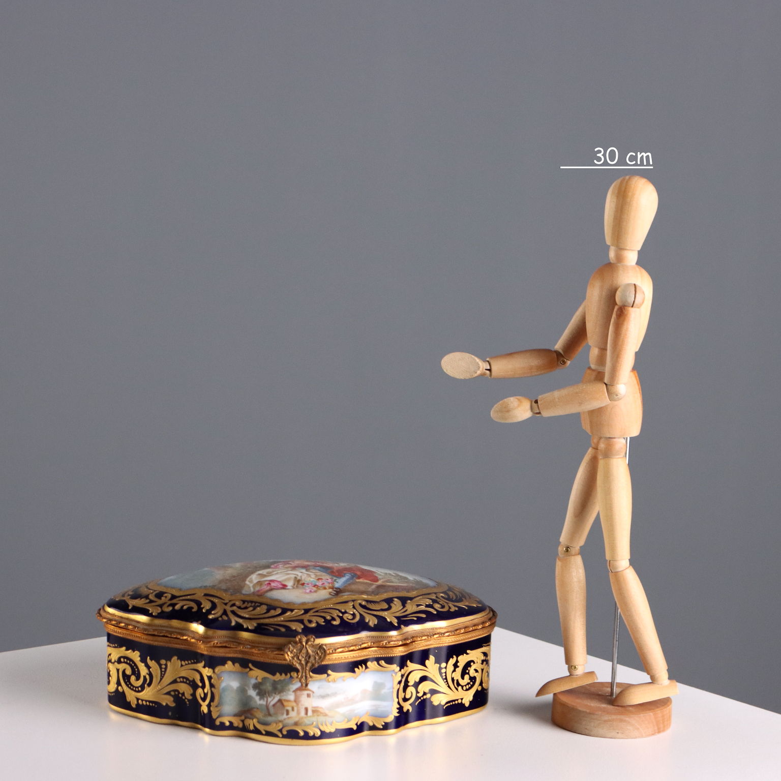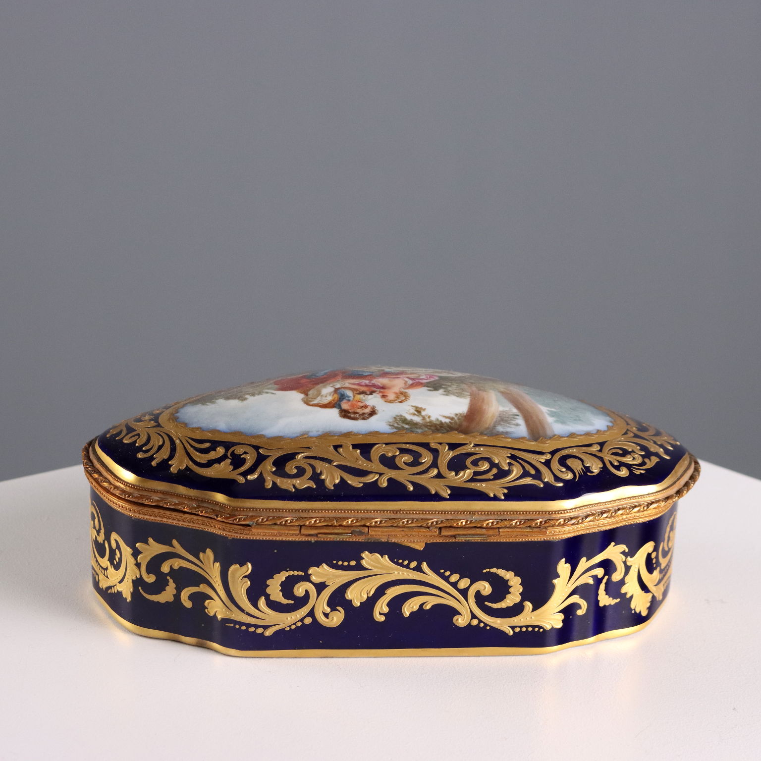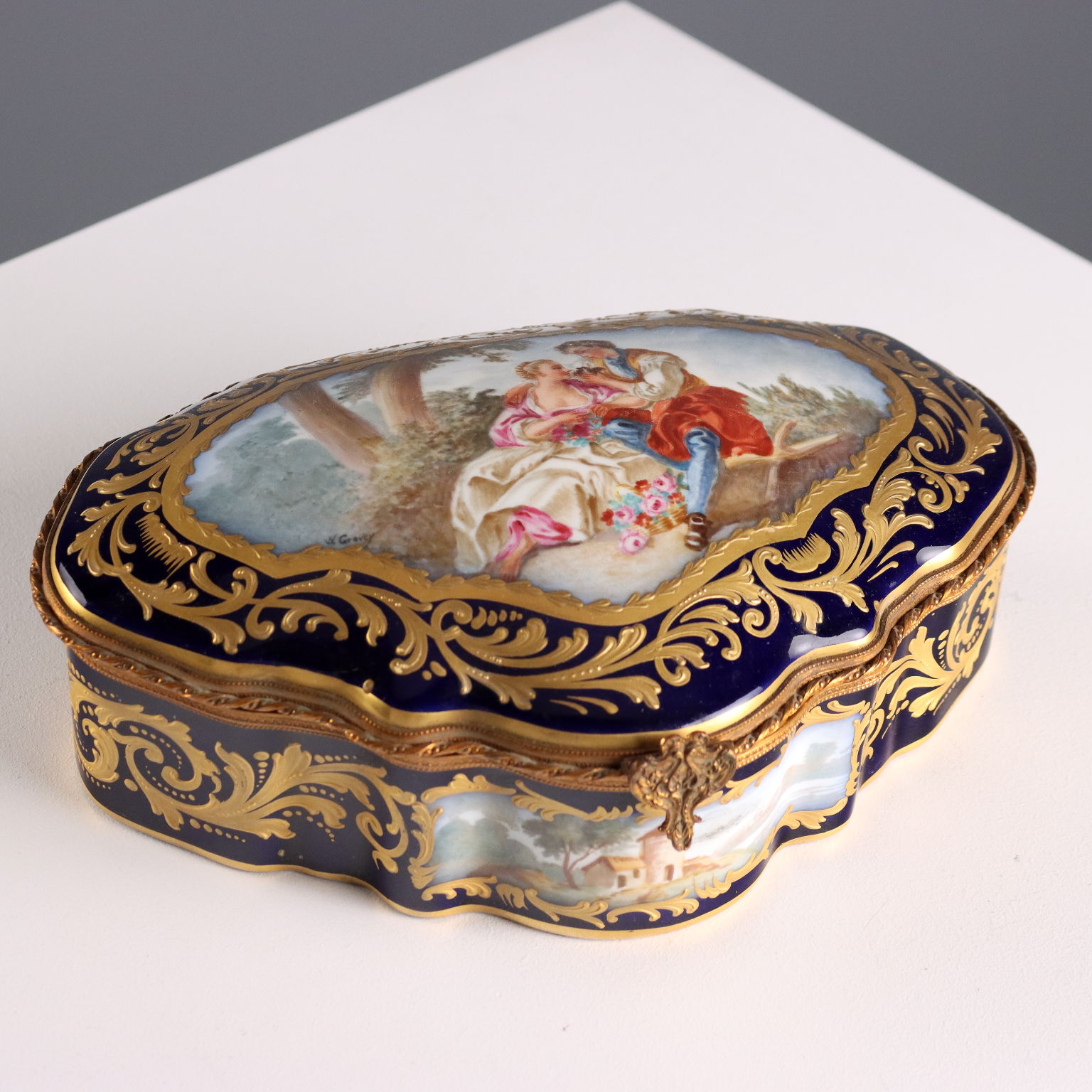 Kobaltblaue Porzellandose mit reichem Blattgold-Schnörkeldekor. Die Reserven zeigen Seelandschaften, der Deckel eine romantische Szene. Das Innere ist mit polychromen Blumensträußen verziert. Die Herstellermarke befindet sich unter dem Boden.