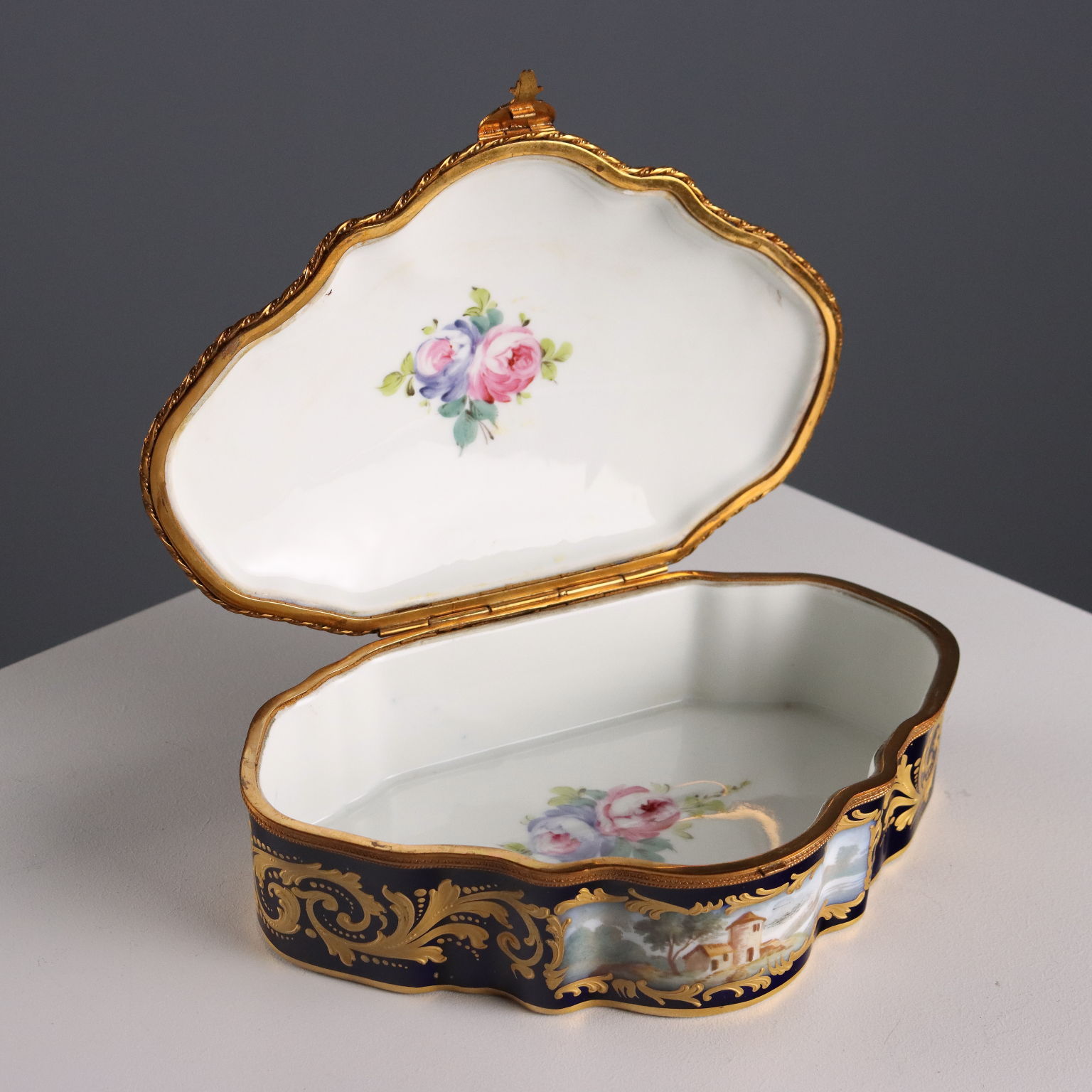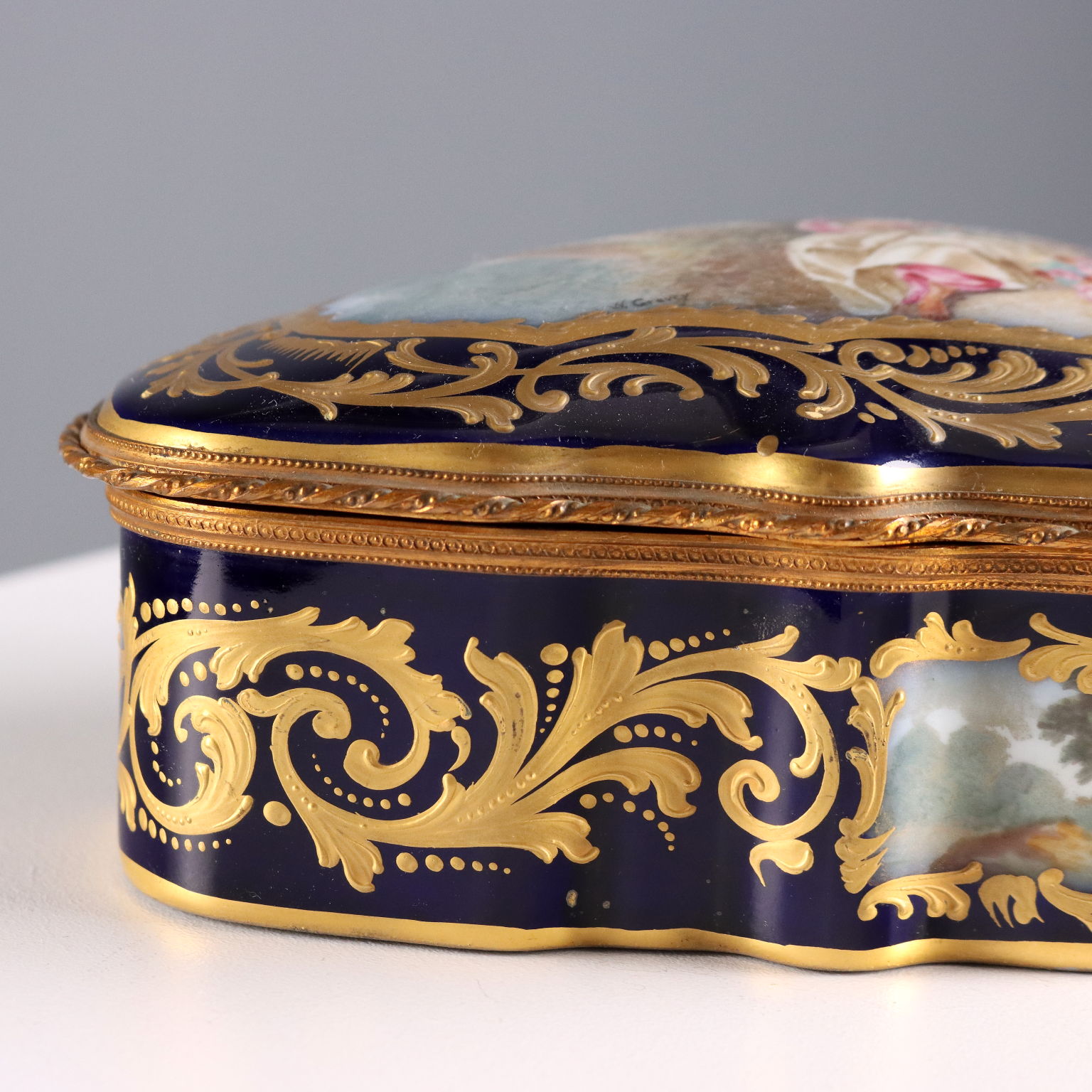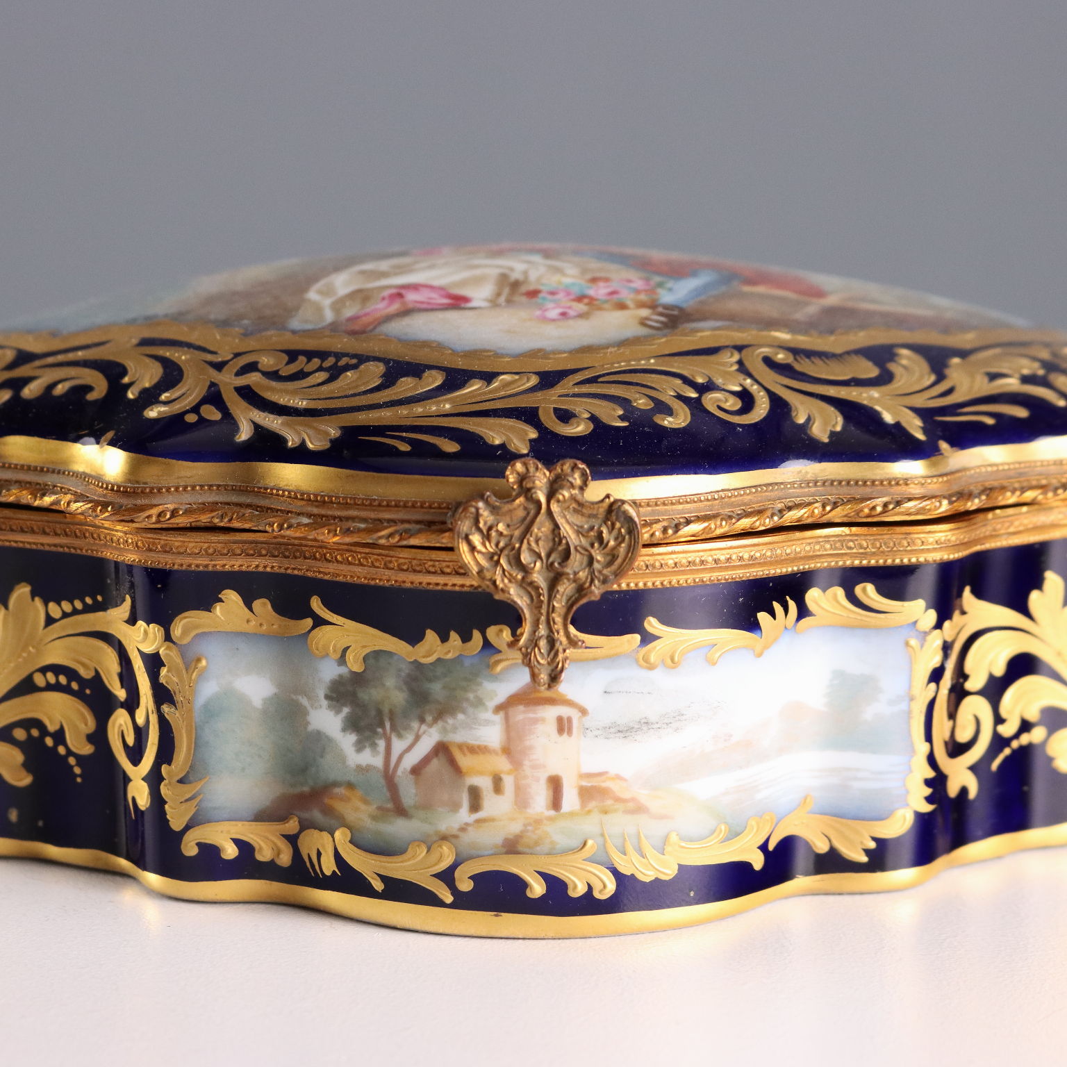 Kobaltblaue Porzellandose mit reichem Blattgold-Schnörkeldekor. Die Reserven zeigen Seelandschaften, der Deckel eine romantische Szene. Das Innere ist mit polychromen Blumensträußen verziert. Die Herstellermarke befindet sich unter dem Boden.