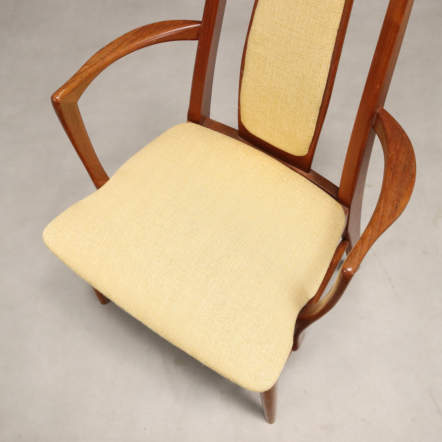Set aus sechs Vintage-Esszimmerstühlen, zwei mit Armlehnen, mit sichtbarem Holzrahmen, Sitz und Rückenlehne aus Stoff in Gelbtönen.