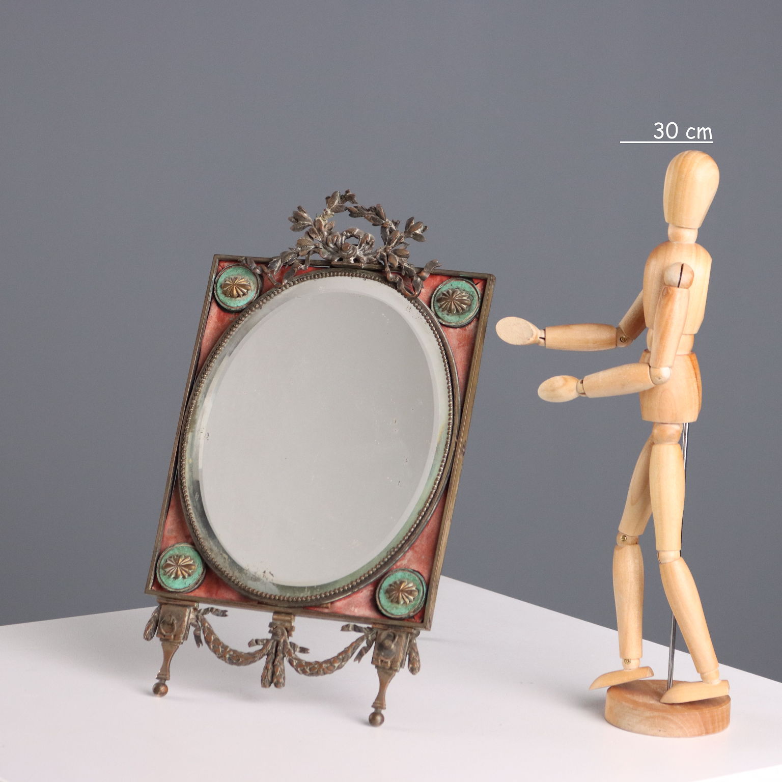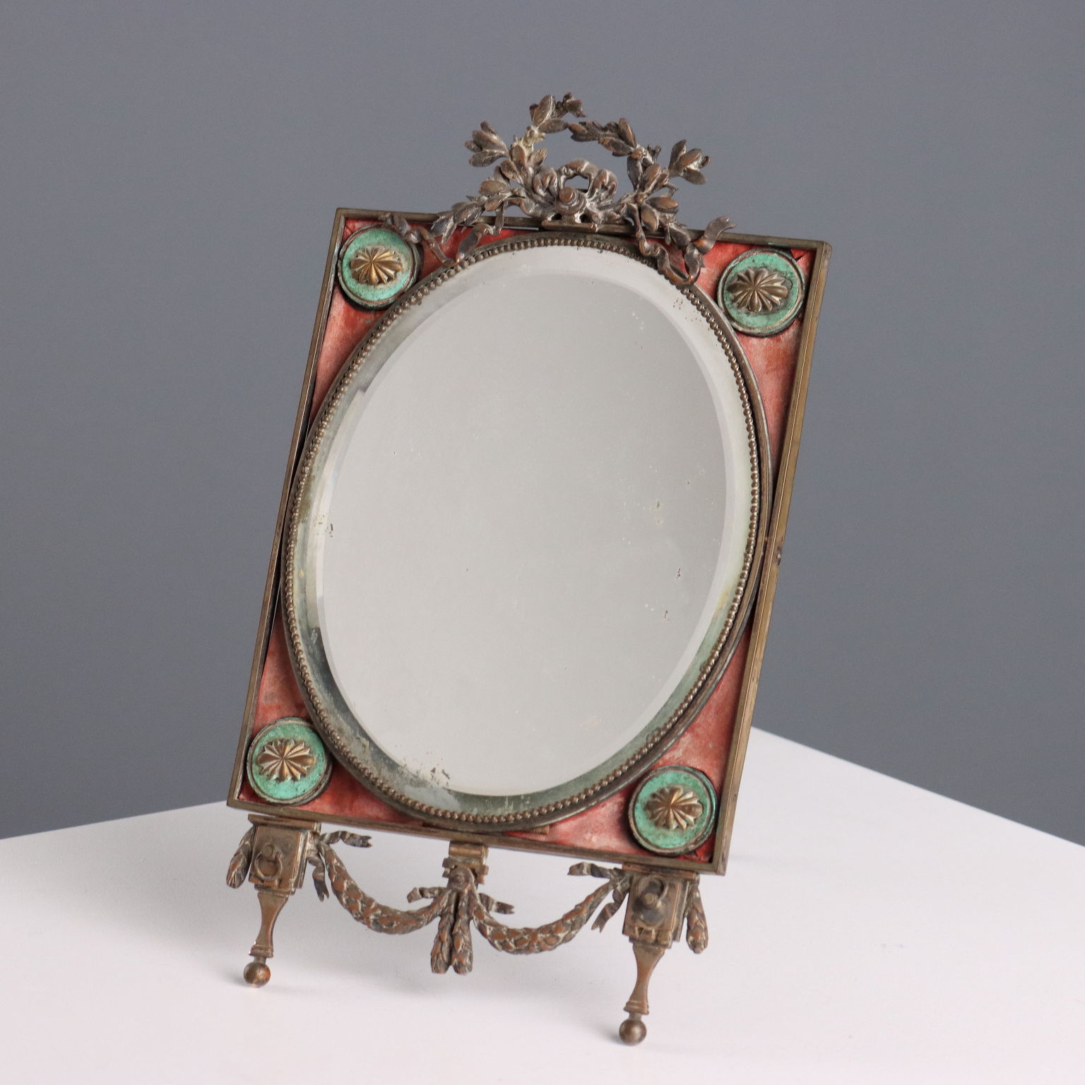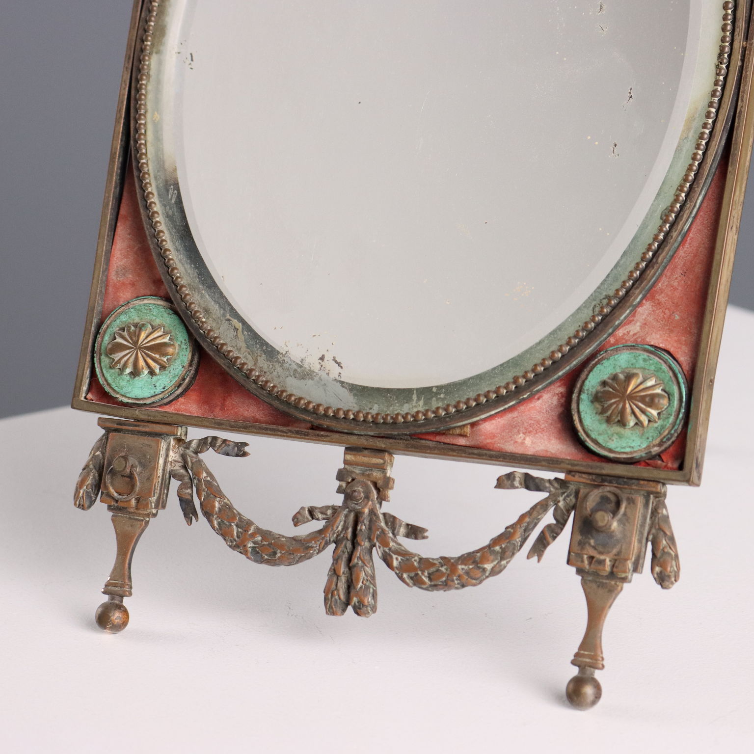 Ovaler Tischspiegel mit Facettenschliff in einem Bronzerahmen mit Girlandenverzierungen. Rosa bemalter Papierhintergrund und grüne Nieten.