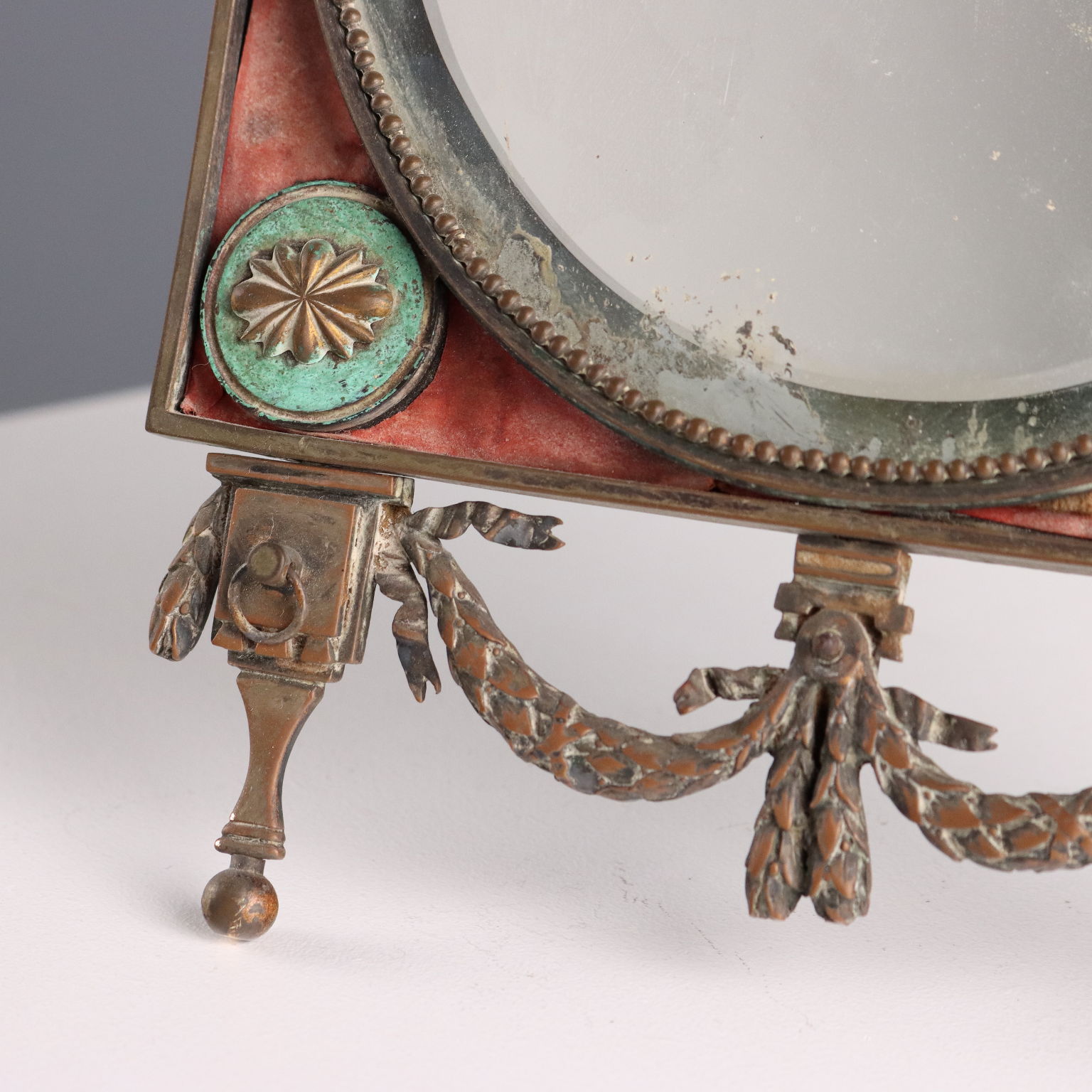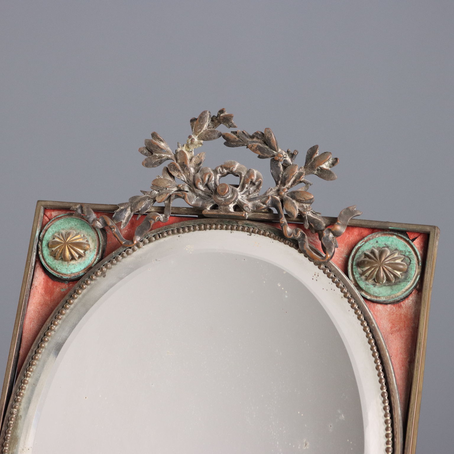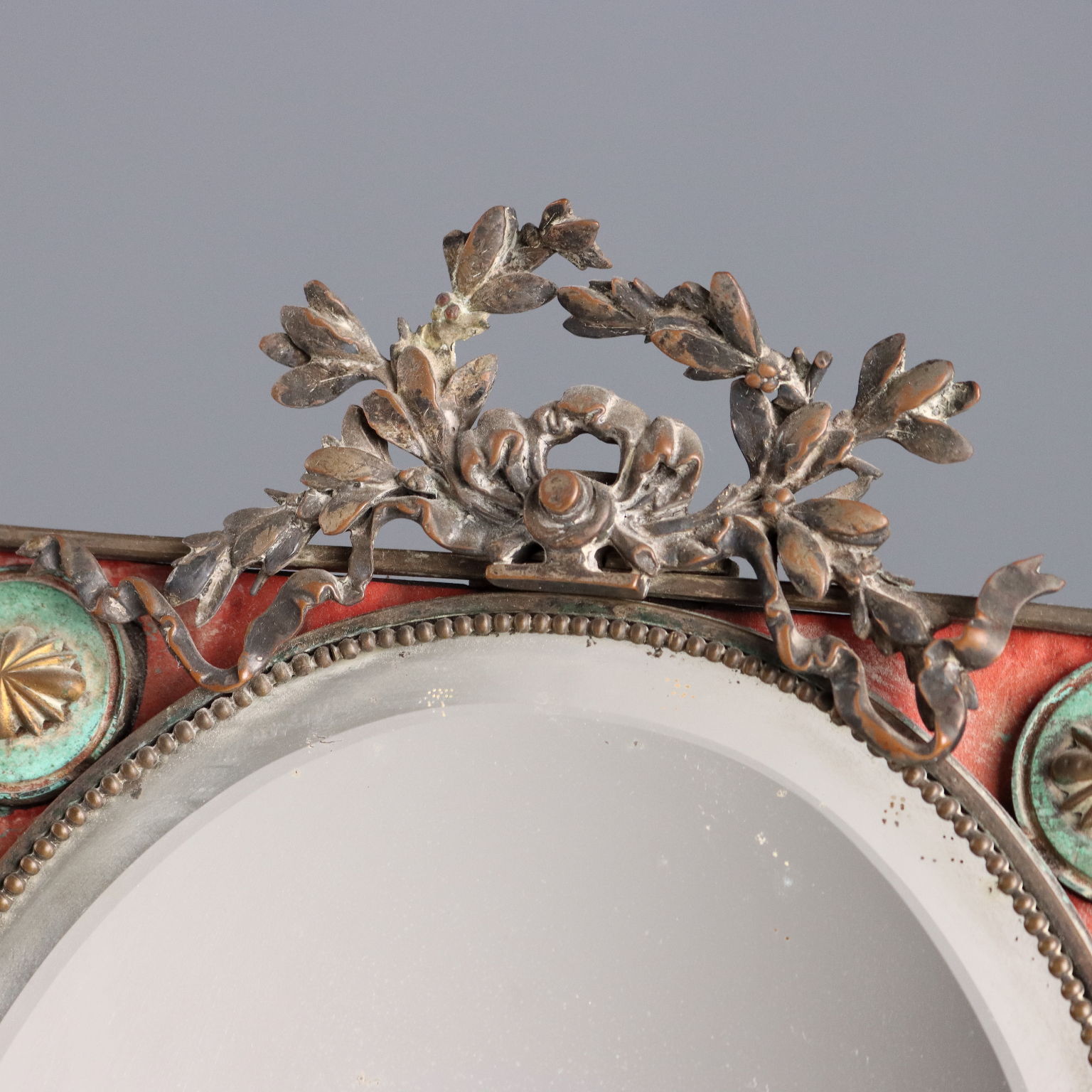 Ovaler Tischspiegel mit Facettenschliff in einem Bronzerahmen mit Girlandenverzierungen. Rosa bemalter Papierhintergrund und grüne Nieten.