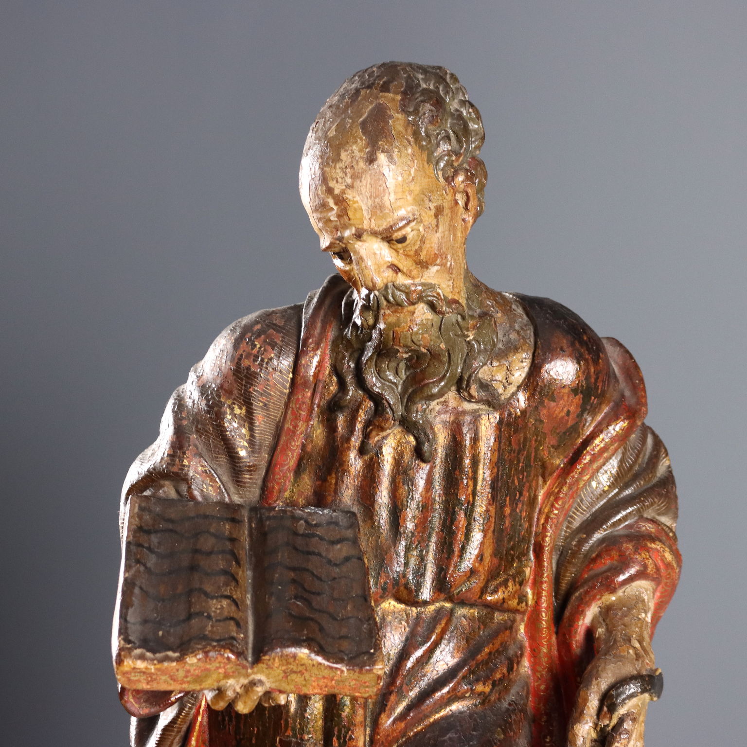 Die hier beschriebene Skulptur, die Anfang des 17. Jahrhunderts aus einem Block Zirbelkiefer geschnitzt wurde, stellt den Heiligen Bernhard von Clairvaux dar. Die Komposition erinnert an einen Stich von Marcantonio Raimondi aus dem frühen 16. Jahrhundert, der den Heiligen in Mönchstracht darstellt, mit einem Bischofsstab und einer Bibel in der Hand. Zu seinen Füßen liegt ein Dämon in Ketten. Die Skulptur war für eine Nische bestimmt und daher auf der Rückseite unvollendet. Der stehende Heilige ist in leichter Bewegung dargestellt, in seiner rechten Hand hält er eine offene Bibel und in der anderen den Anfang der Kette, die den Dämon zu seinen Füßen fesselt. Leider fehlt der mittlere Teil der Kette, wird aber durch ein Halsband vervollständigt; der Dämon wird vom Heiligen, der seinen Fuß darauf abstellt, bezwungen. Obwohl die Farben und die Vergoldung einige Lücken und Ruß aufweisen, können wir erkennen, dass die Gesichtsfarbe des Heiligen rosig ist, während die des Dämons aufgrund der Flammen der Hölle rötlich, fast braun, ist. Beachten Sie das prächtige Gewand des Heiligen, das zwar eine Mönchstracht darstellt, innen jedoch in Rottönen mit Goldstickerei und außen in Gold mit bläulicher Stickerei lackiert ist. Das Gewand ist nicht mehr das des bescheidenen Einsiedlers, sondern das des Heiligen in himmlischer Pracht, in Licht getaucht, in schärferem Kontrast zur Gestalt des Teufels.