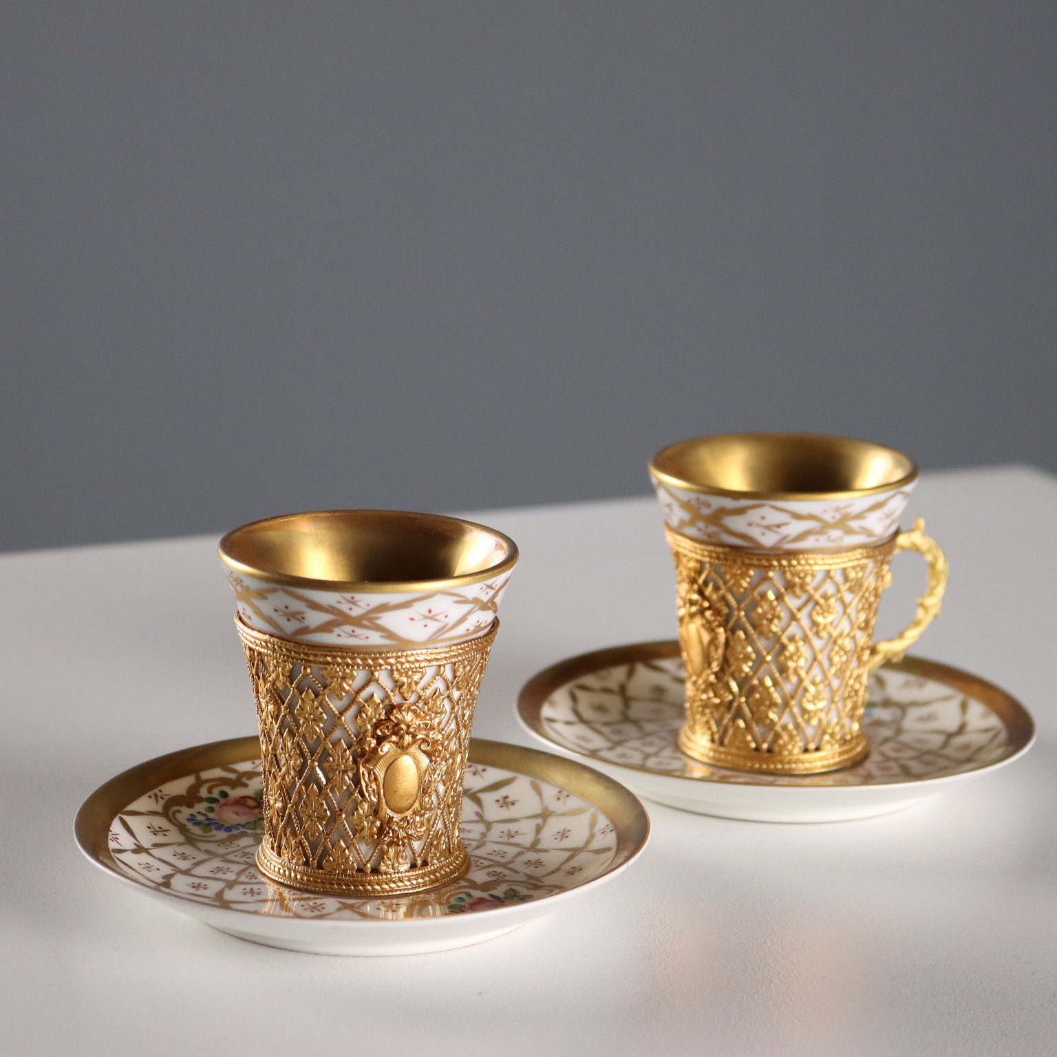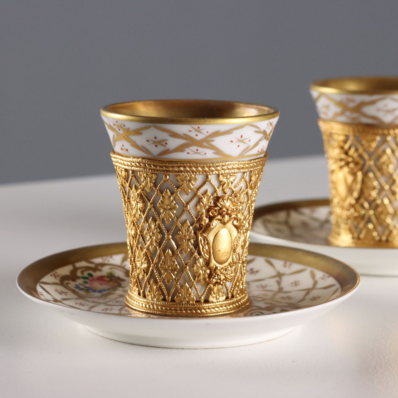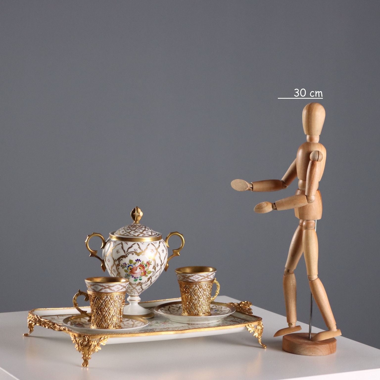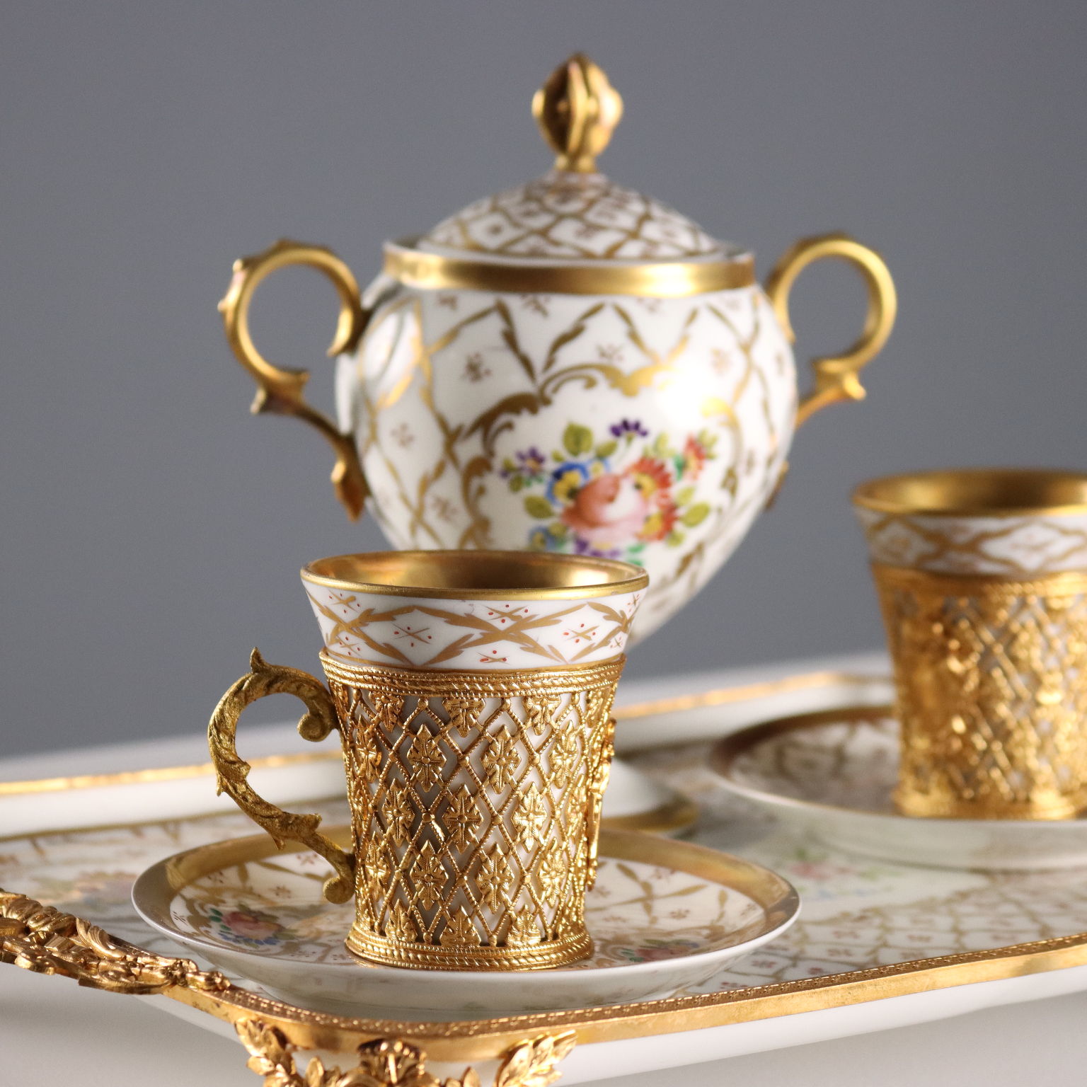 Tête-à-Tête-Service aus Limoges-Porzellan, bestehend aus einem Tablett, zwei Tassen mit Untertassen und einer Zuckerdose. Das Service besteht aus Messing und weißem Porzellan und ist mit Gold und bunten Blumensträußen in den Reserven verziert. Die Sockel tragen die Herstellermarke.