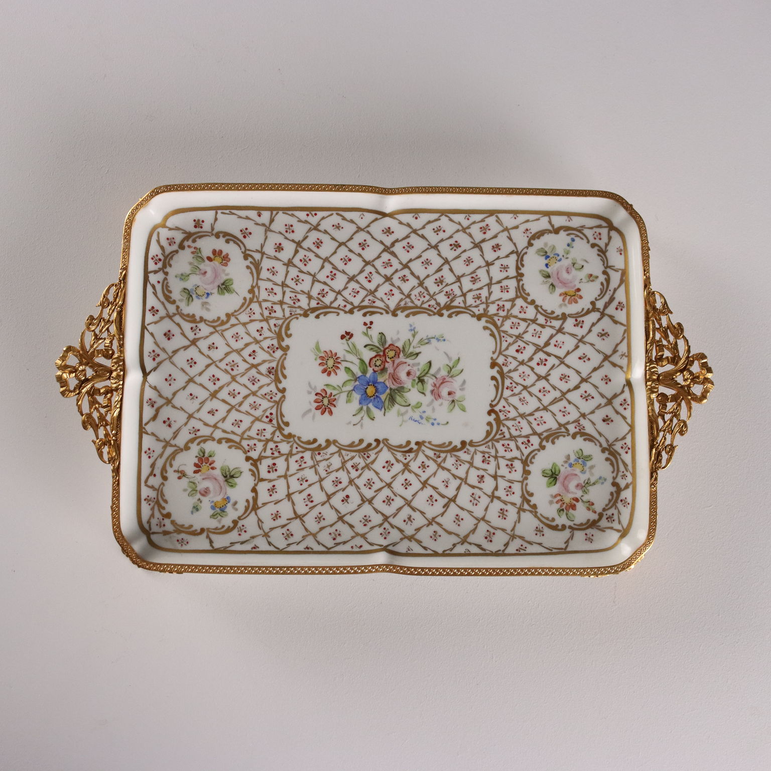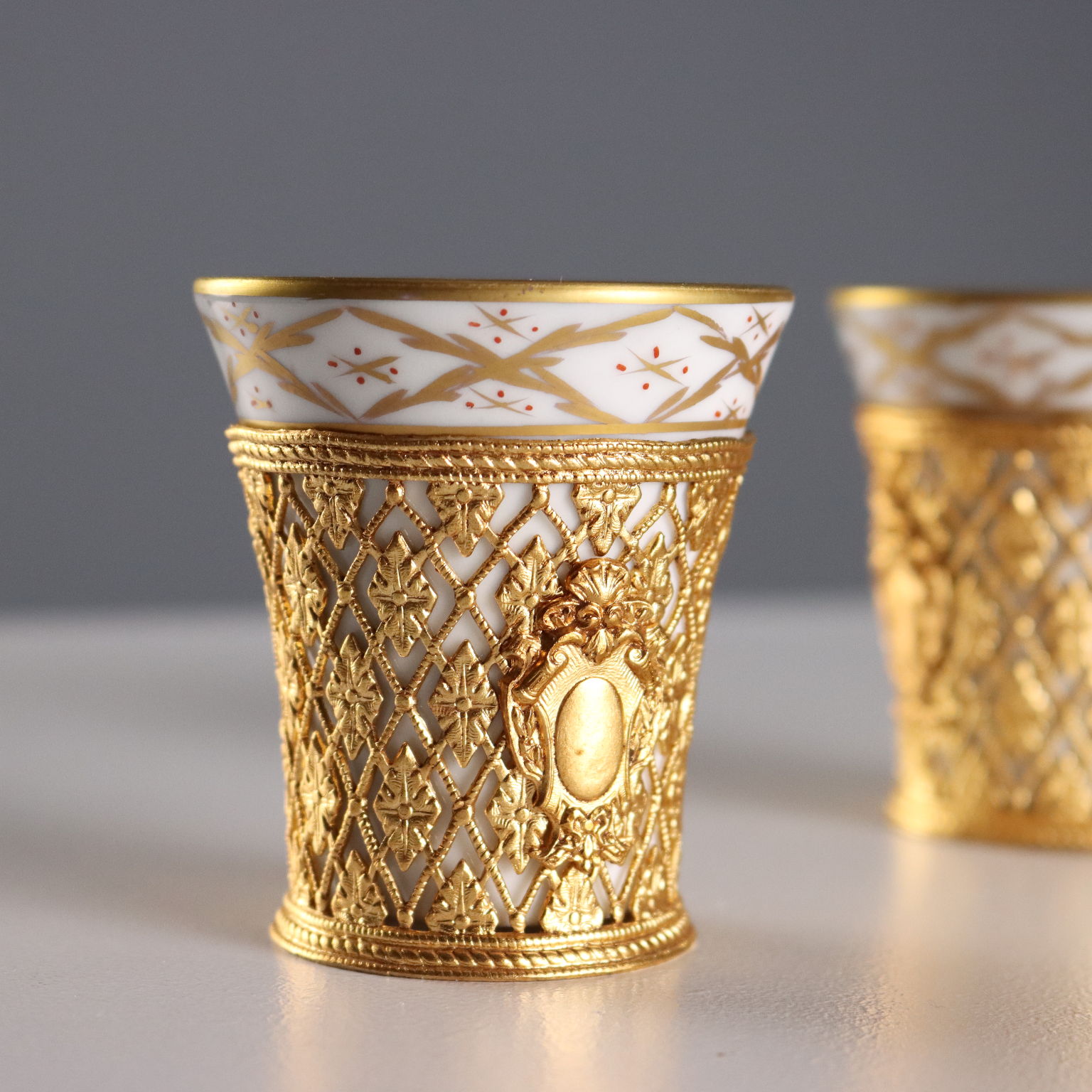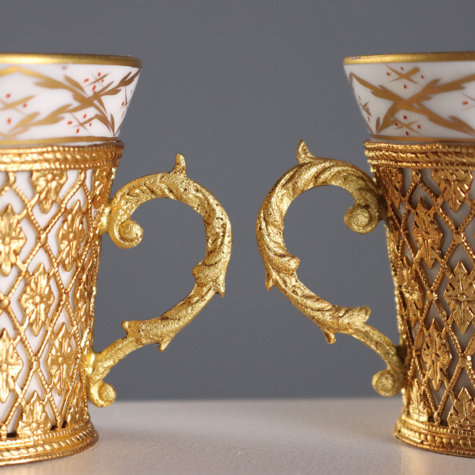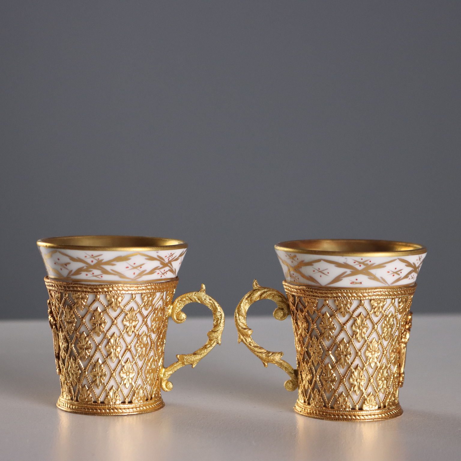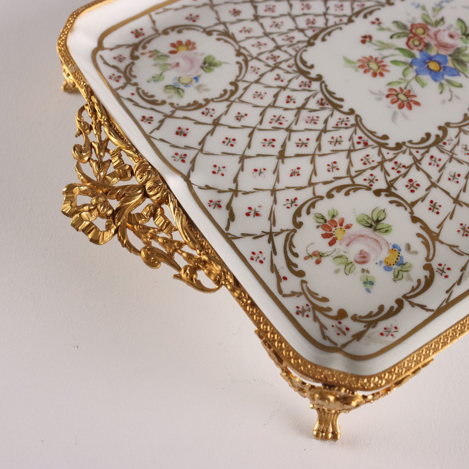 Tête-à-Tête-Service aus Limoges-Porzellan, bestehend aus einem Tablett, zwei Tassen mit Untertassen und einer Zuckerdose. Das Service besteht aus Messing und weißem Porzellan und ist mit Gold und bunten Blumensträußen in den Reserven verziert. Die Sockel tragen die Herstellermarke.