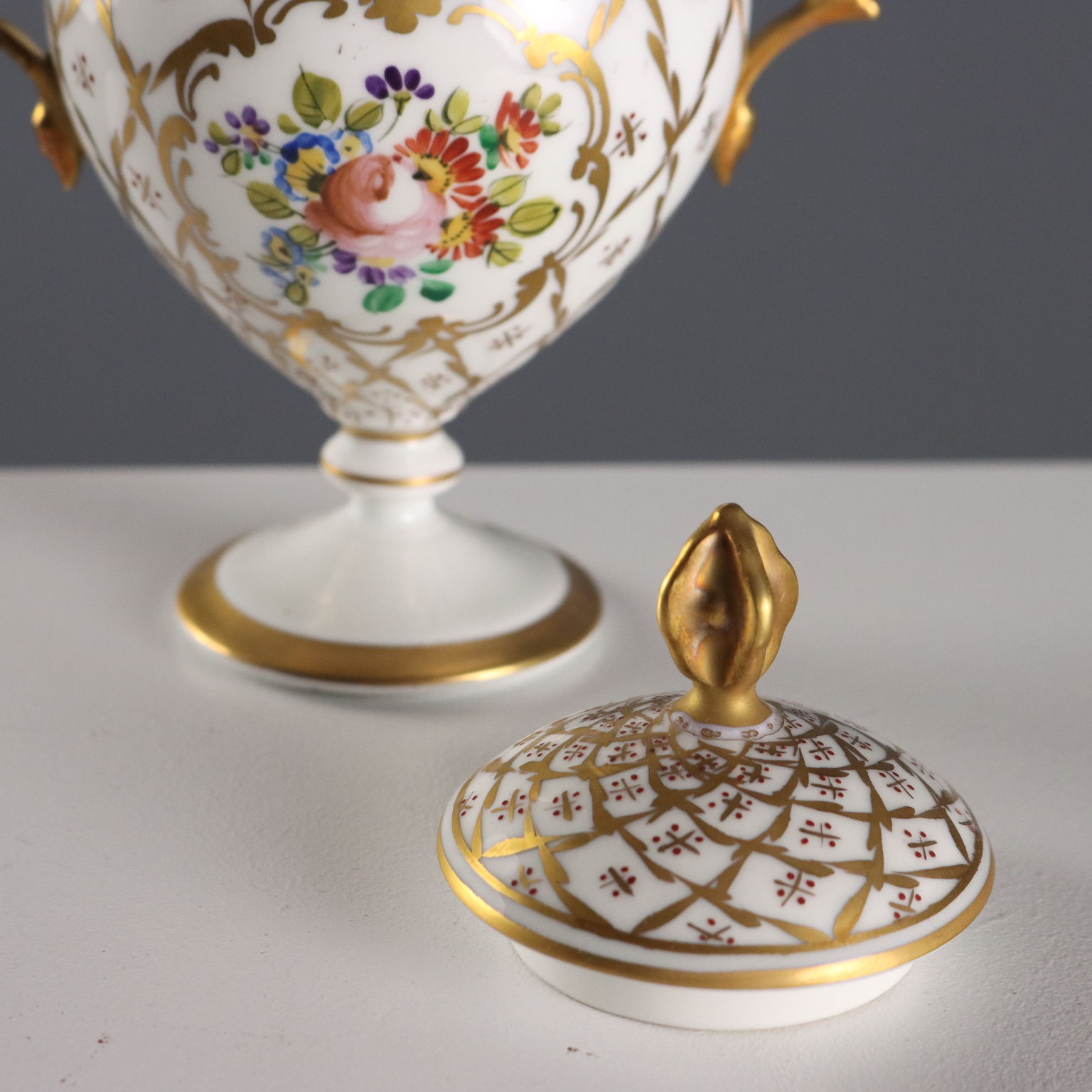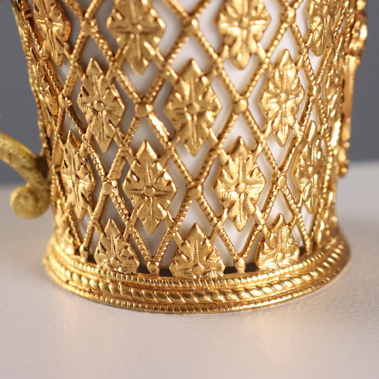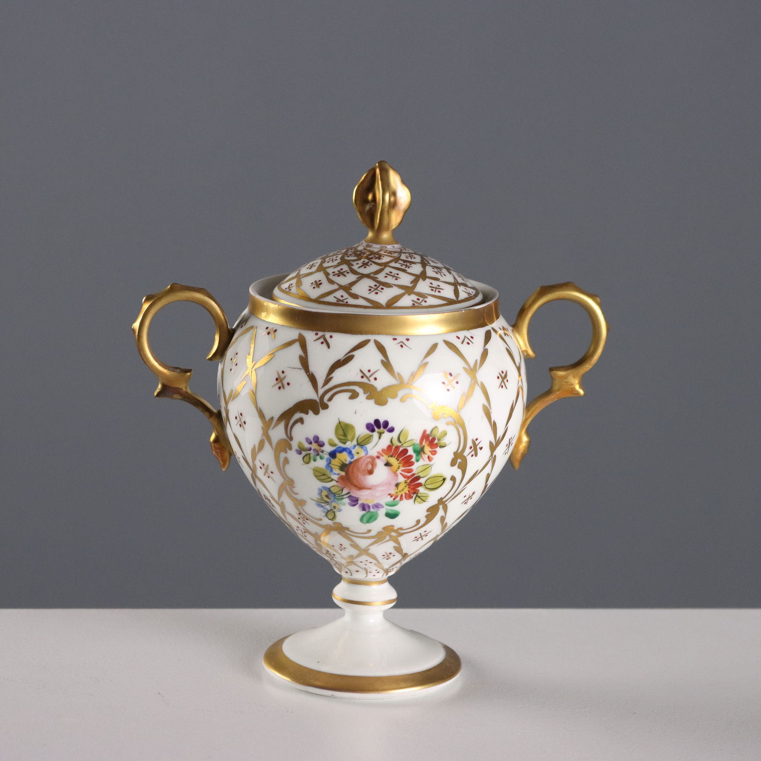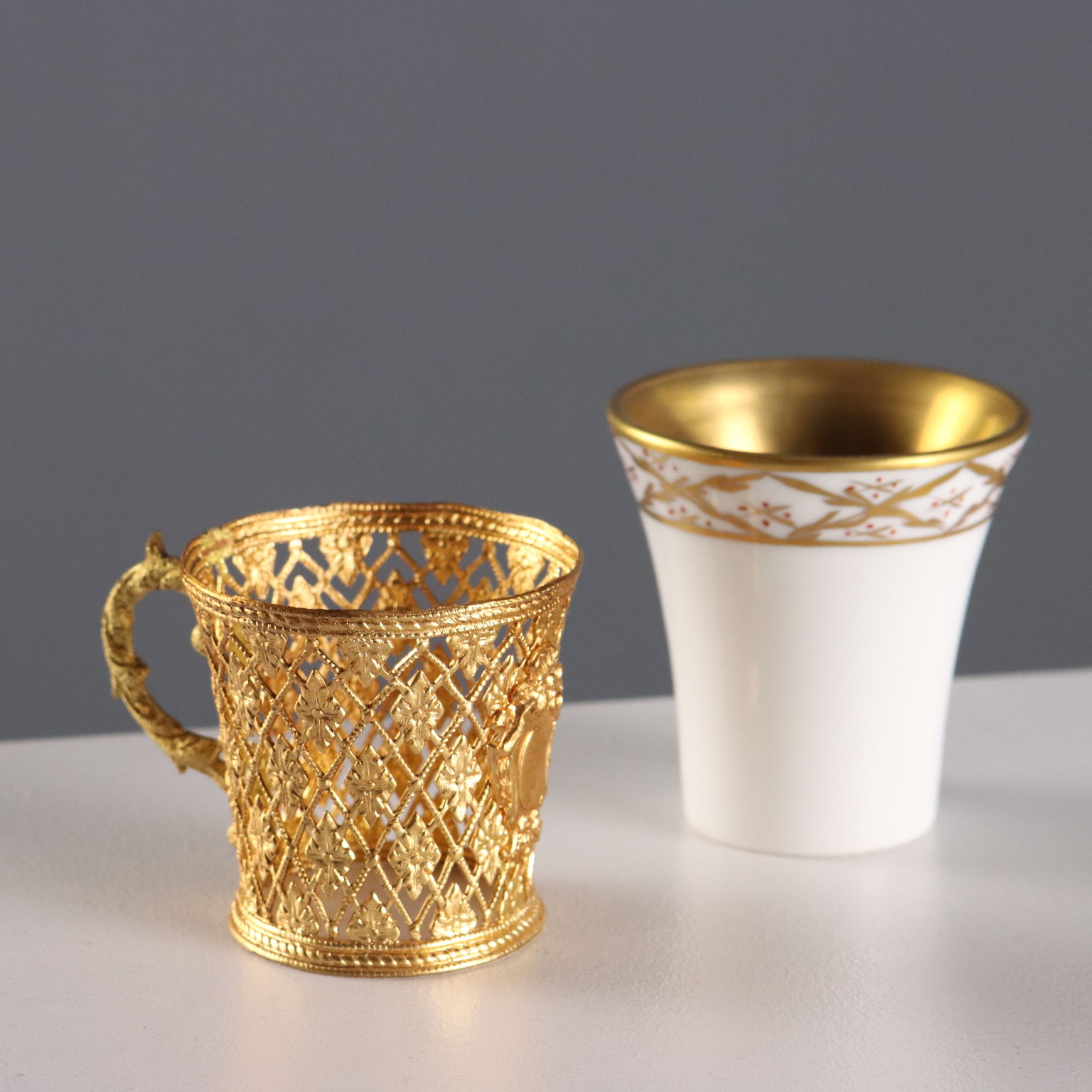 Tête-à-Tête-Service aus Limoges-Porzellan, bestehend aus einem Tablett, zwei Tassen mit Untertassen und einer Zuckerdose. Das Service besteht aus Messing und weißem Porzellan und ist mit Gold und bunten Blumensträußen in den Reserven verziert. Die Sockel tragen die Herstellermarke.