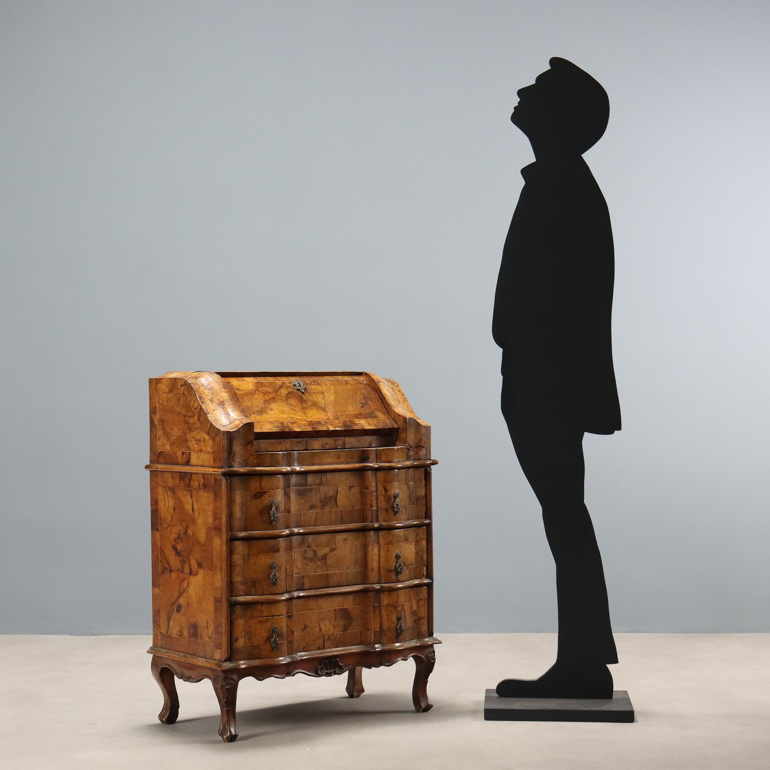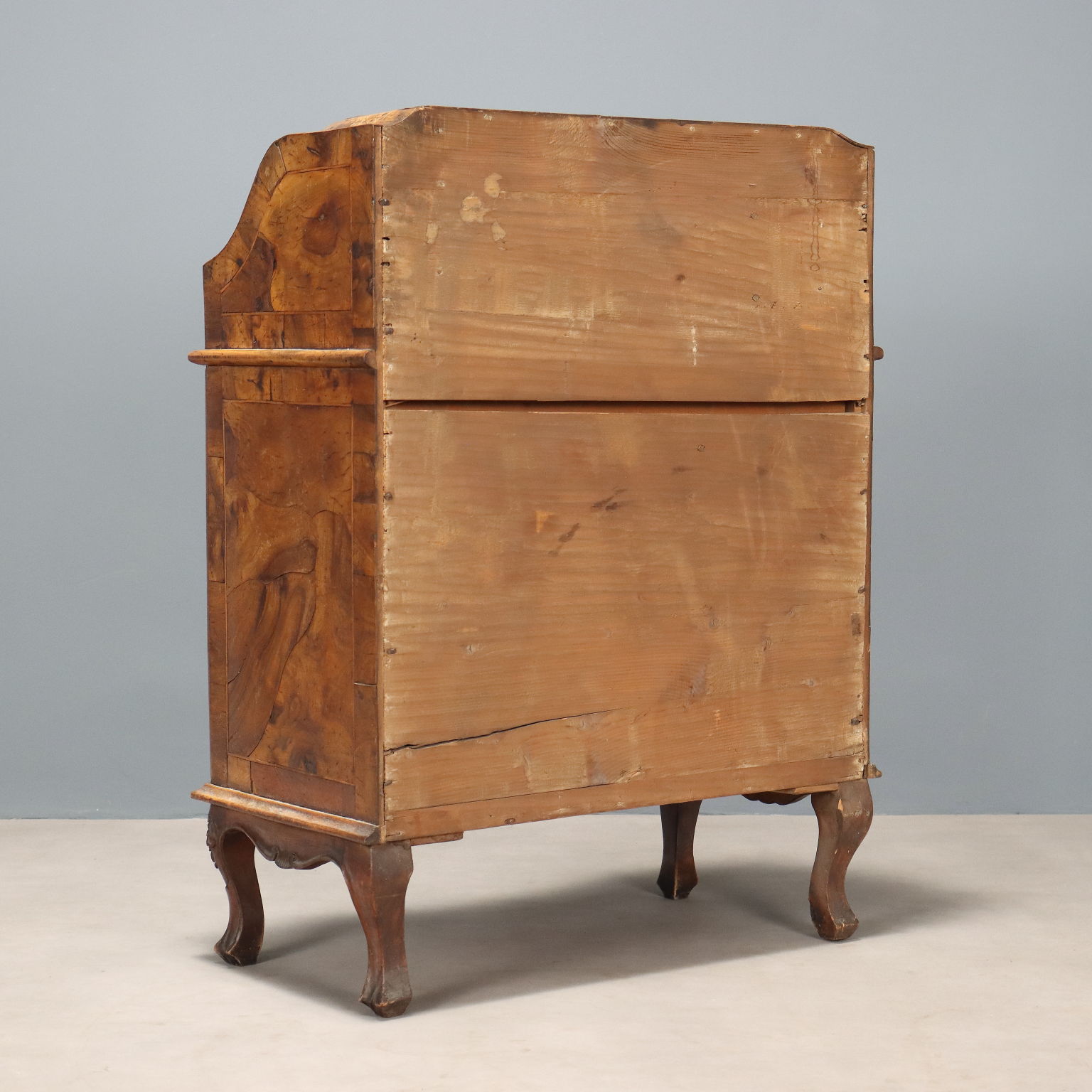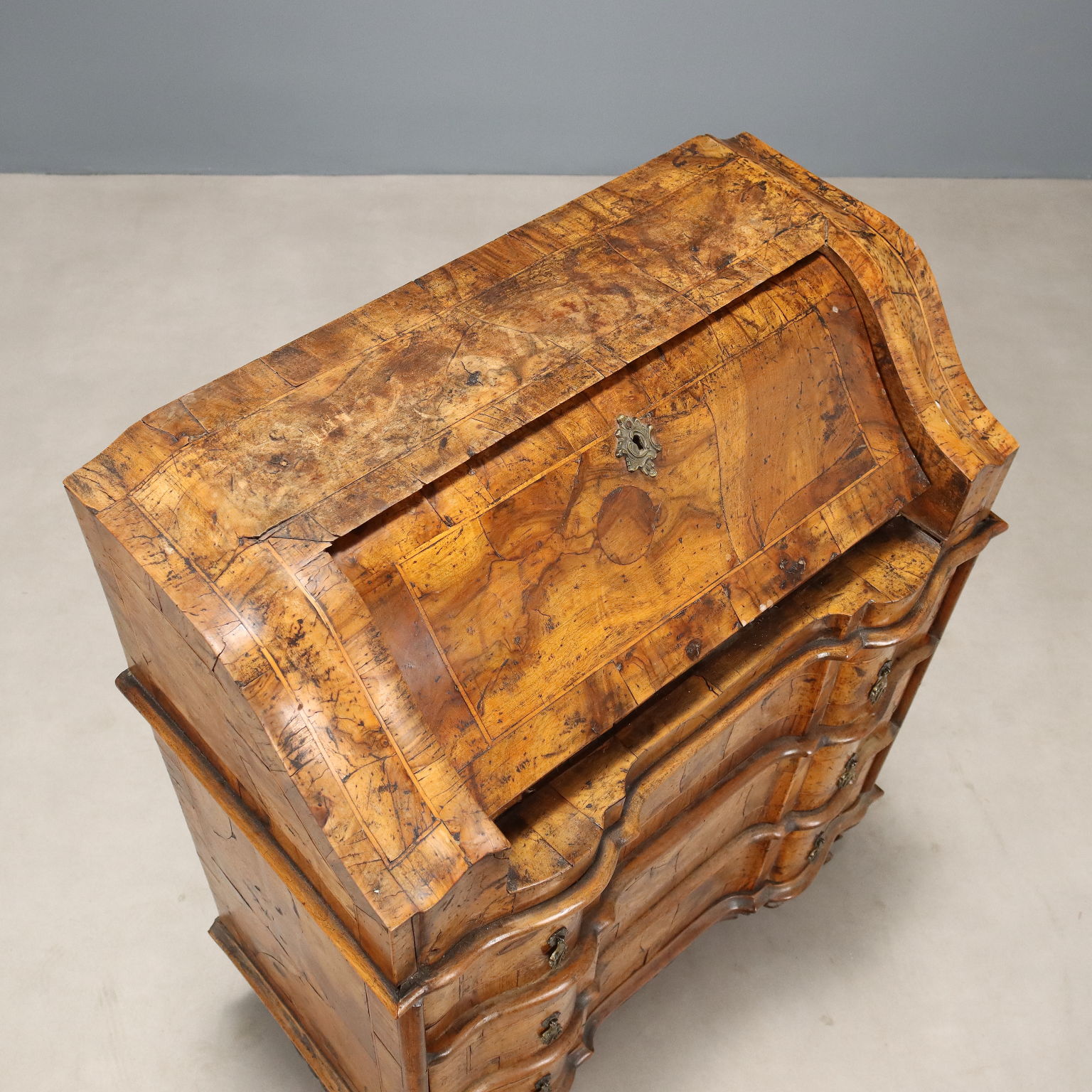 Nussbaumfurnier, geschwungene Front mit drei Schubladen, Klapptür, hinter der sich ein Schrank mit vier Schubladen und eine Mitteltür verbirgt. Geschwungene, geschnitzte Füße. Italien, 20. Jahrhundert.