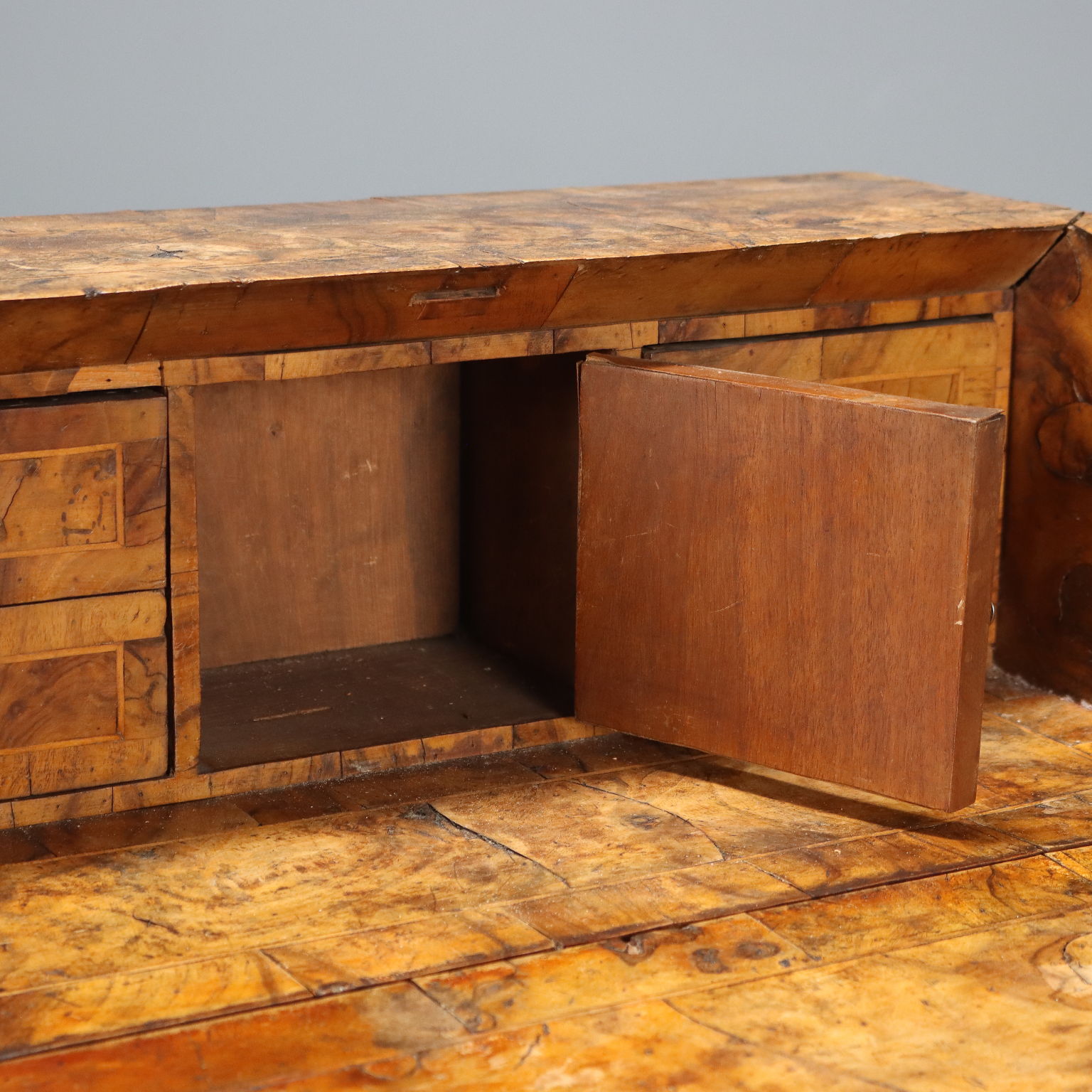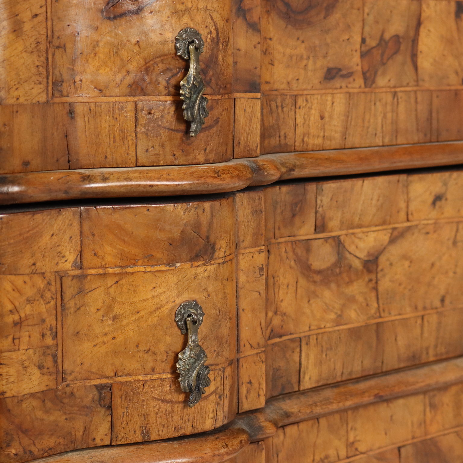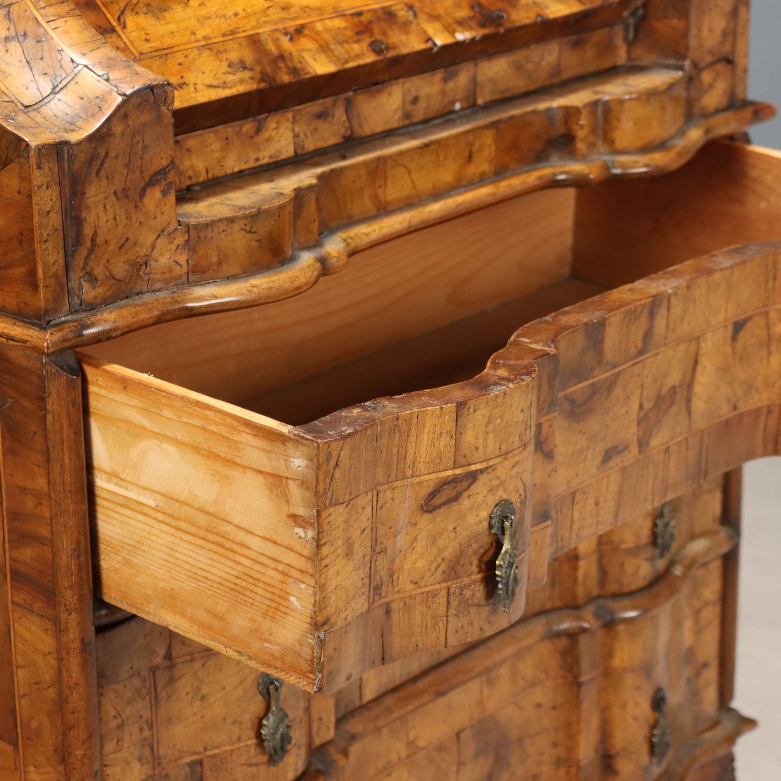 Nussbaumfurnier, geschwungene Front mit drei Schubladen, Klapptür, hinter der sich ein Schrank mit vier Schubladen und eine Mitteltür verbirgt. Geschwungene, geschnitzte Füße. Italien, 20. Jahrhundert.