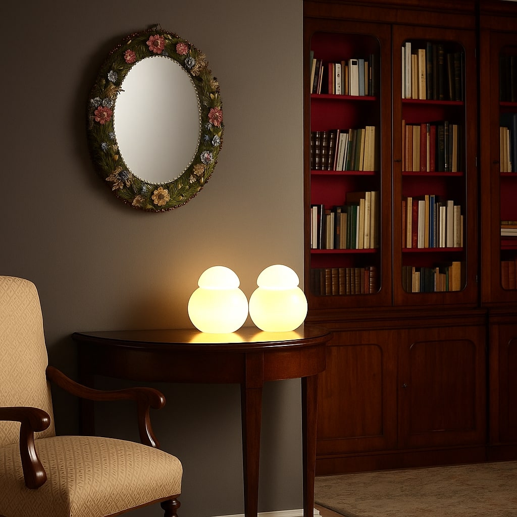 Zwei Tischlampen, bestehend aus einer kugelförmigen Vase, über der eine kleine Kuppel steht.