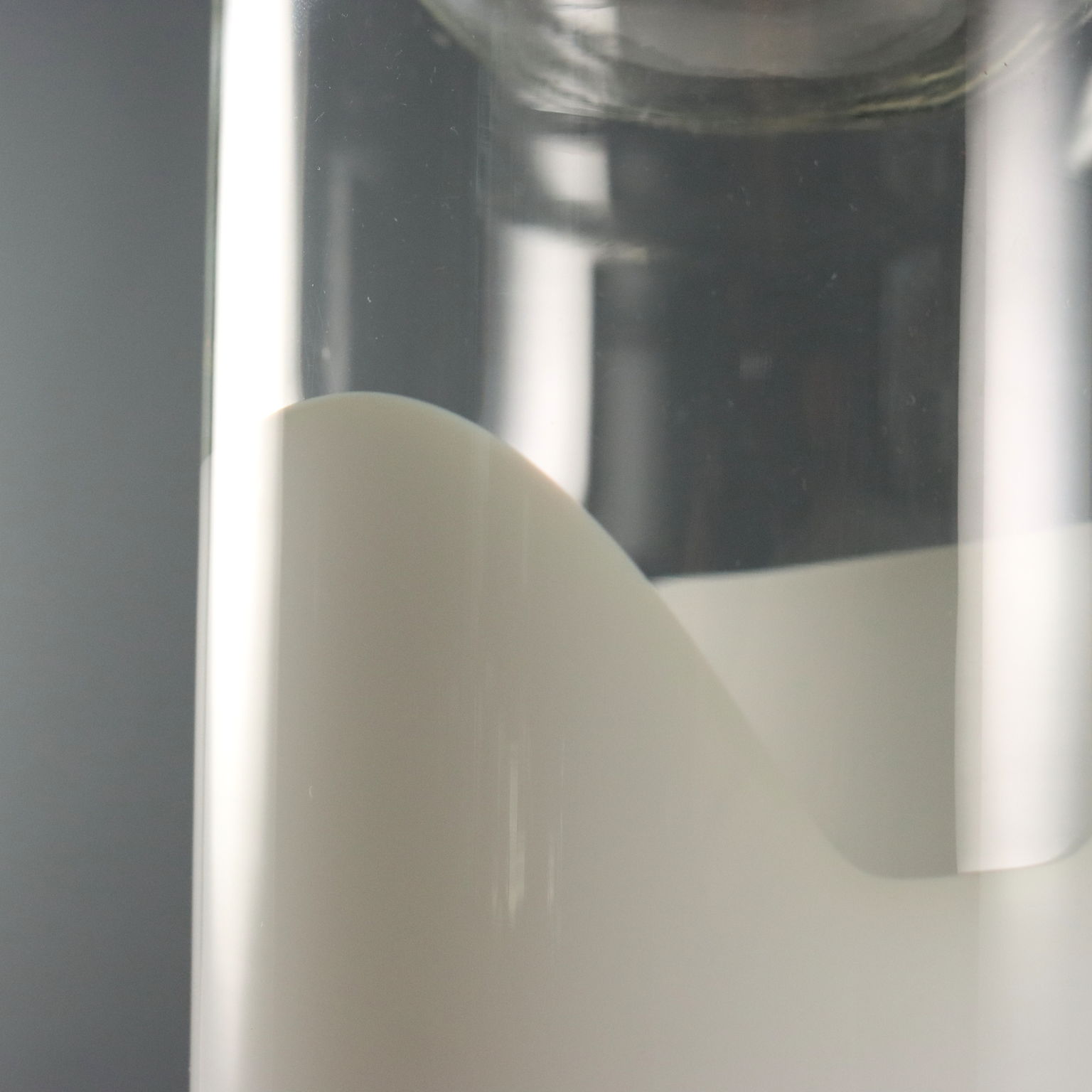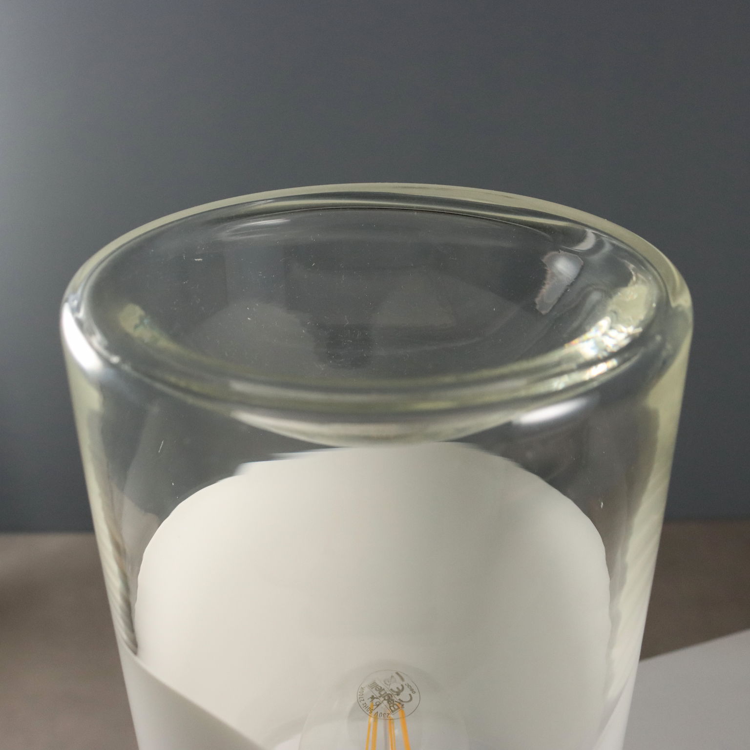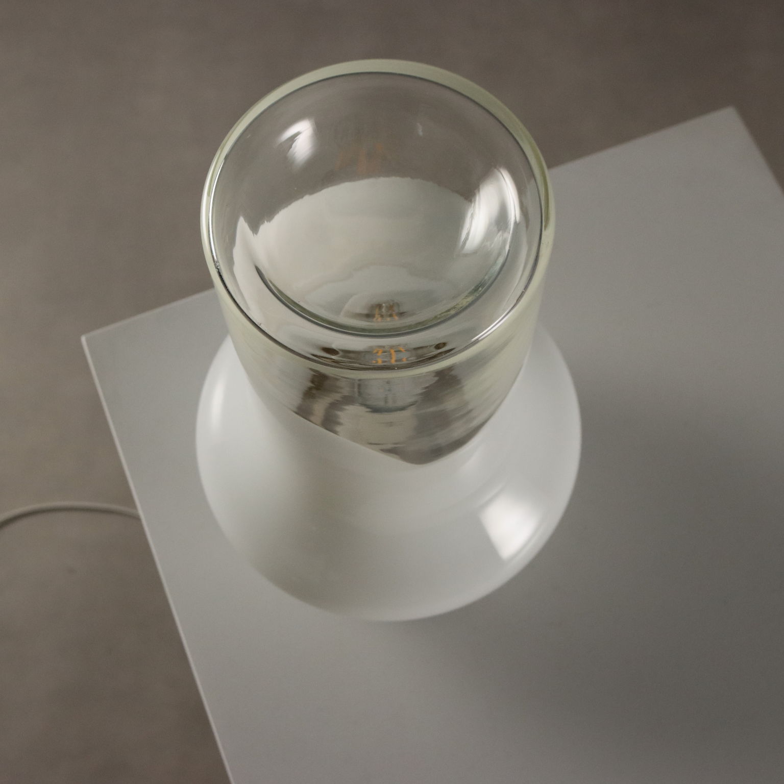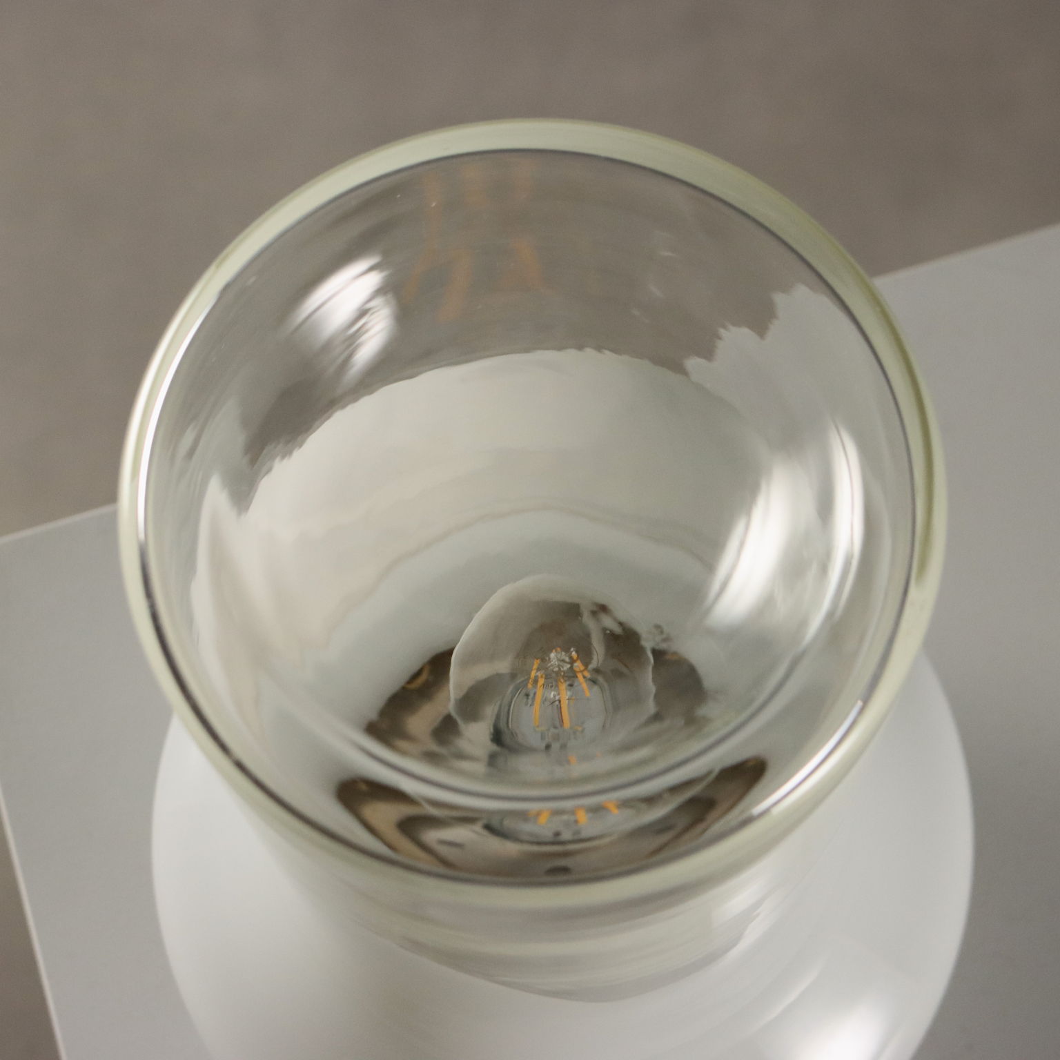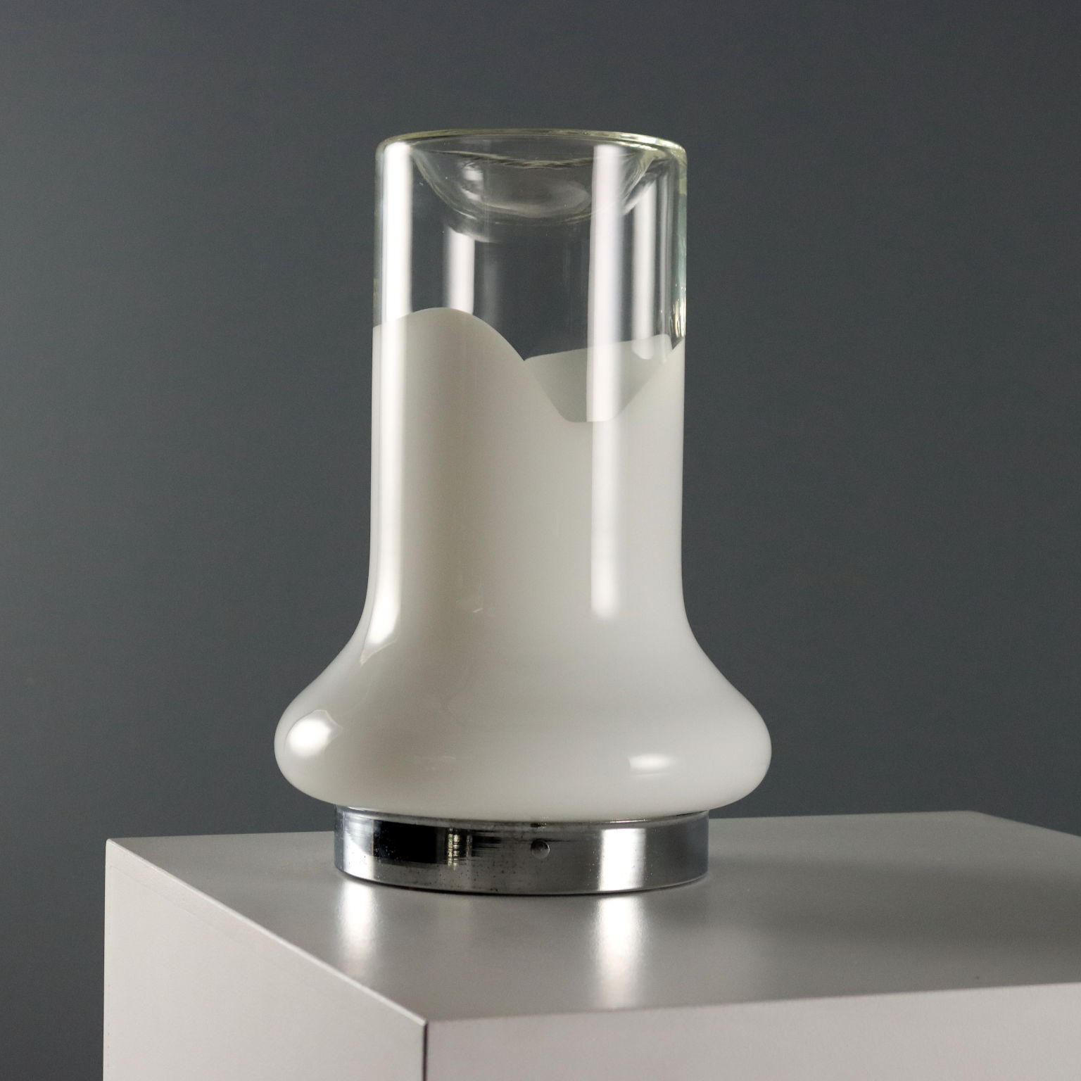 Vintage-Tischleuchte aus klarem und milchig-weißem Muranoglas. Sie verfügt über eine E27-Glühbirne.