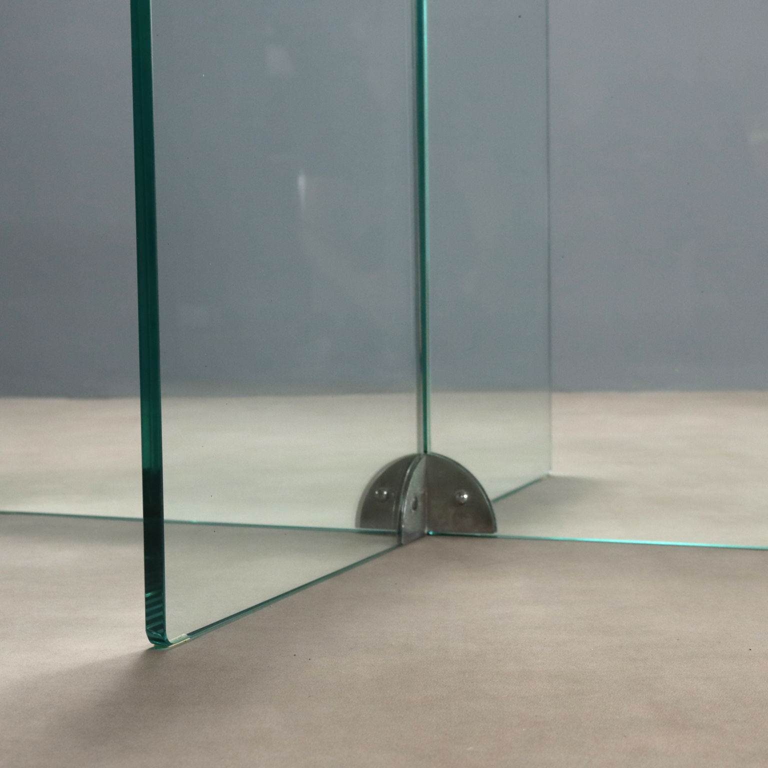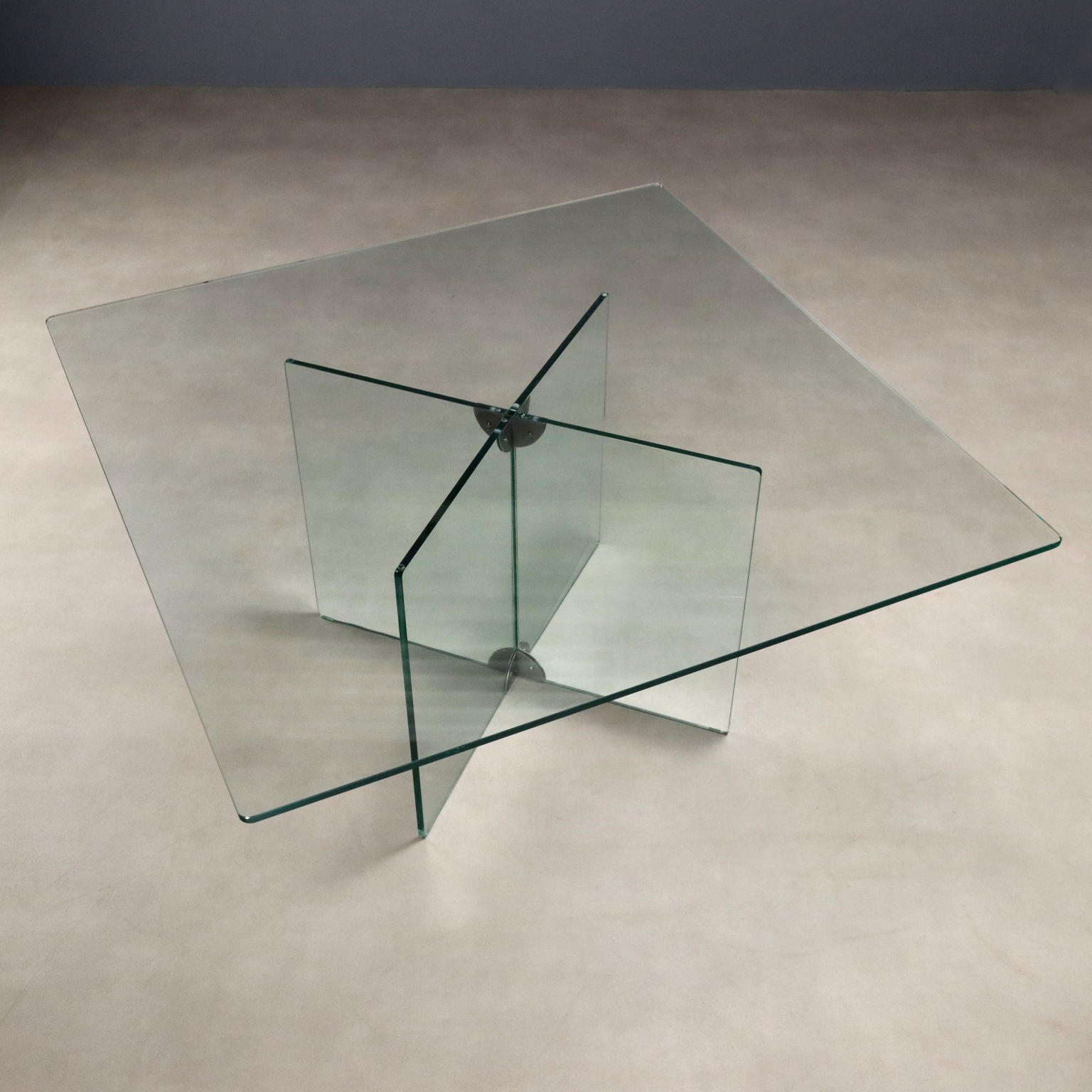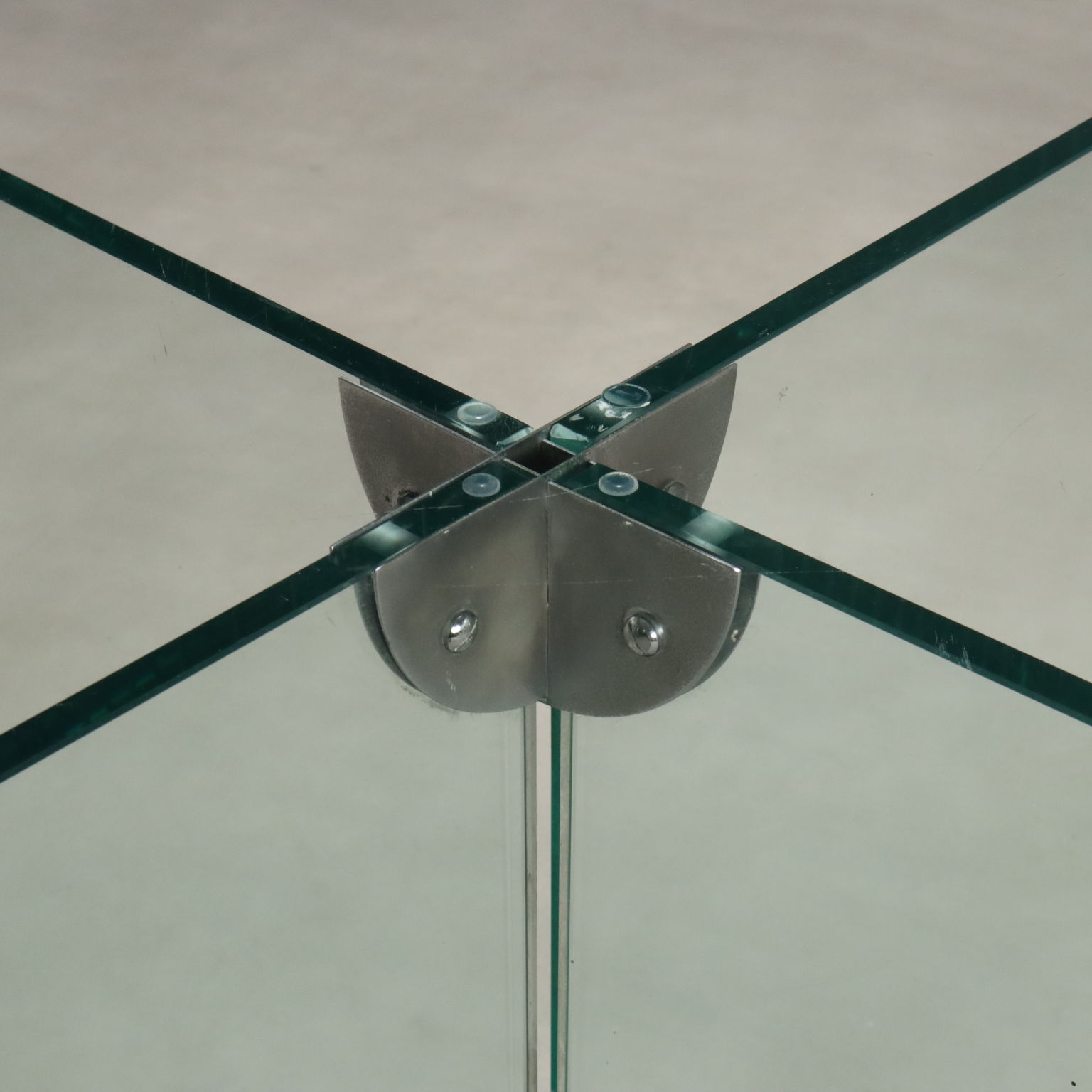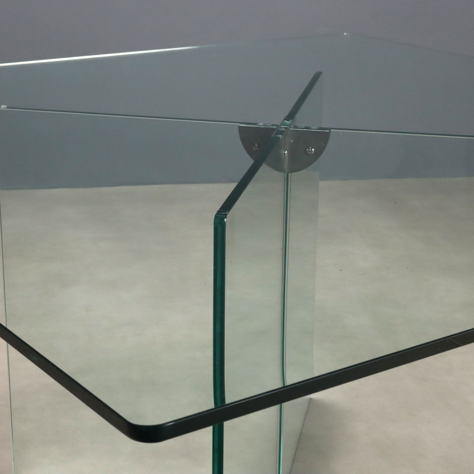 Esstisch mit quadratischer Platte und abgeschrägten Glasbeinen mit verchromten Metalldetails. In ausgezeichnetem Gesamtzustand, hat er einen kleinen Chip im Glas, der nach der Montage an der befestigten Stelle nicht mehr sichtbar ist.
