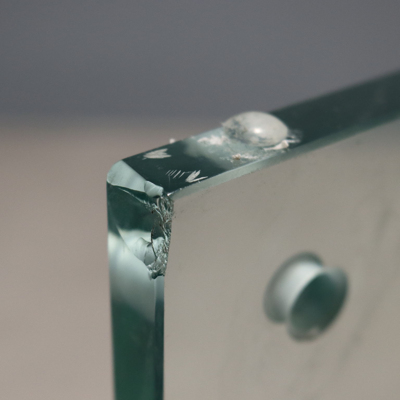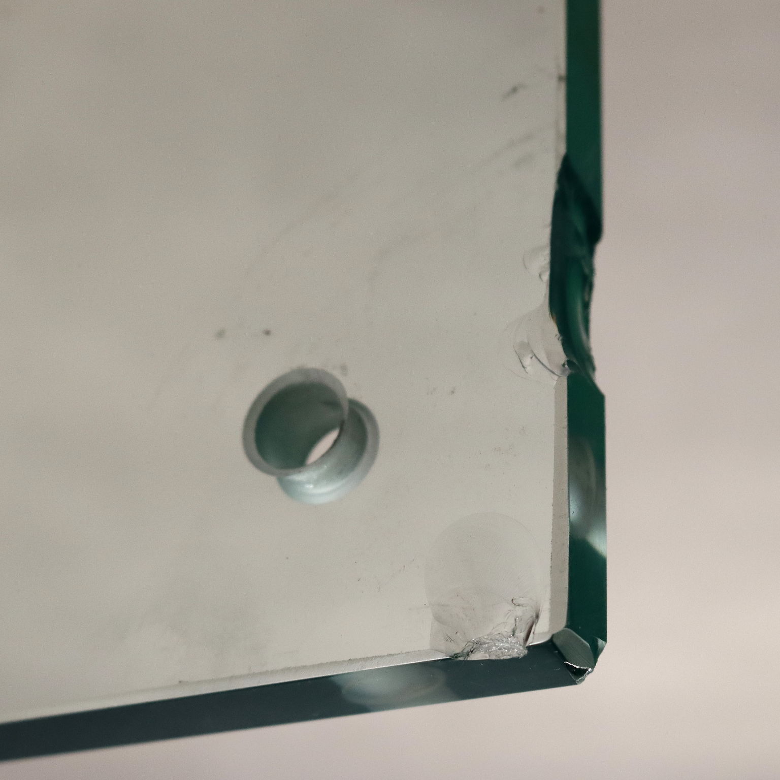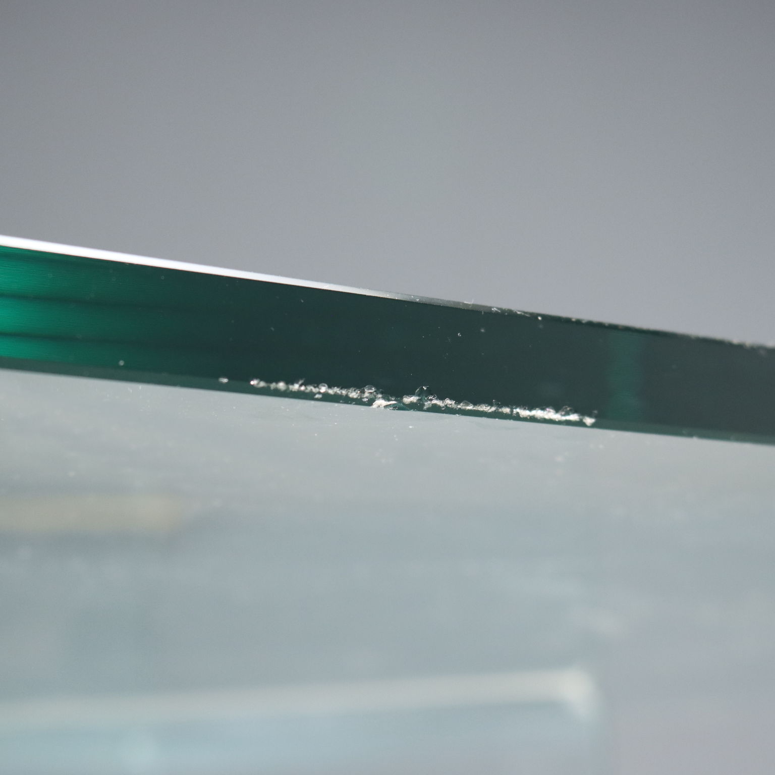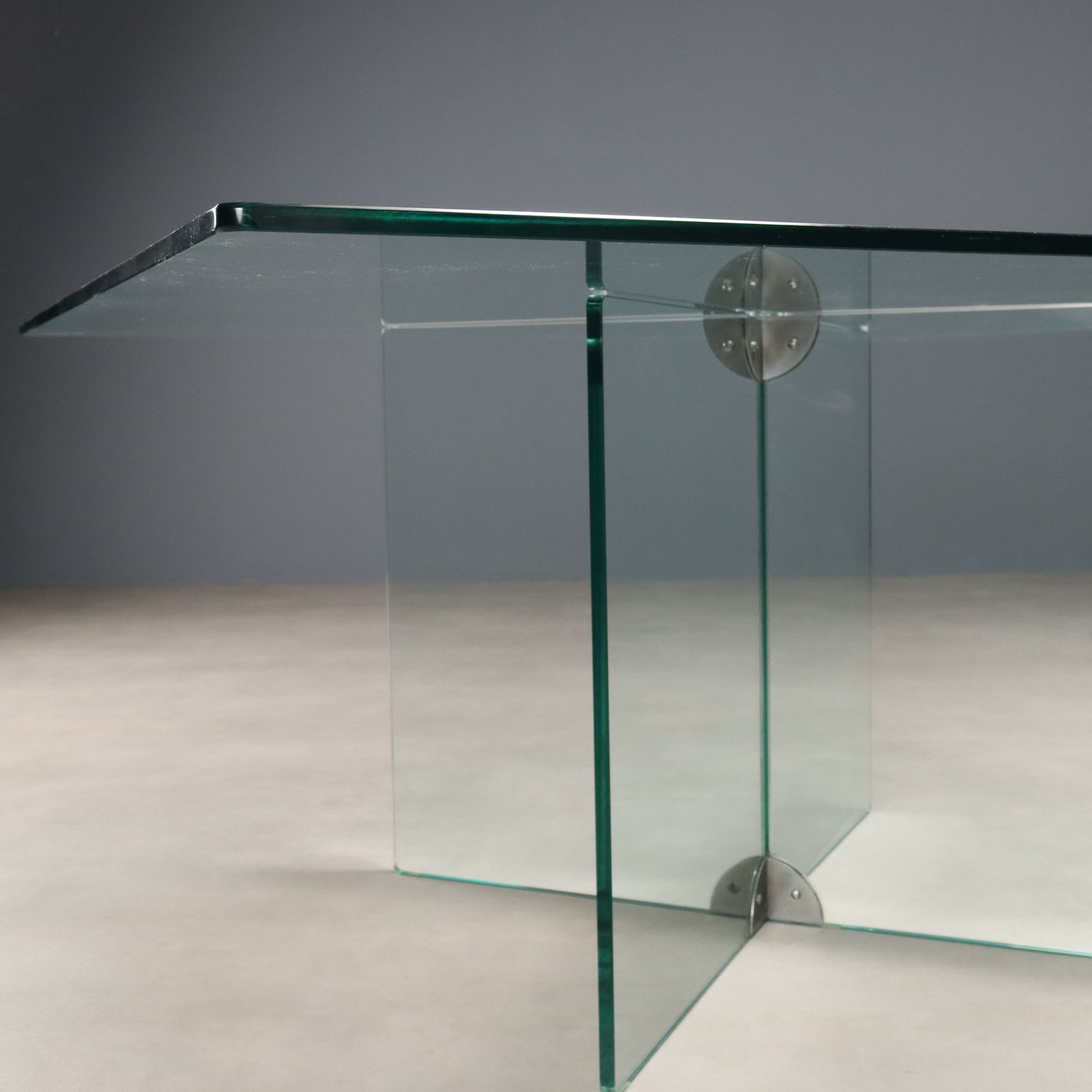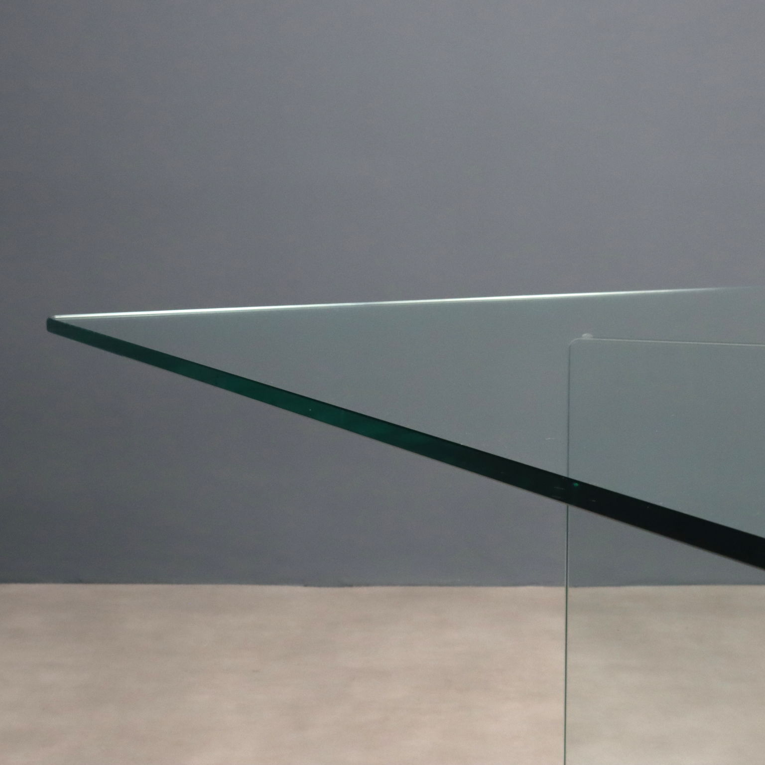 Esstisch mit quadratischer Platte und abgeschrägten Glasbeinen mit verchromten Metalldetails. In ausgezeichnetem Gesamtzustand, hat er einen kleinen Chip im Glas, der nach der Montage an der befestigten Stelle nicht mehr sichtbar ist.