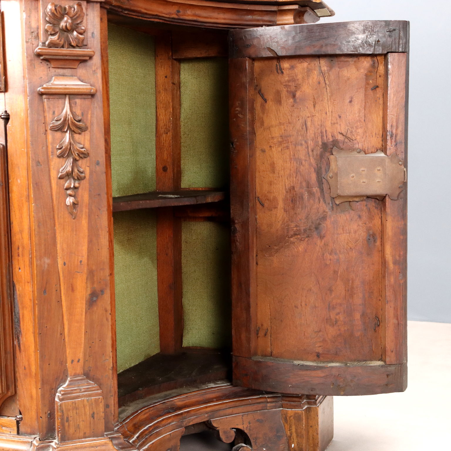 Barocke Anrichte aus Nussbaumholz mit fünf Schubladen, einem Sockel mit zweiteiliger Schublade unter der Platte, zwei Türen und geschnitzten Pfosten. Geschwungene Türen an den Seiten, Konsolenfüße, Innenausstattung aus Pappelholz. Mittelitalien, 17. Jahrhundert.