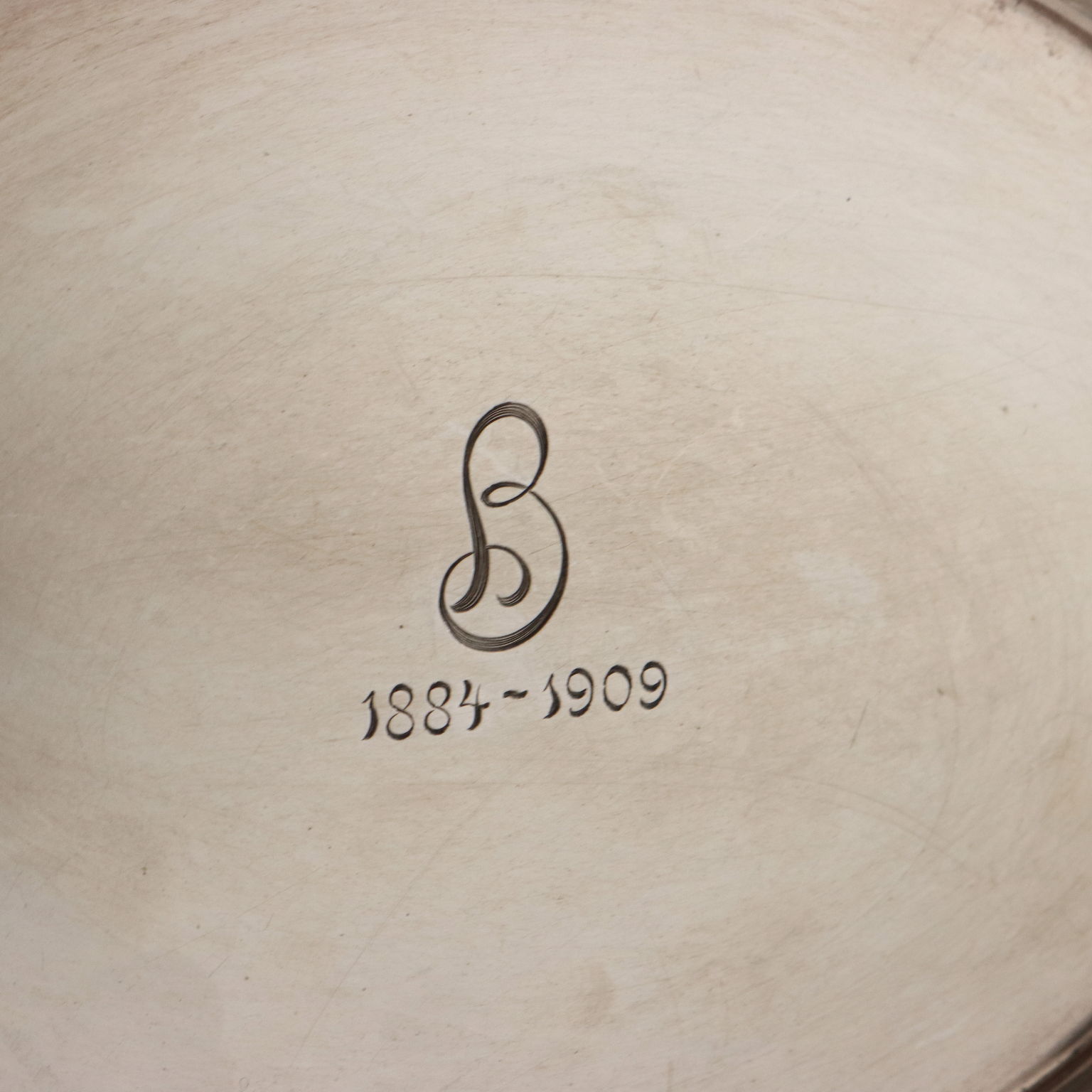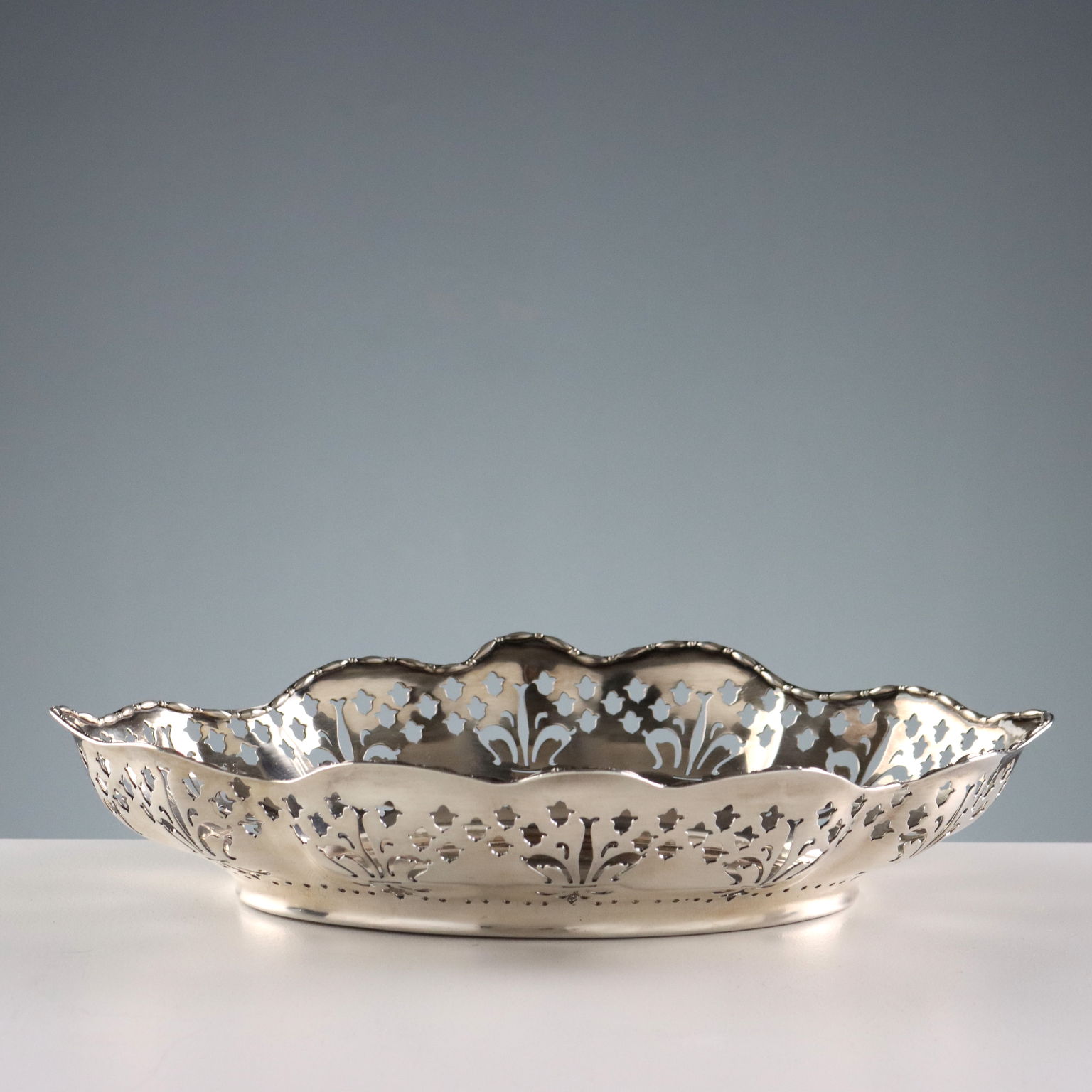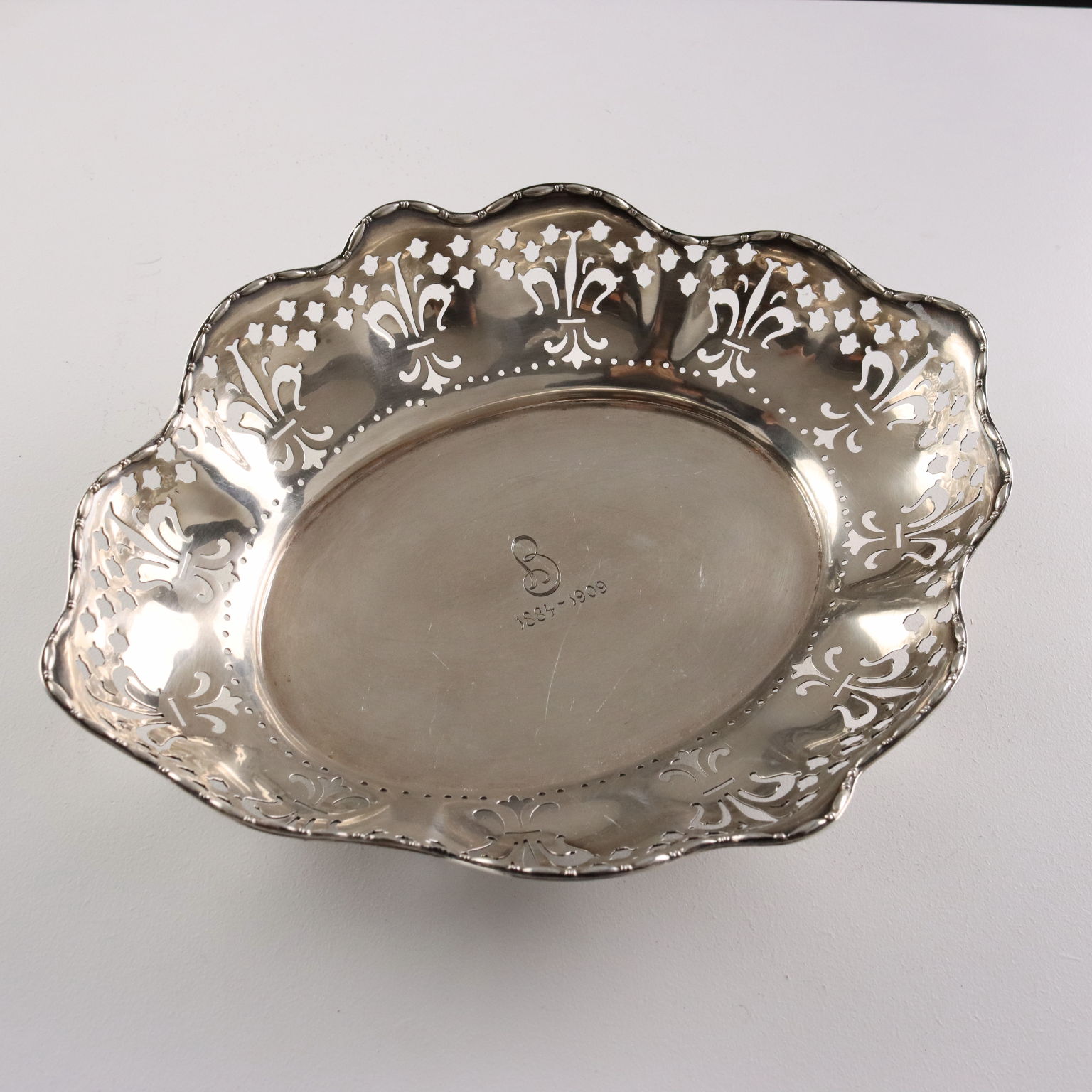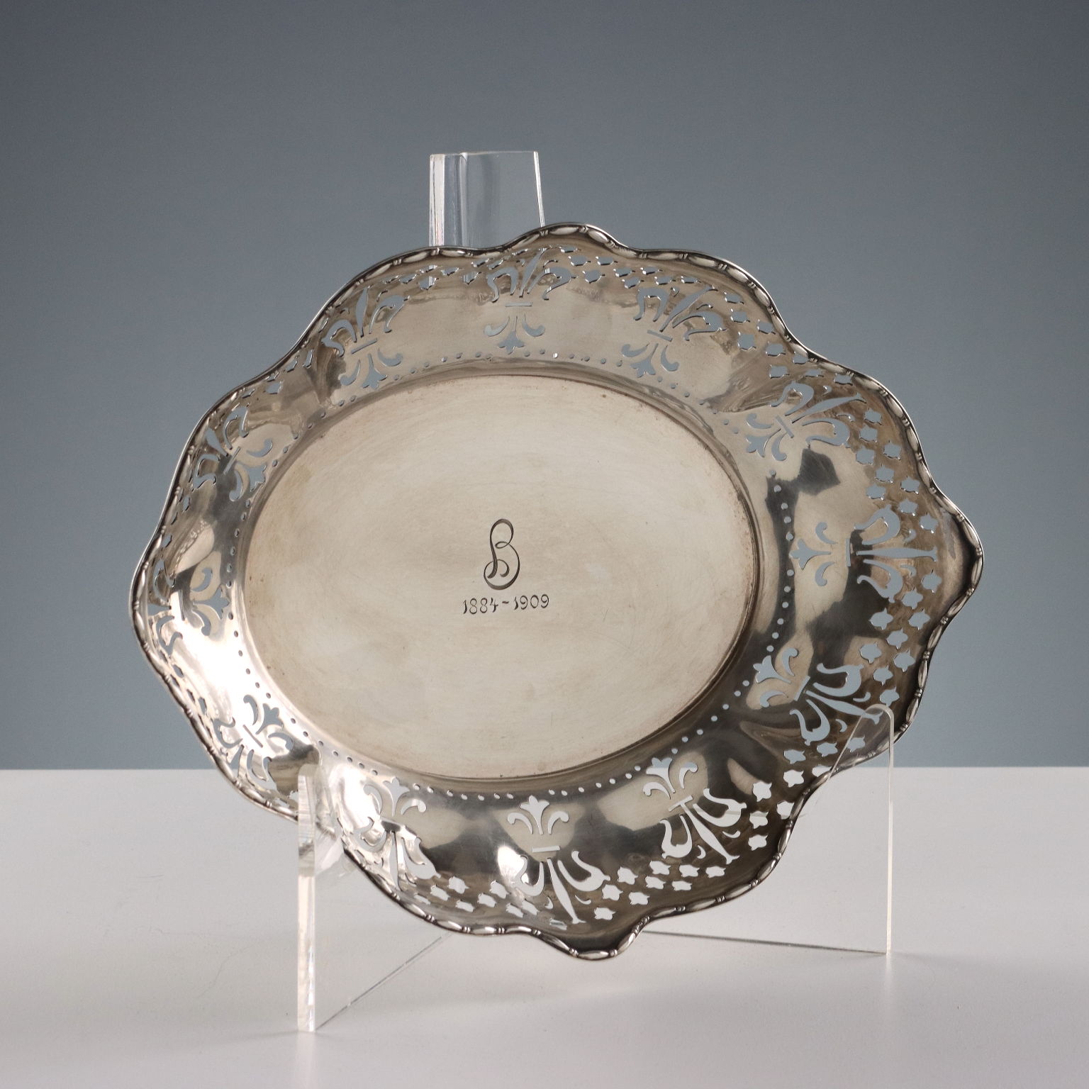 Brotkorb aus Sterlingsilber mit sich wiederholendem Muster. In der Vertiefung sind ein Buchstabe und Daten mit einem Meißel eingraviert. Auf der Rückseite sind Silberpunzen eingraviert. Gewicht: 410 Gramm.