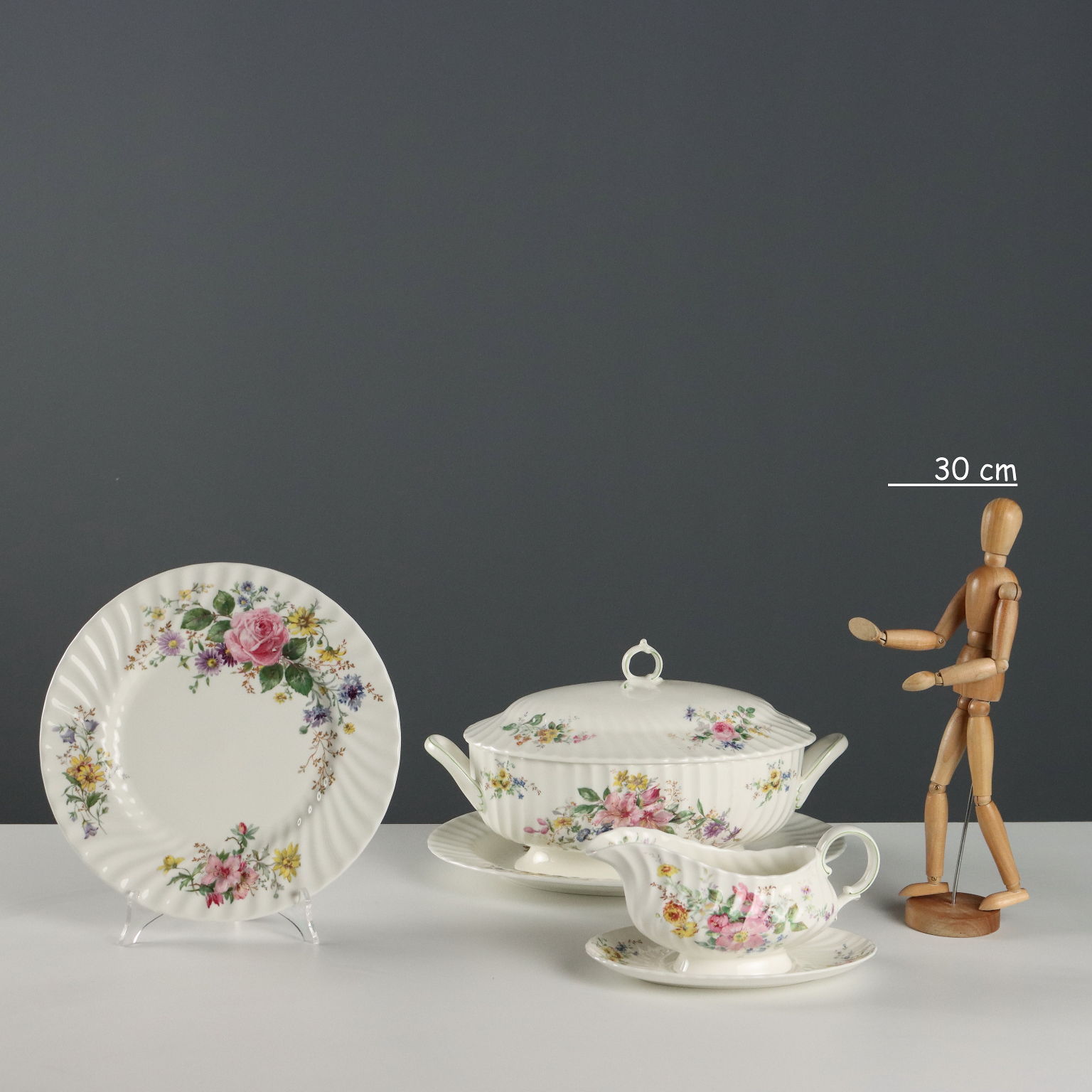 Porzellangeschirr der Serie Arcadia. Das Set besteht aus 1 Suppenterrine, 1 Sauciere, 6 Serviertellern, 25 Speisetellern, 11 Suppentellern und 12 Beilagentellern. Insgesamt 56 Teile. Herstellermarke unter dem Boden.