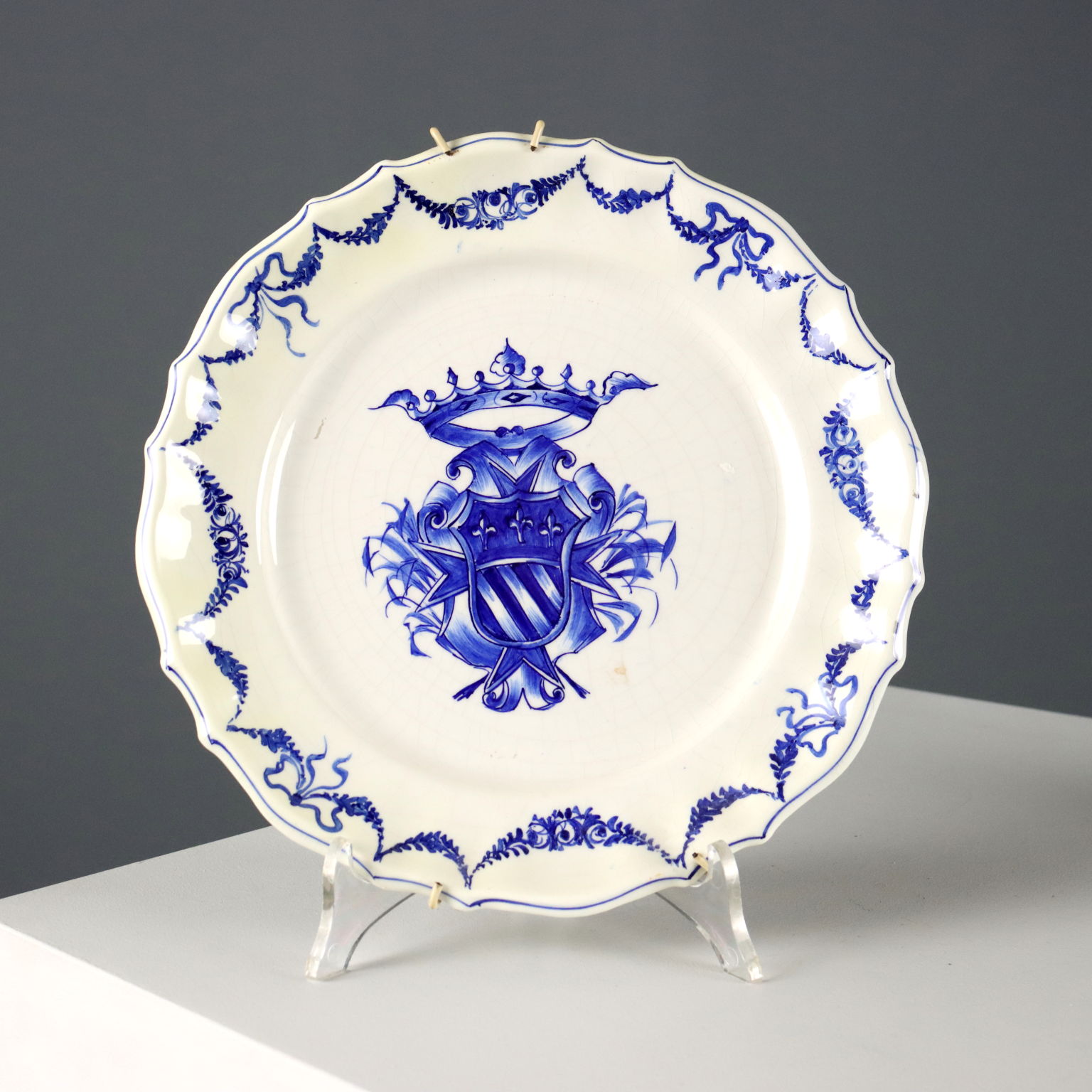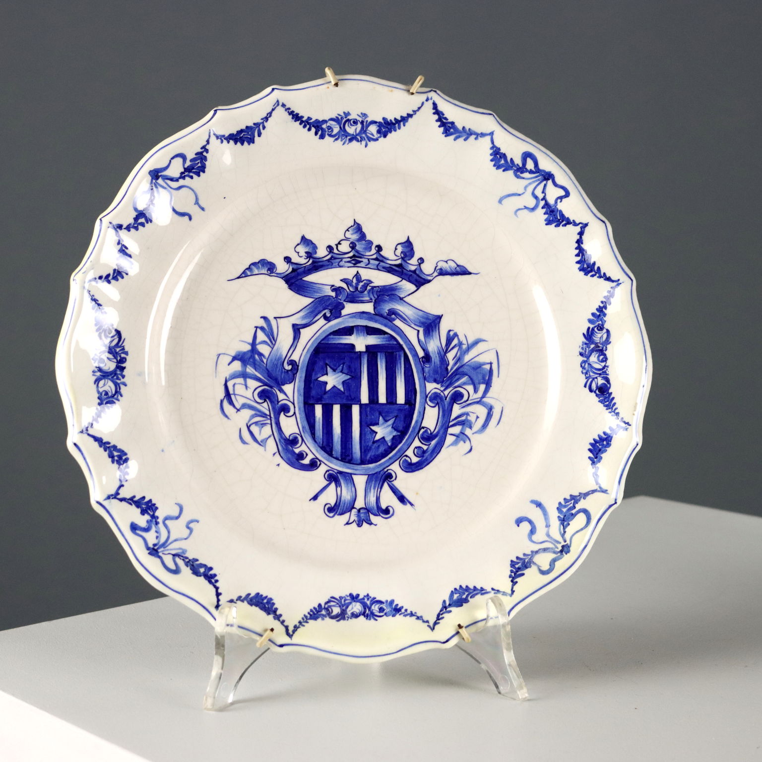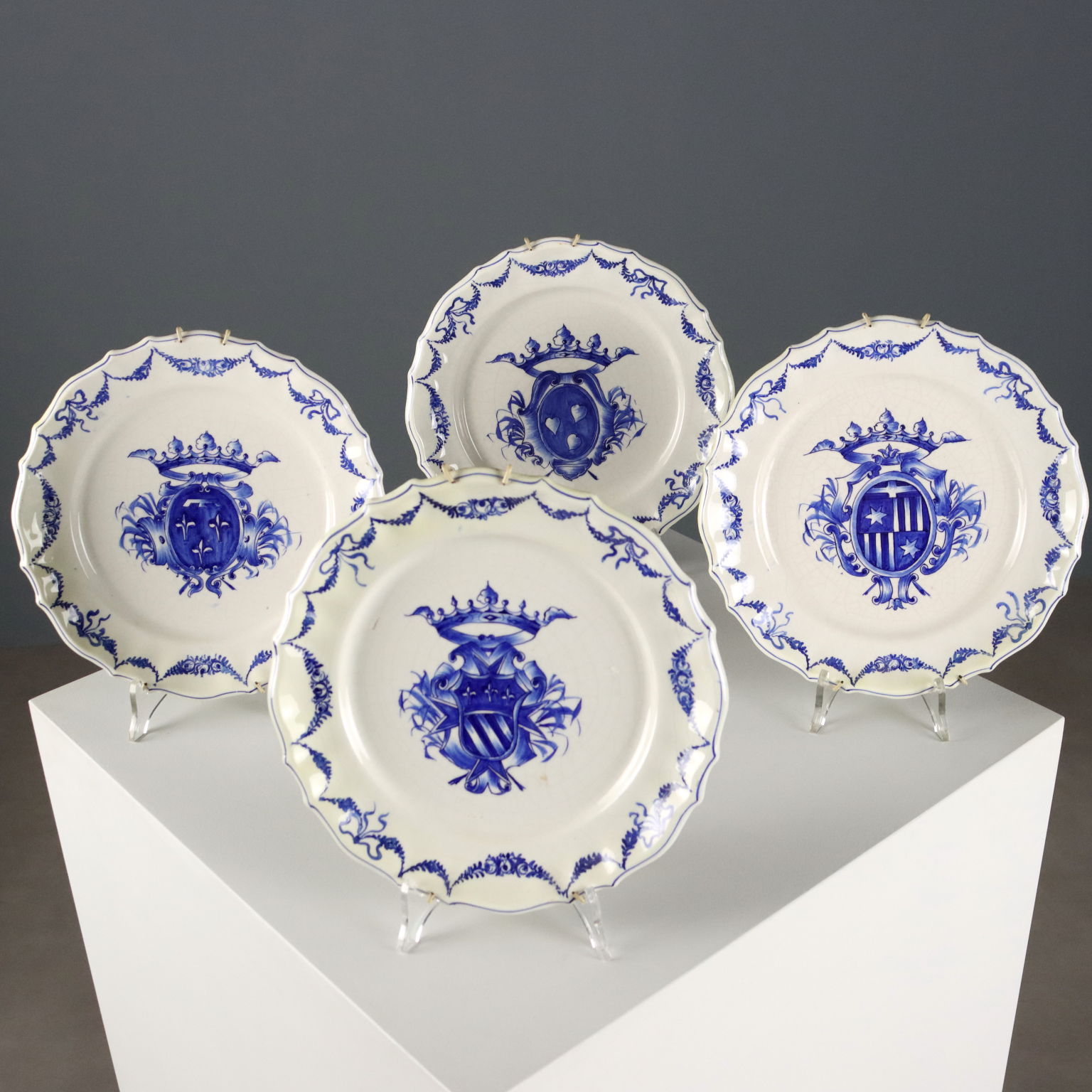 Set aus vier Keramiktellern in monochromem Blau mit heraldischen Wappen auf dem Mittelstück und Blumengirlanden am Rand. Herstellermarke auf der Rückseite.