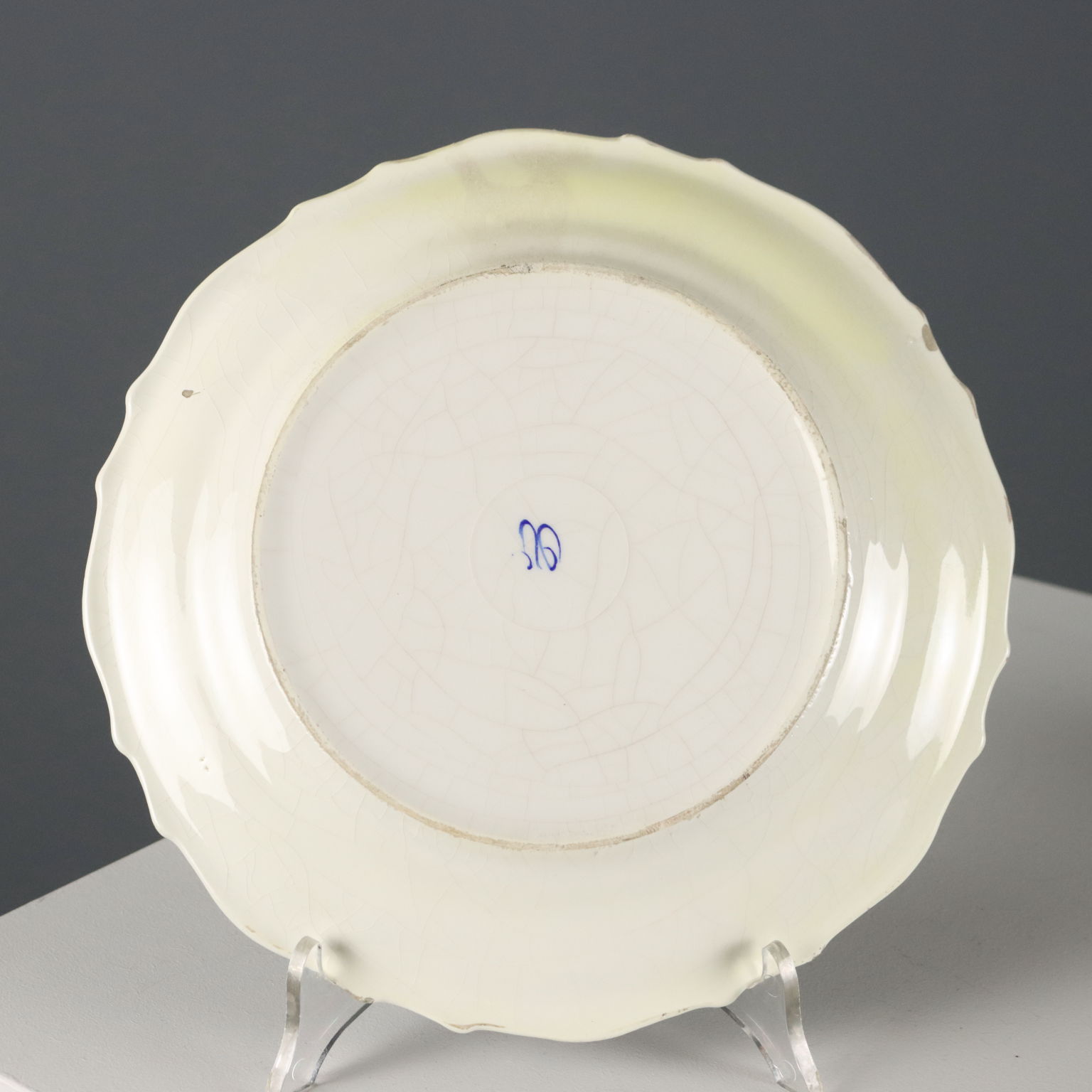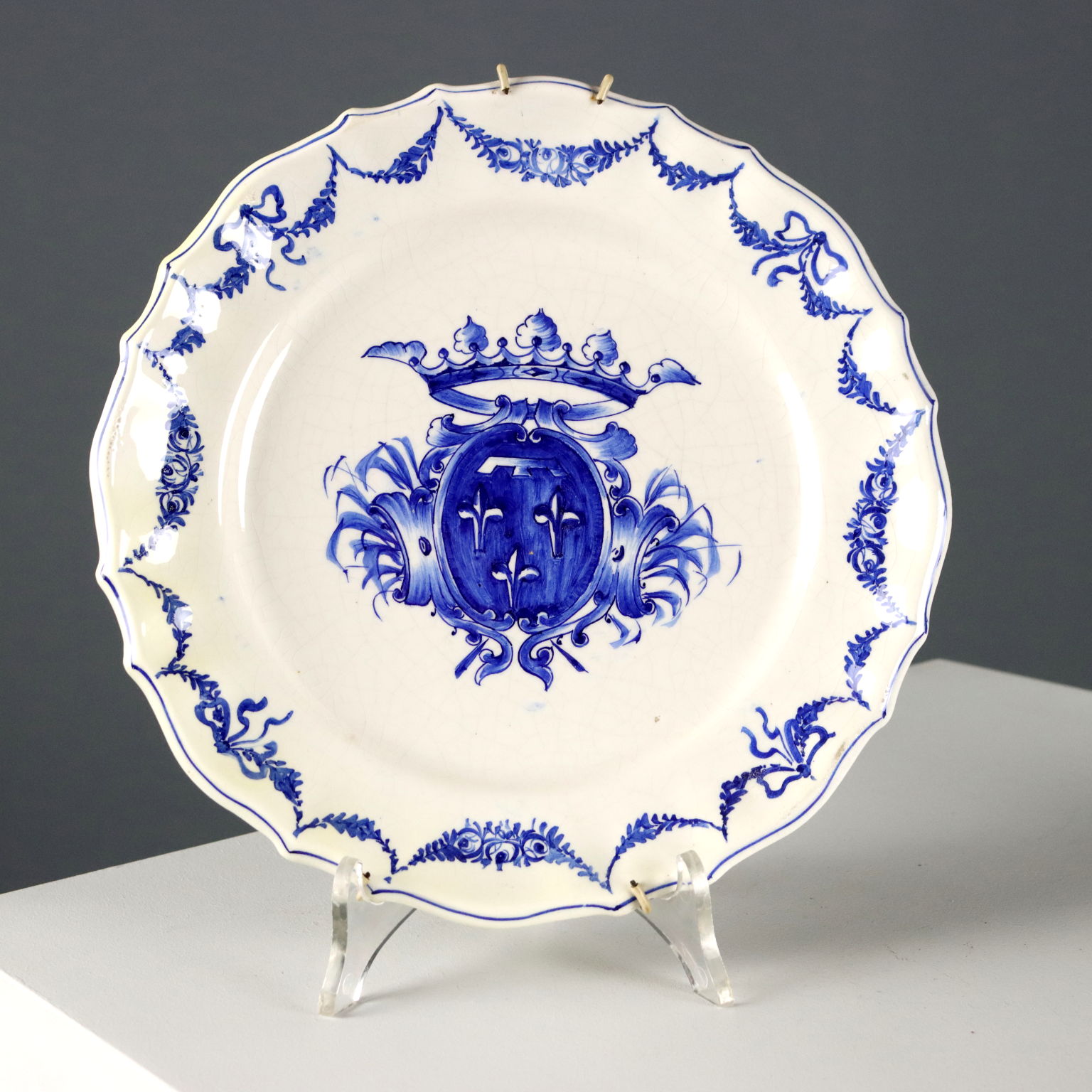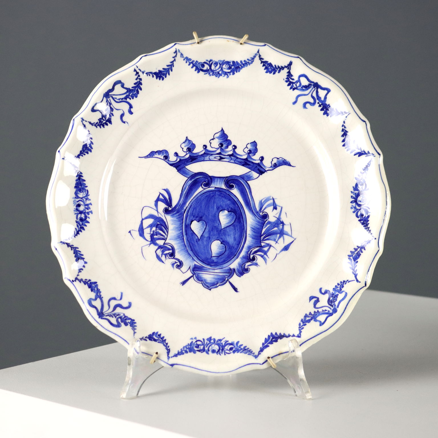 Set aus vier Keramiktellern in monochromem Blau mit heraldischen Wappen auf dem Mittelstück und Blumengirlanden am Rand. Herstellermarke auf der Rückseite.