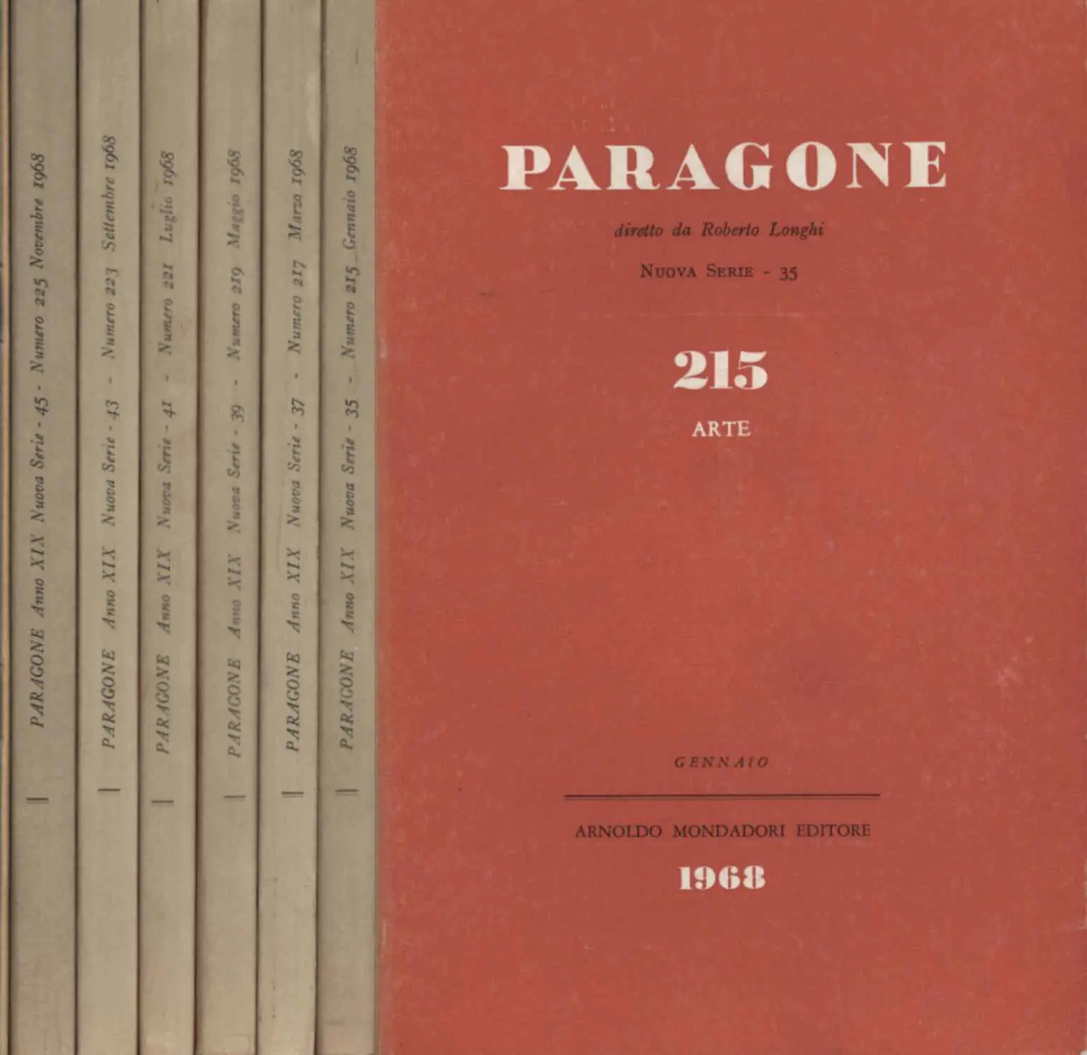 Monatliche Zeitschrift für figurative Kunst und Literatur, herausgegeben von Roberto Longhi, mit der Beilage „Indici di Paragone 1968 Arte“, herausgegeben von Alessandro Conti und Mario Di Giampaolo. Ausgaben 215, 217, 219, 221, 223 und 225. Mit zahlreichen Abbildungen, überwiegend in Schwarzweiß.