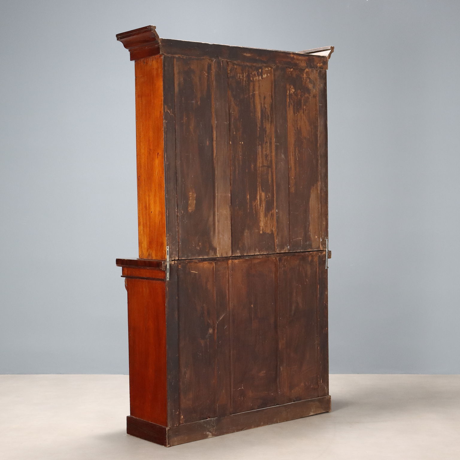 Viktorianisches Bücherregal aus Mahagoni. Der obere Teil hat Glastüren und drei Einlegeböden, während der untere Teil getäfelte Türen hat. England, Ende des 19. Jahrhunderts.