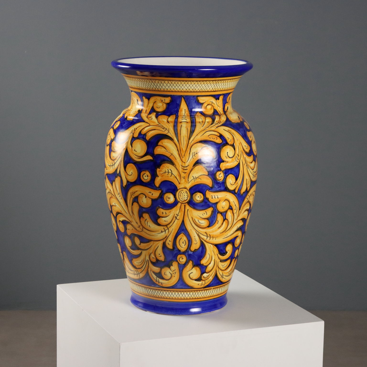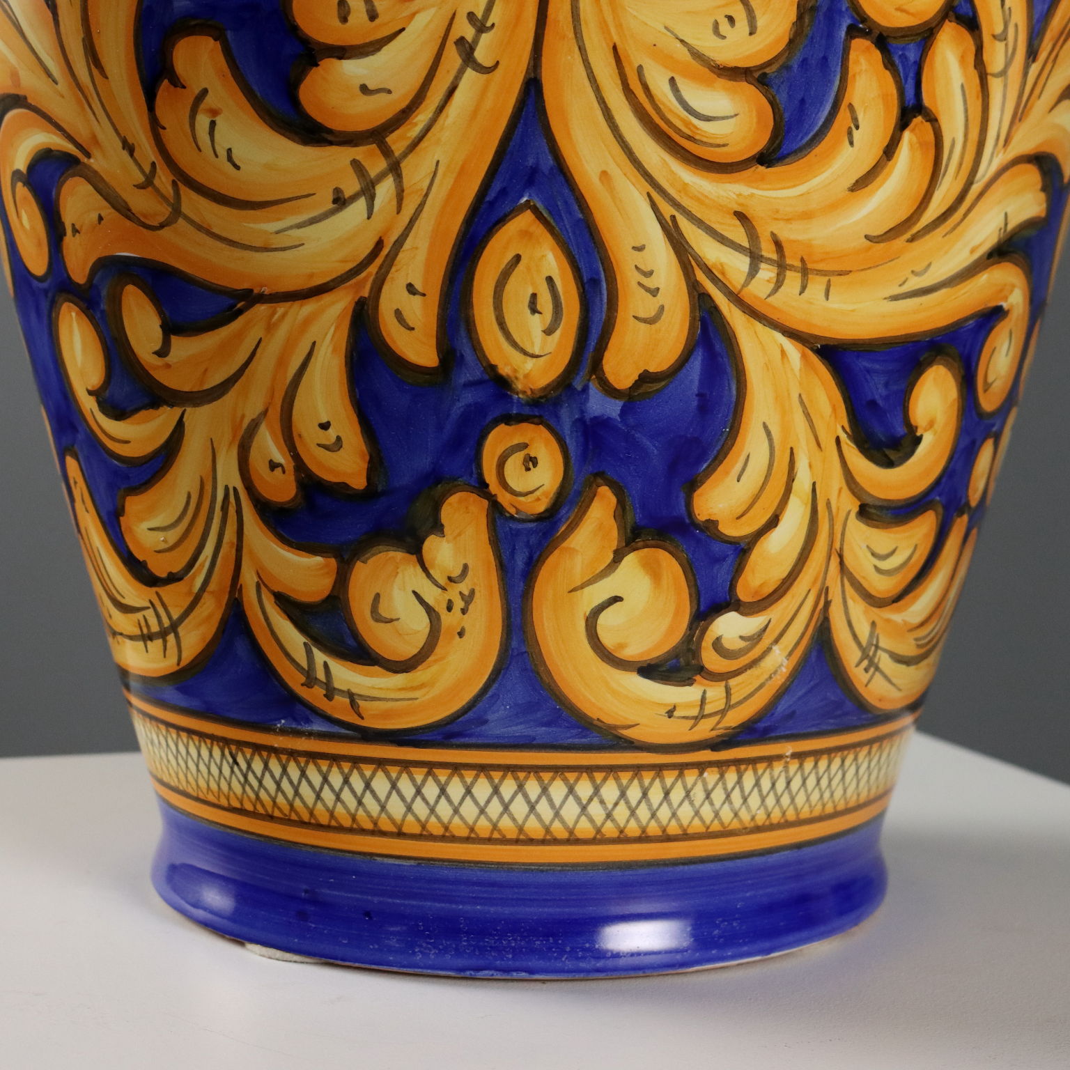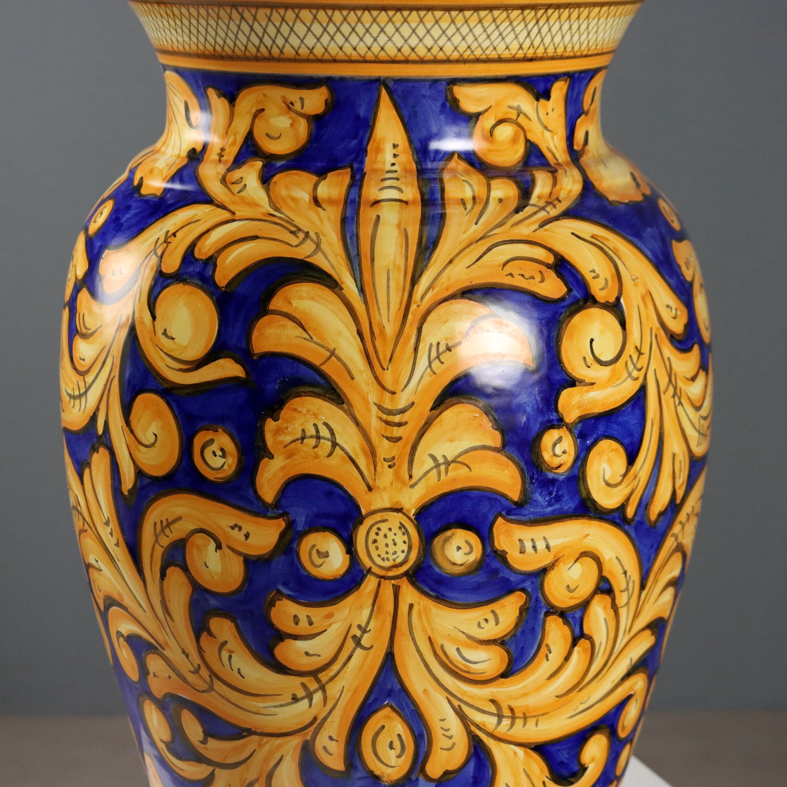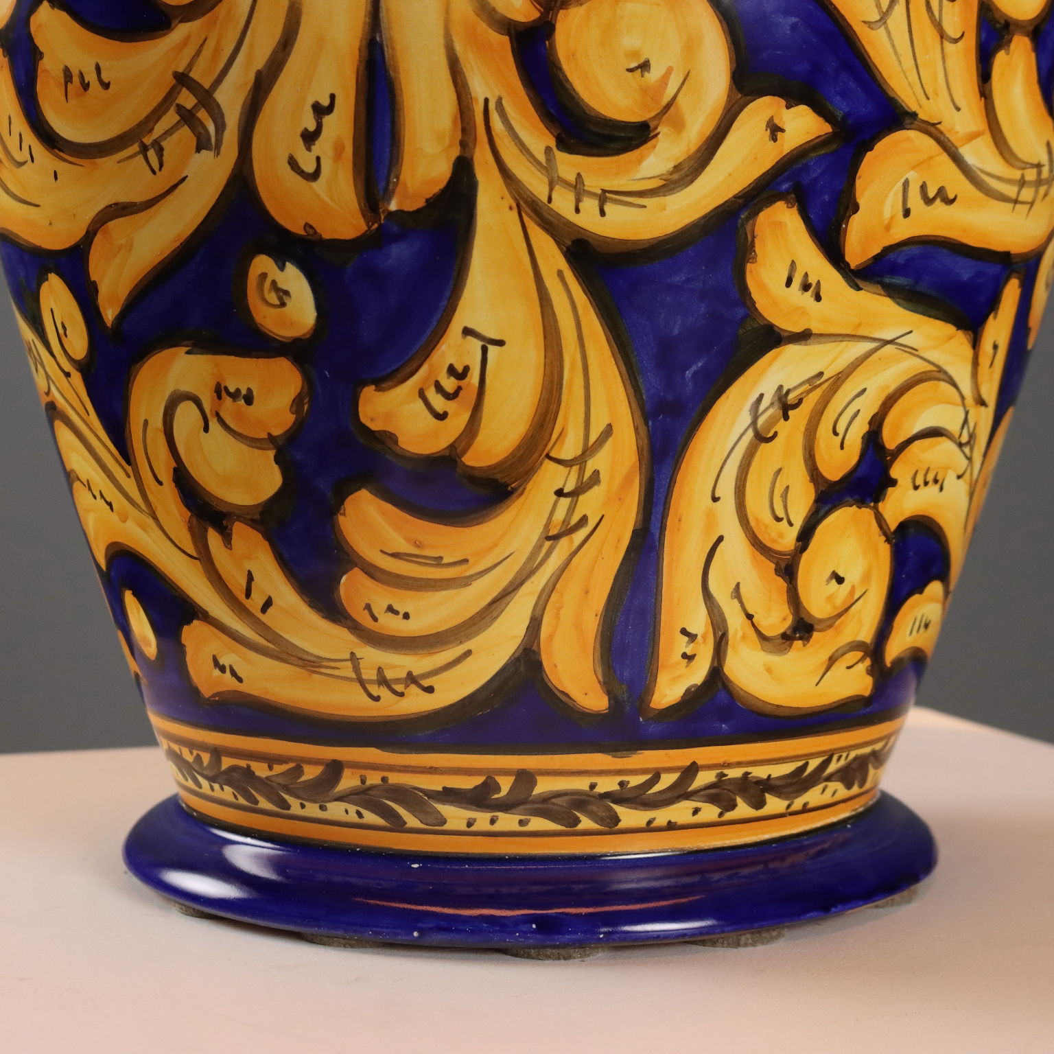 Solimene Vietri Keramikgruppe bestehend aus einem Übertopf, einer großen Vase und einer Lampe. Glasierte Keramik in Kobaltblau und Gelbtönen, mit Blattranken und griechischen Schlüsseln verziert. Markenzeichen auf der Unterseite.
