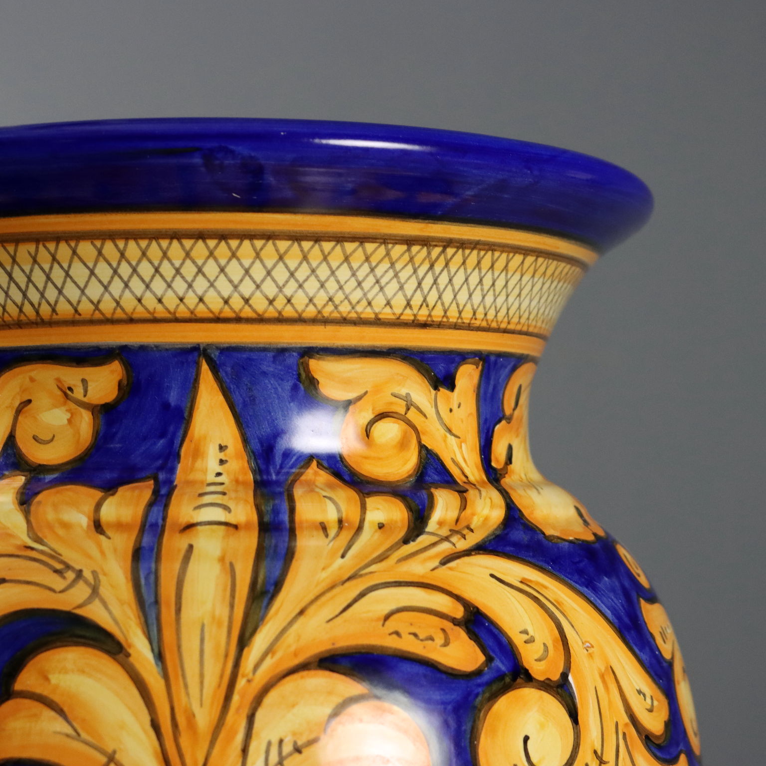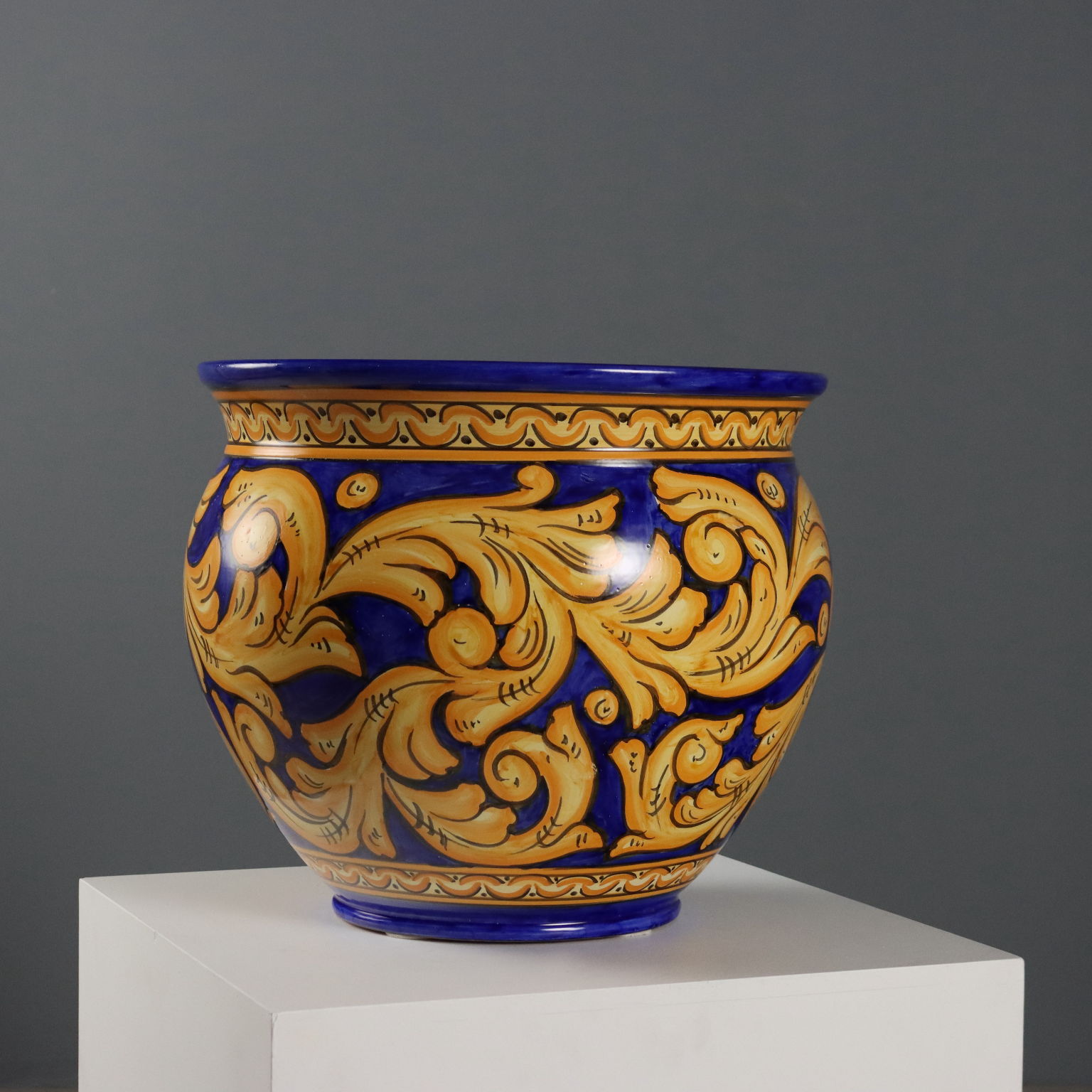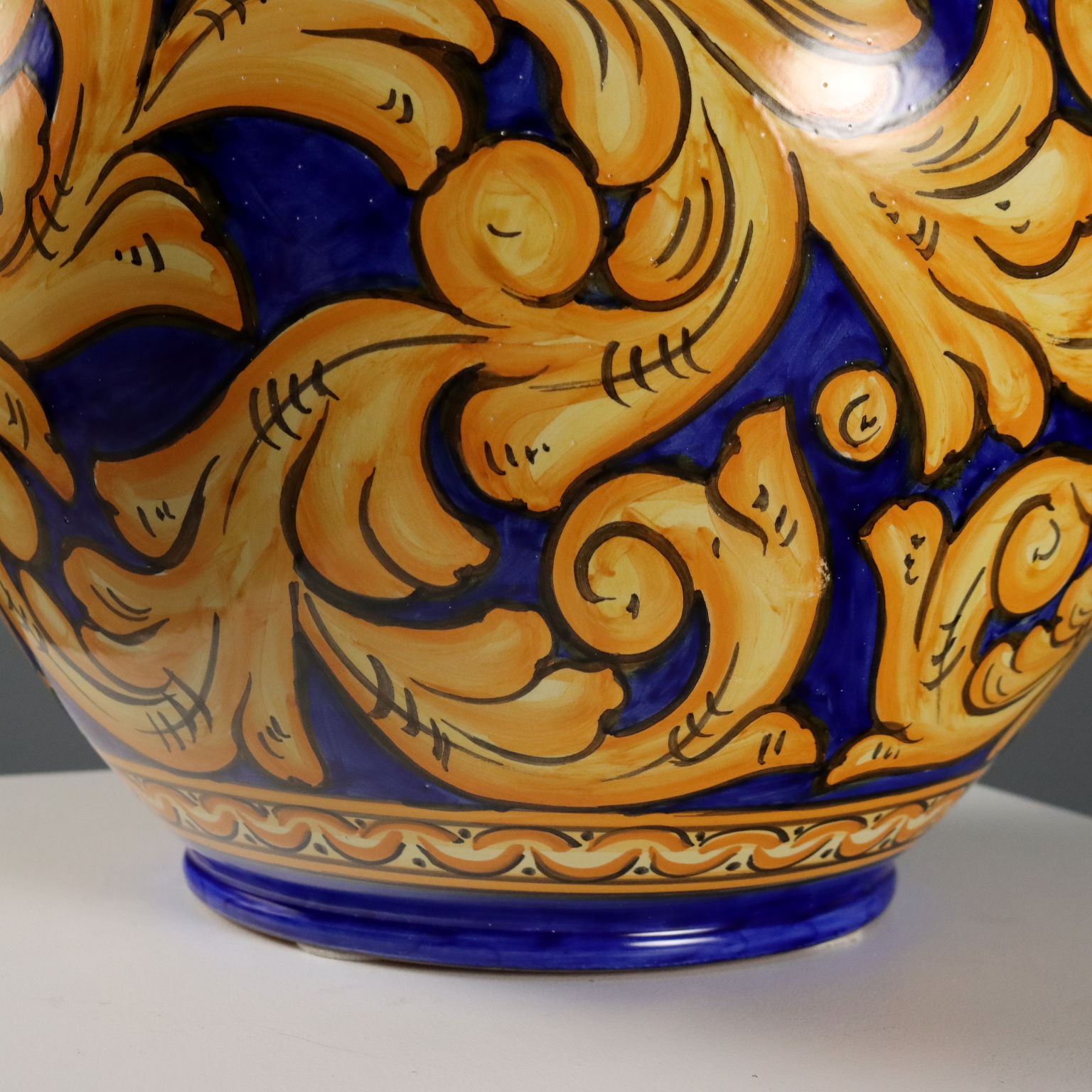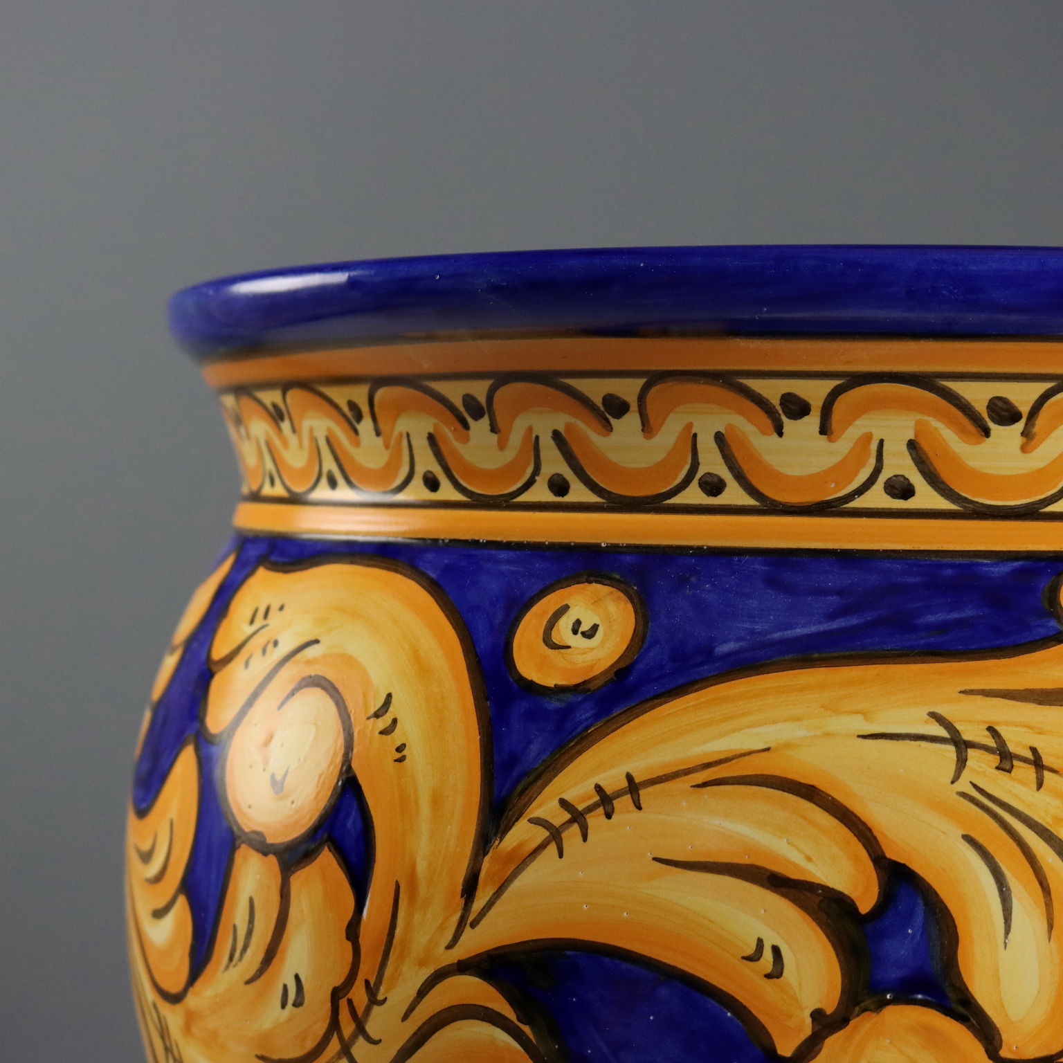 Solimene Vietri Keramikgruppe bestehend aus einem Übertopf, einer großen Vase und einer Lampe. Glasierte Keramik in Kobaltblau und Gelbtönen, mit Blattranken und griechischen Schlüsseln verziert. Markenzeichen auf der Unterseite.