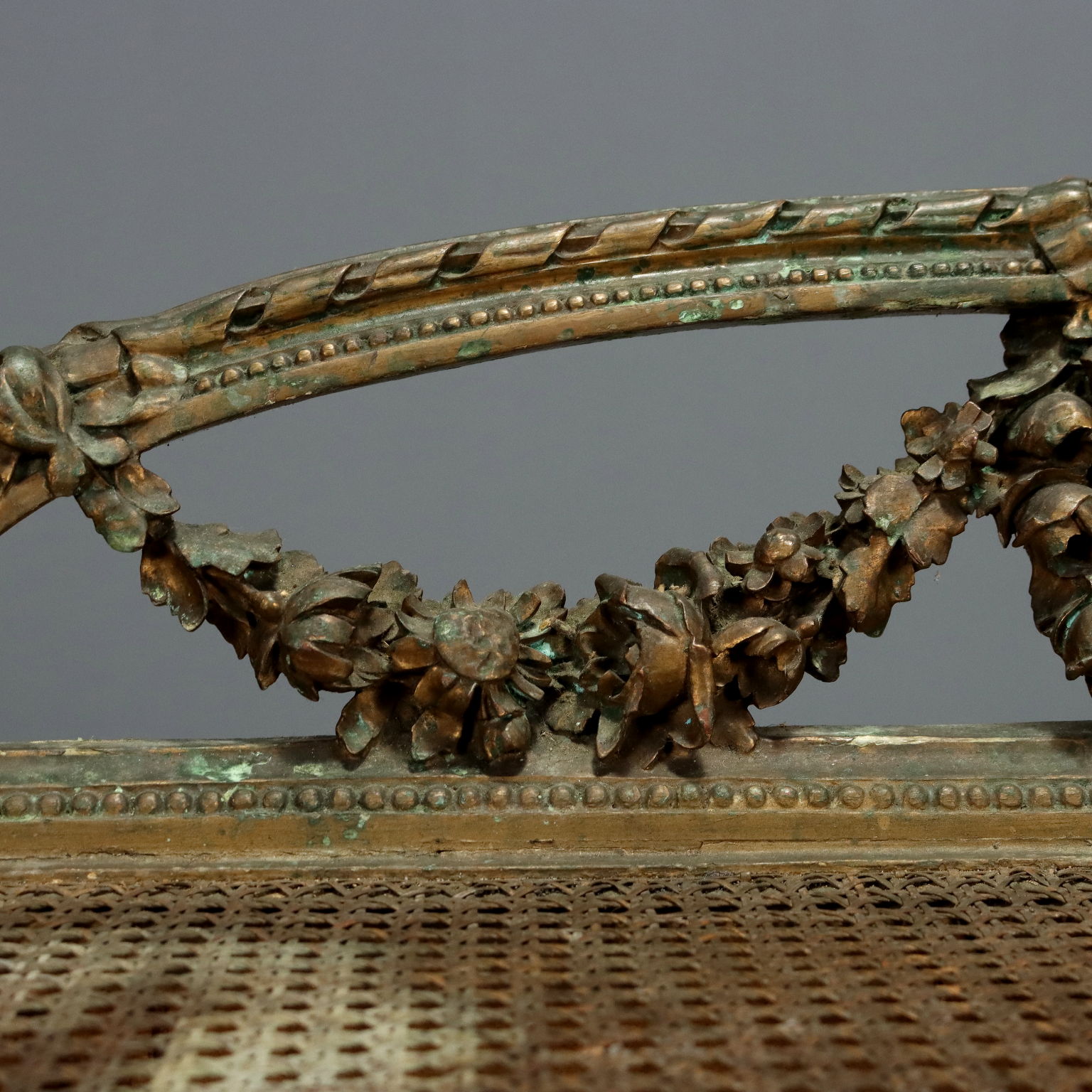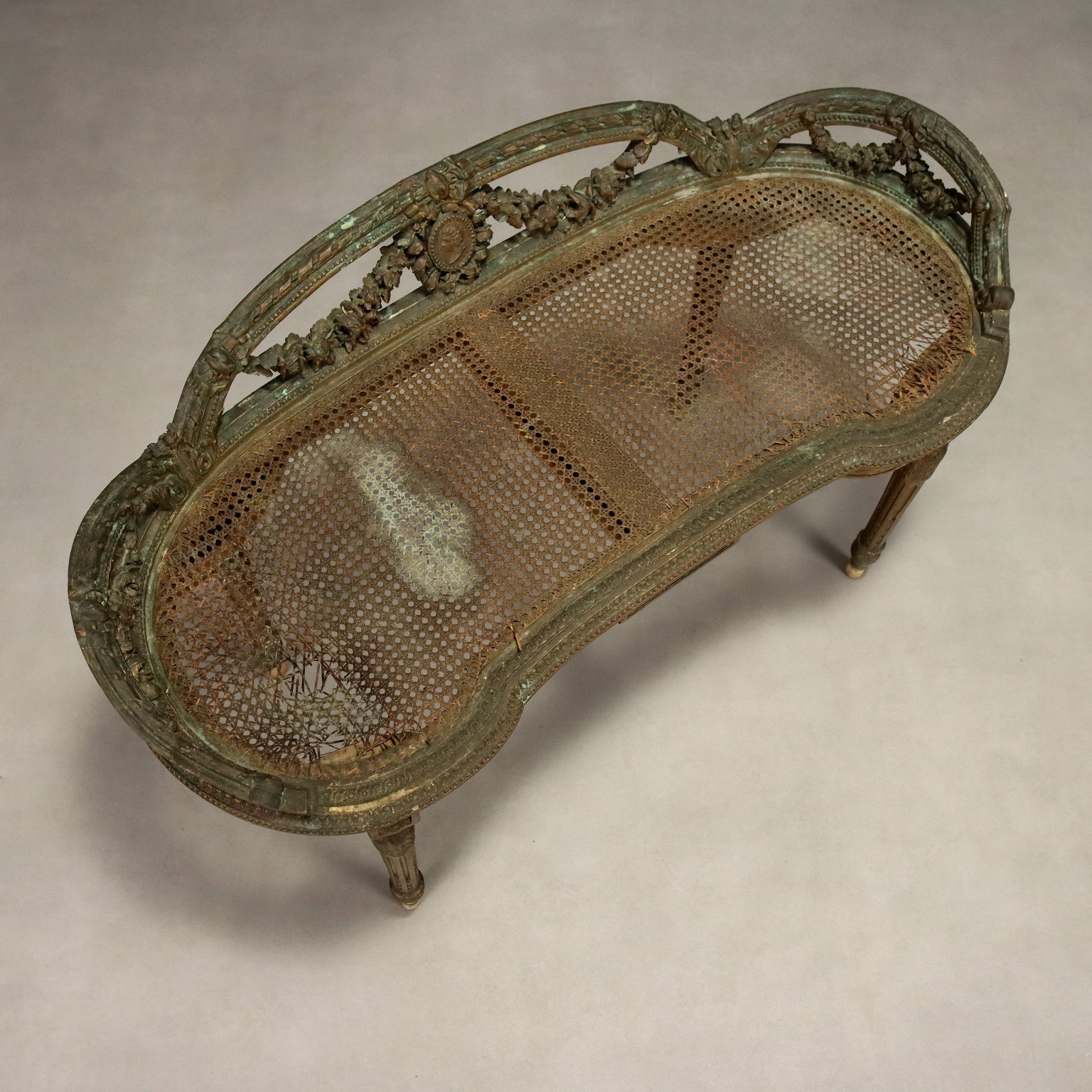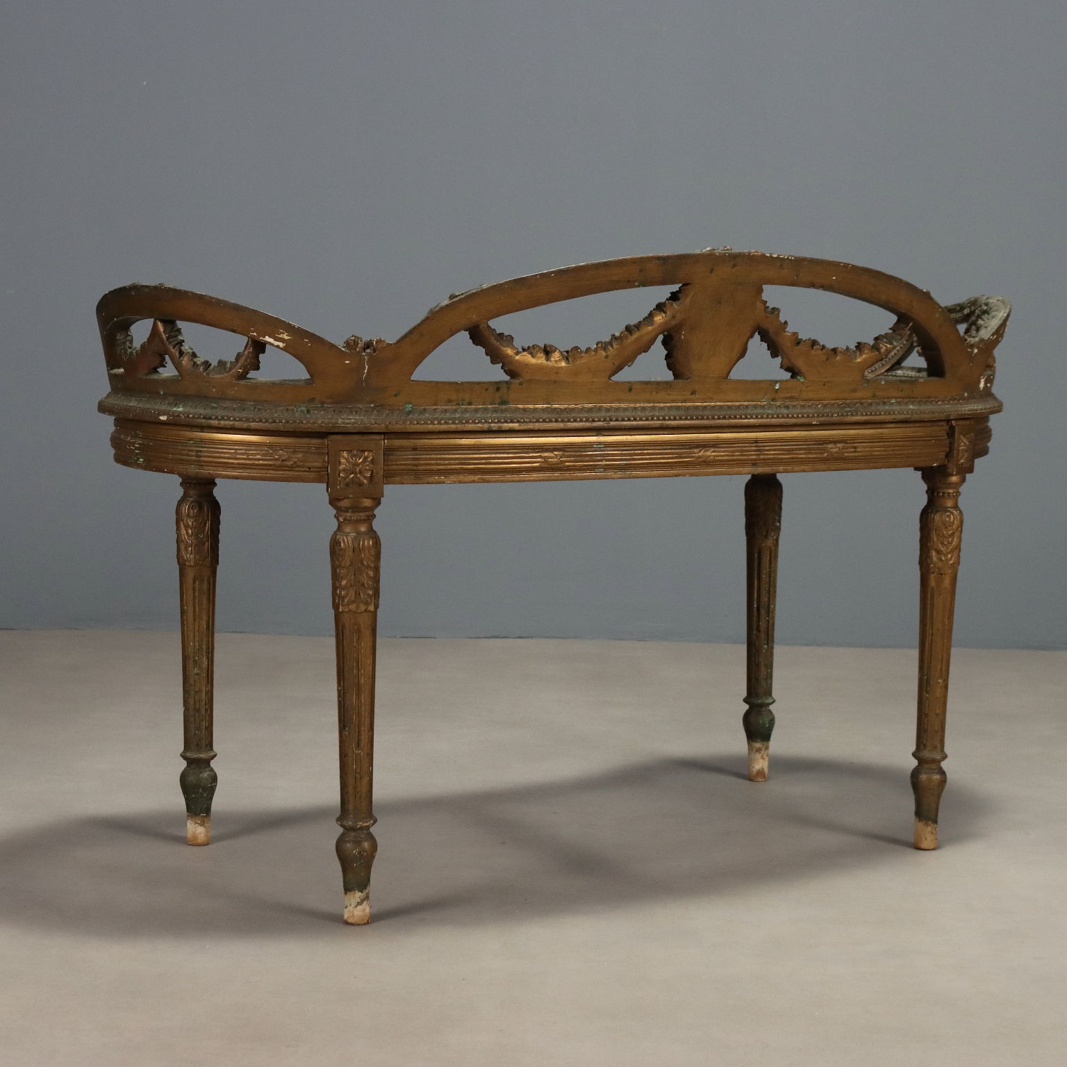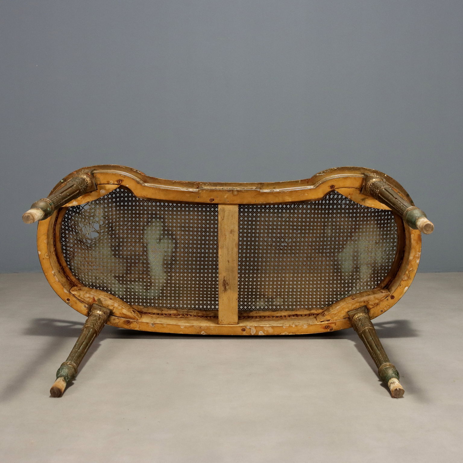 Geschnitzte und vergoldete Holzbank. Offene Rückenlehne mit geschnitzten Girlanden und einem zentralen Medaillon, sich verjüngende Beine mit Blattschnitzereien. Der Schilfsitz muss erneuert werden. Italien, Ende des 19. Jahrhunderts.