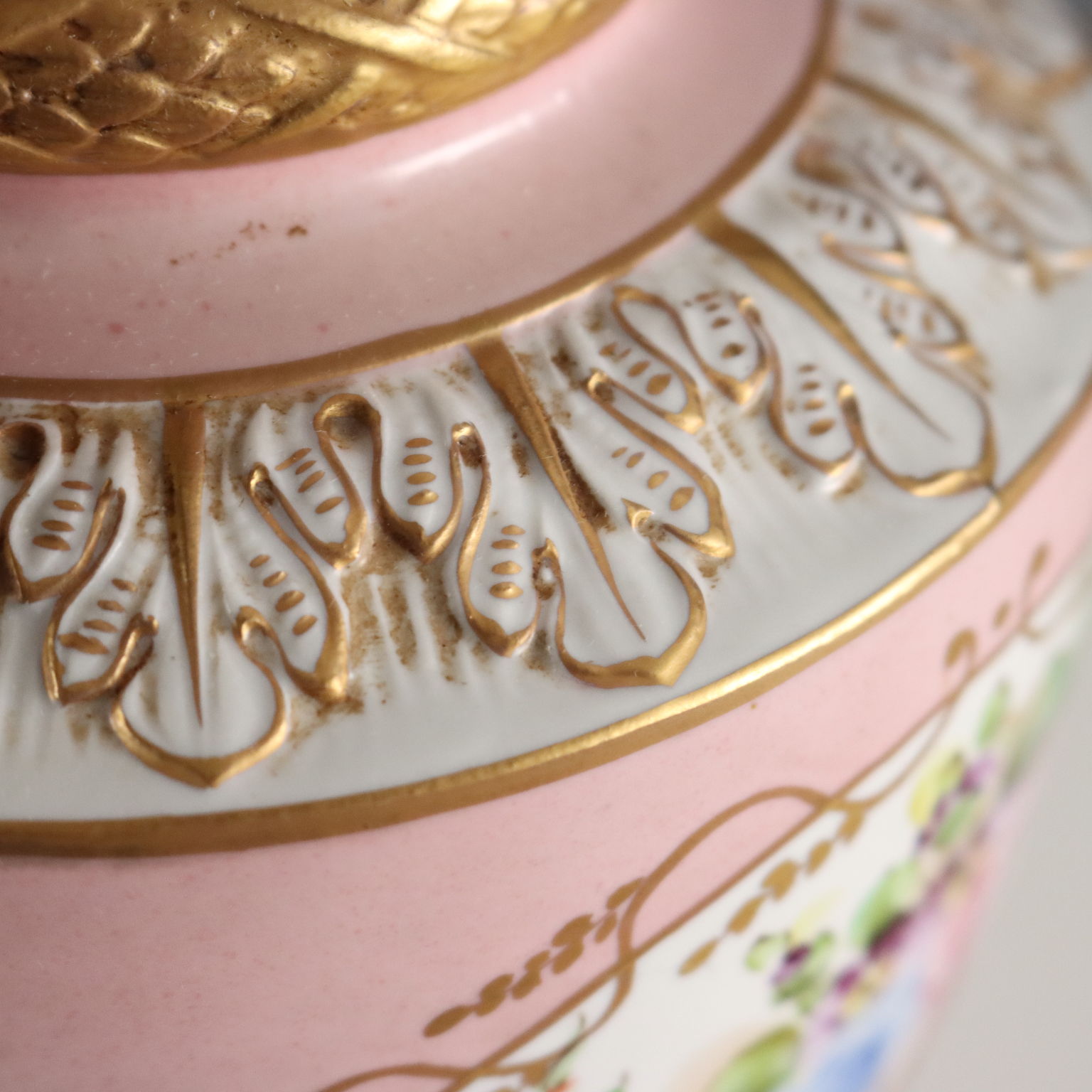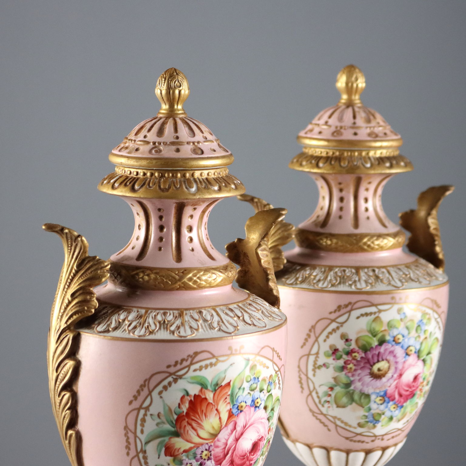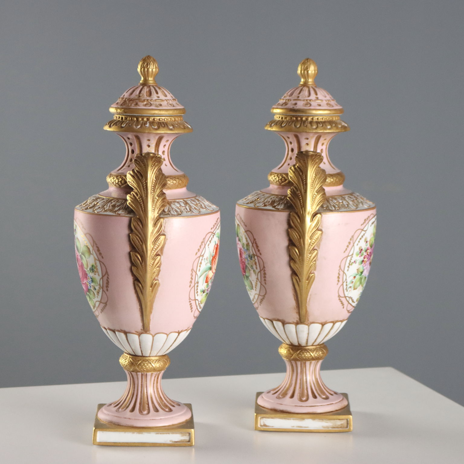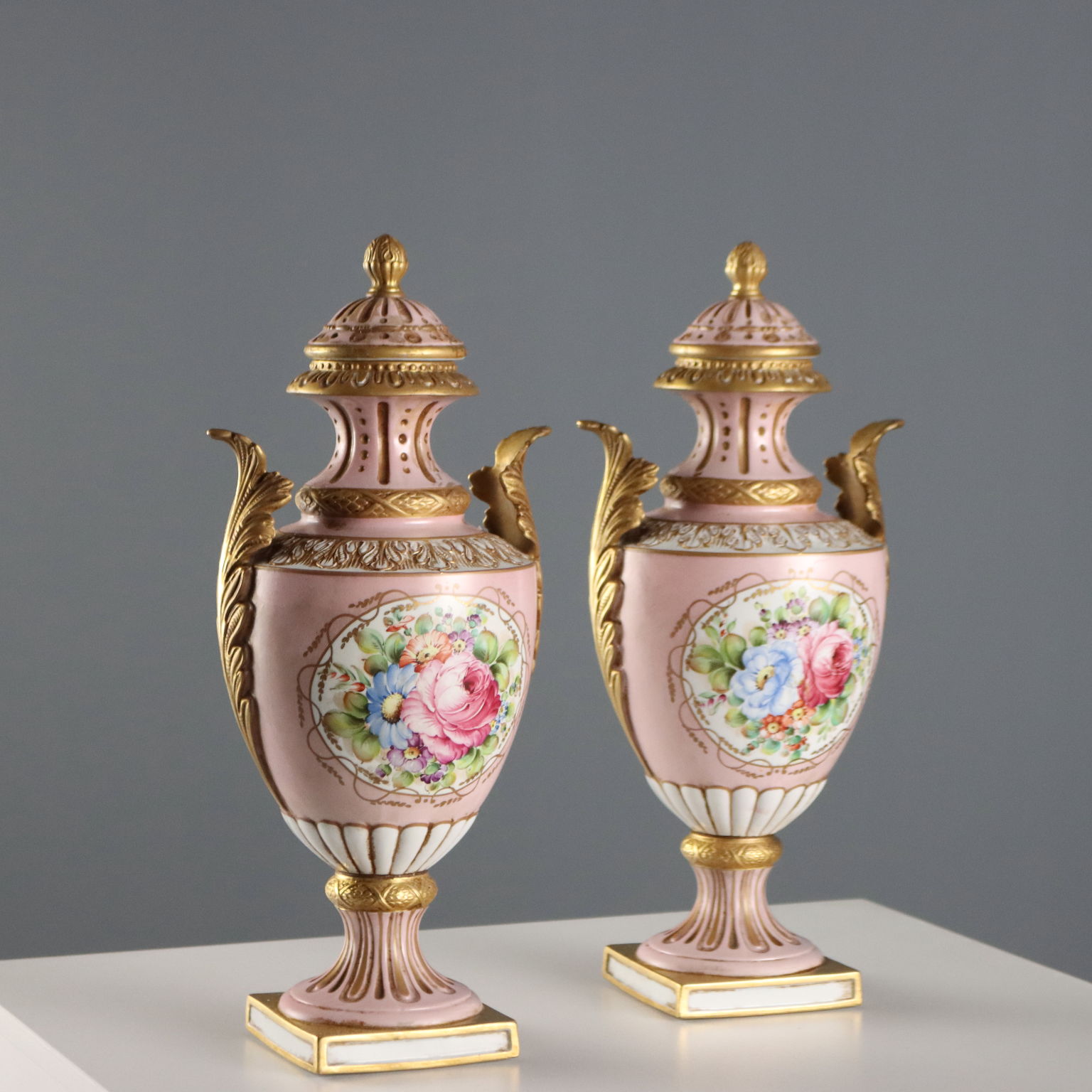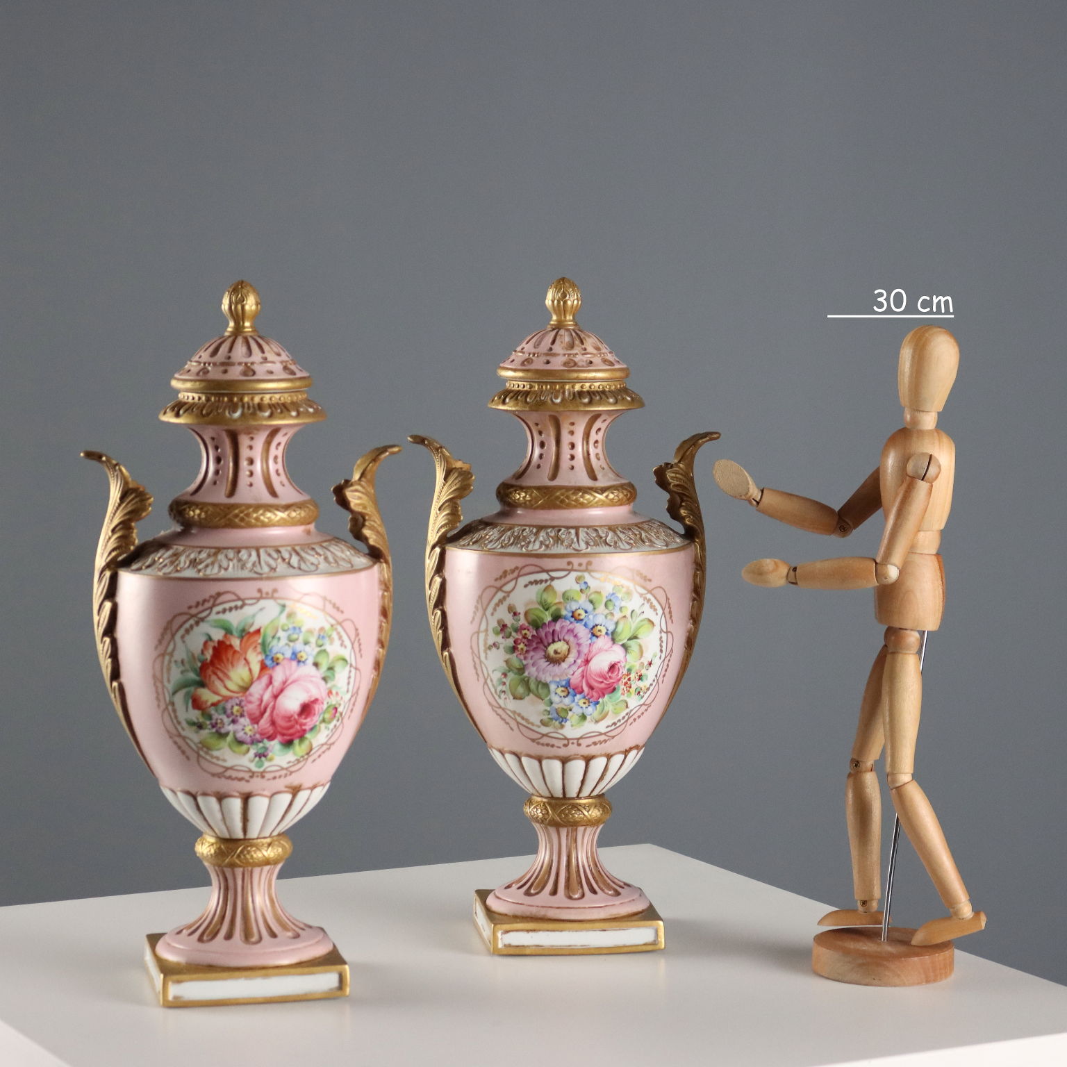 Ein Paar Potiches in Roségold. Polychrome Dekoration mit Blumenbouquets in den Reserven. Vergoldete blattförmige Henkel und ein knospenförmiger Griff. Herstellermarke in Blau unter dem Boden.
