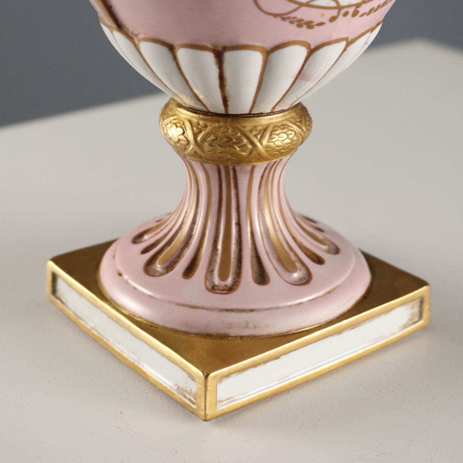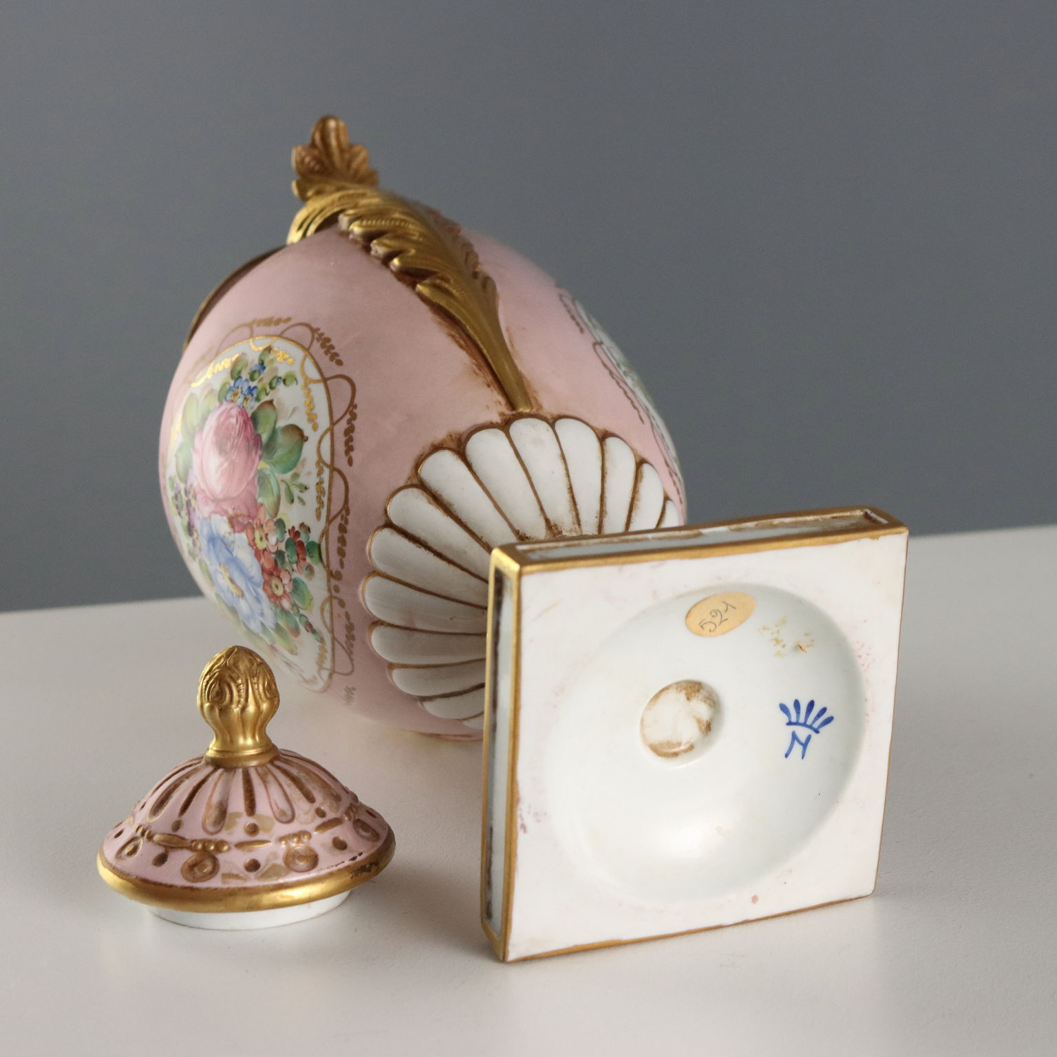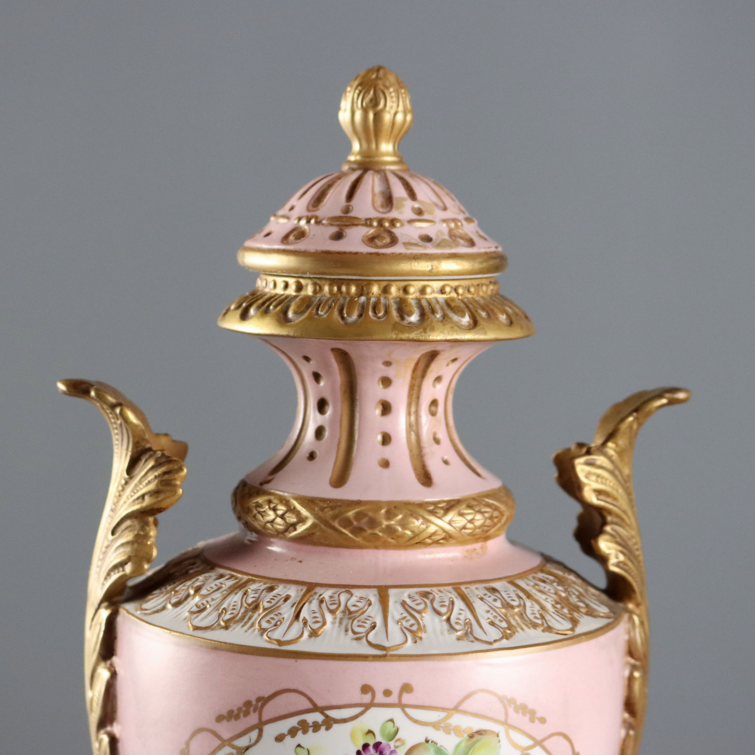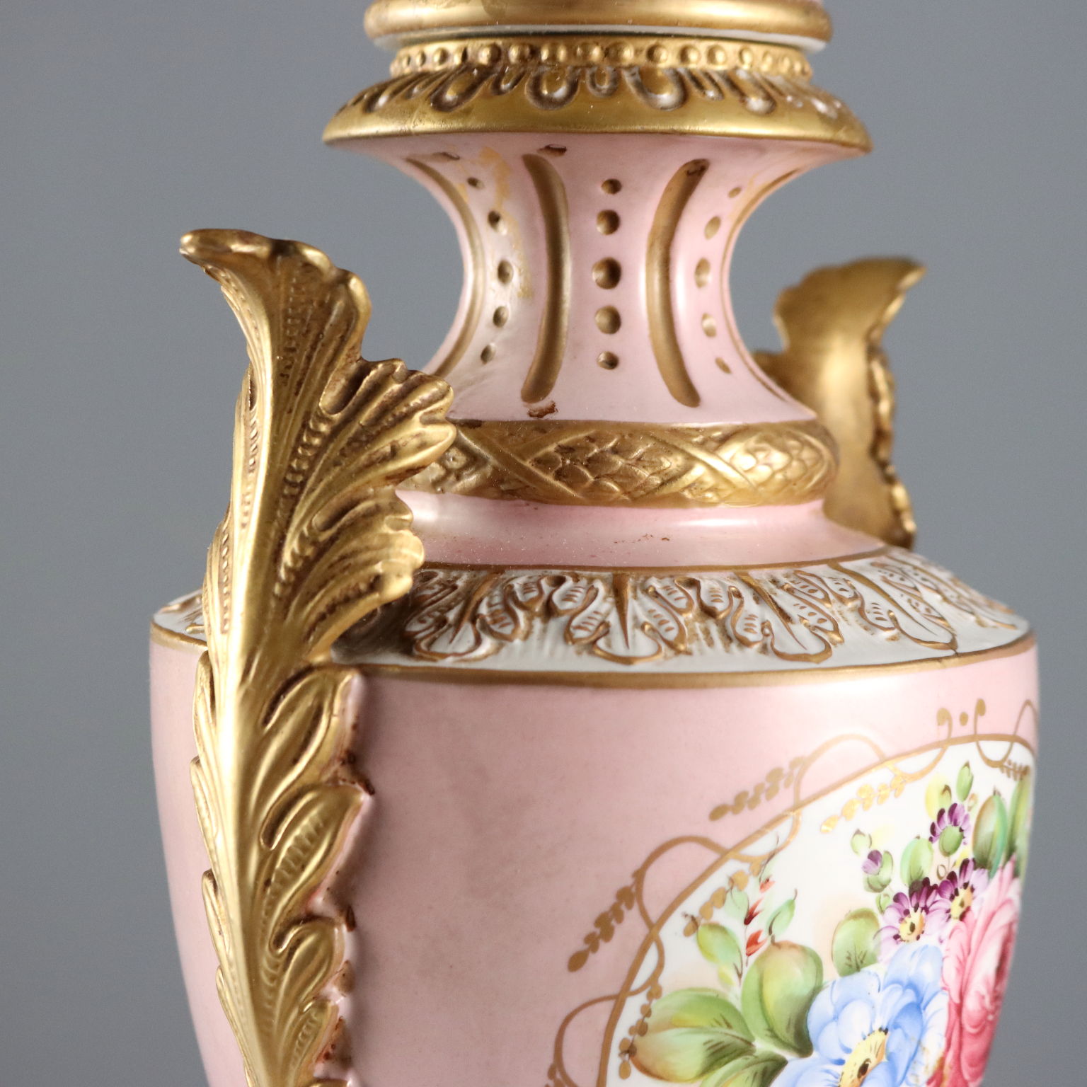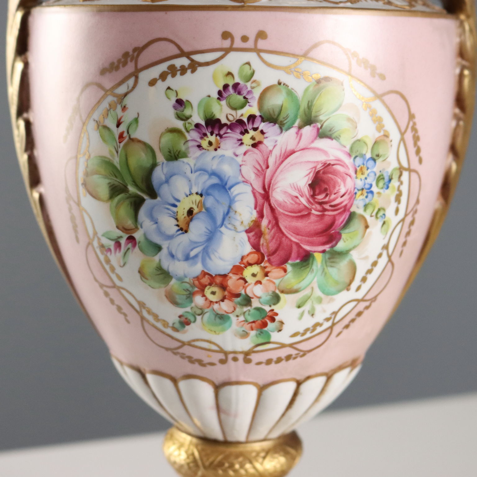 Ein Paar Potiches in Roségold. Polychrome Dekoration mit Blumenbouquets in den Reserven. Vergoldete blattförmige Henkel und ein knospenförmiger Griff. Herstellermarke in Blau unter dem Boden.