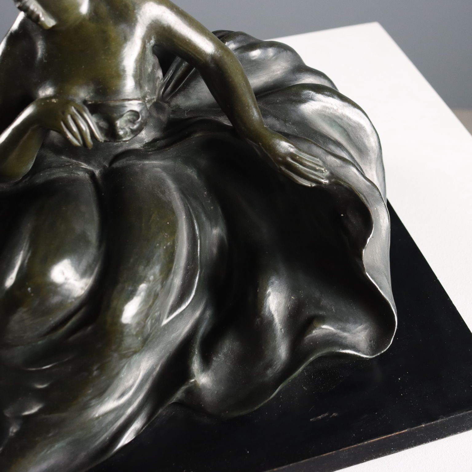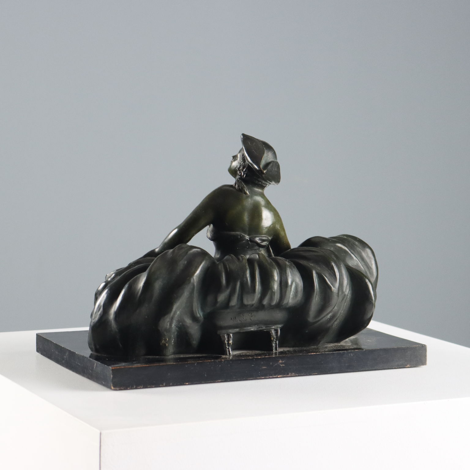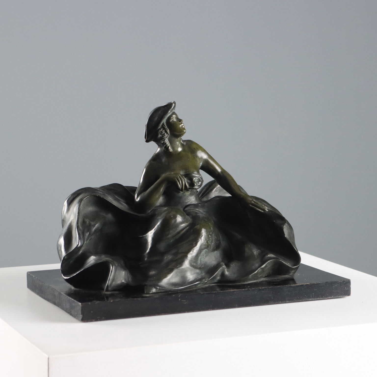 Terrakotta-Skulptur mit dunkler Patina auf einem Holzträger, die eine Dame in Kleidung aus dem frühen 20. Jahrhundert darstellt.
