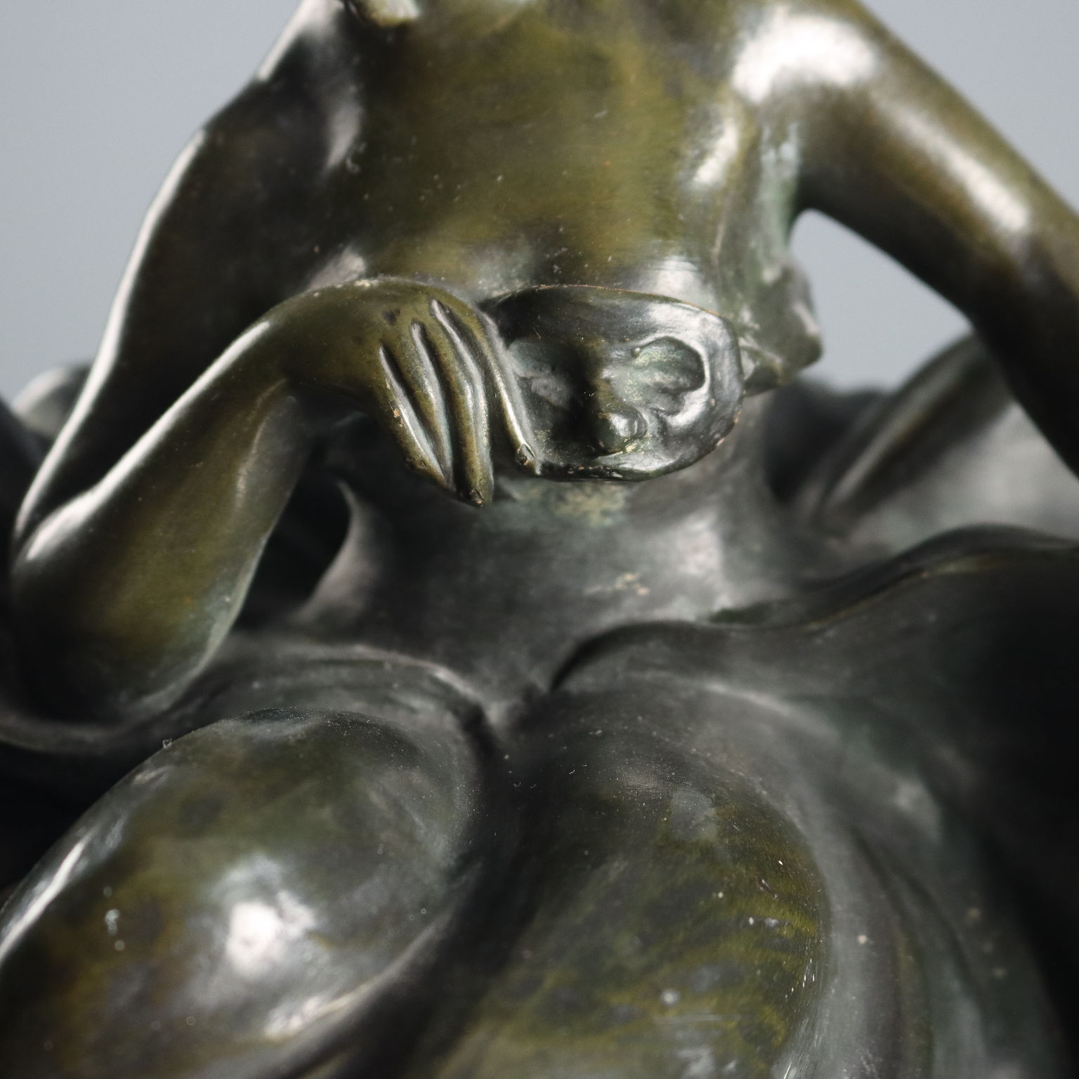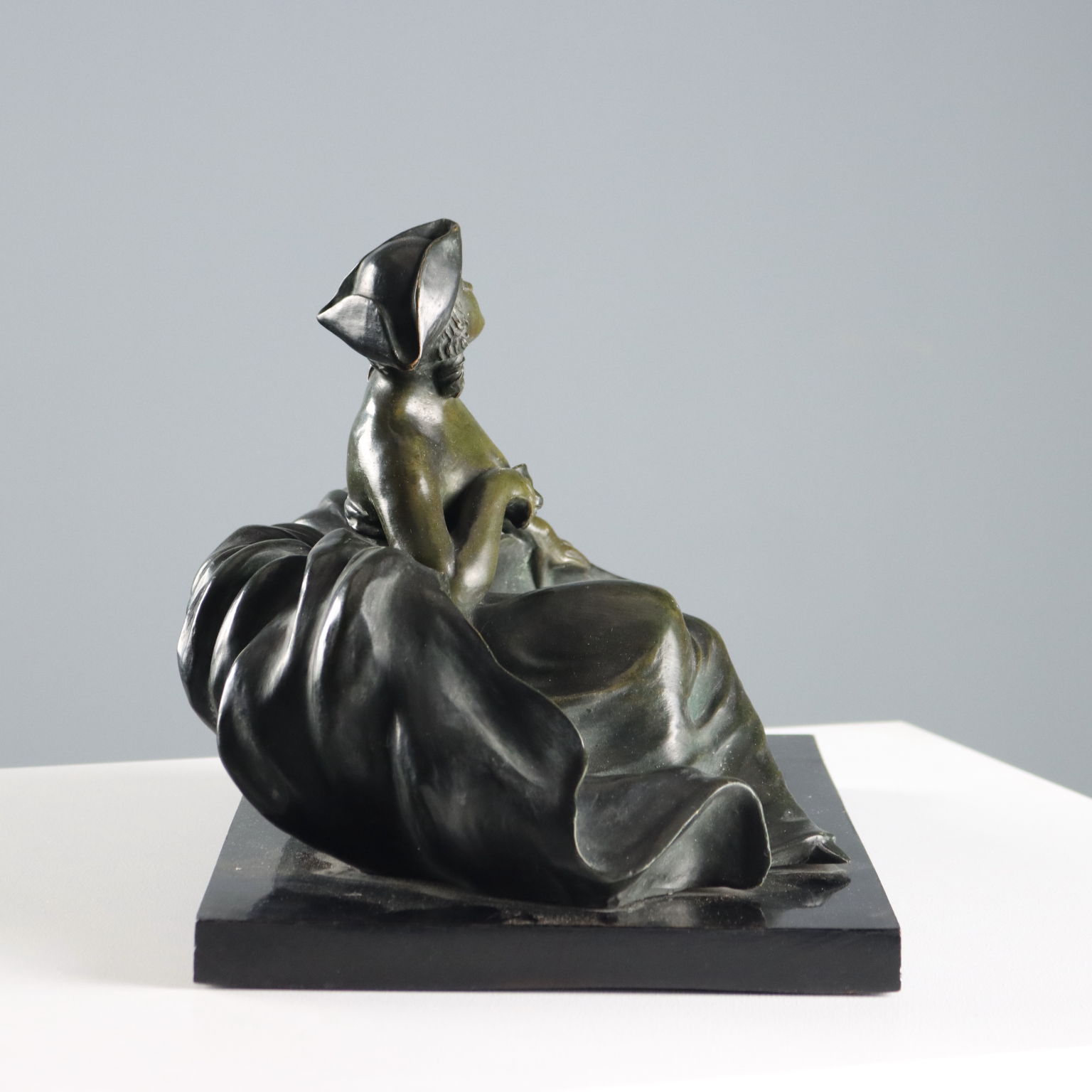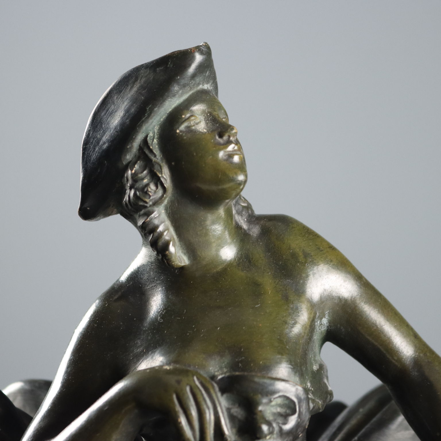 Terrakotta-Skulptur mit dunkler Patina auf einem Holzträger, die eine Dame in Kleidung aus dem frühen 20. Jahrhundert darstellt.