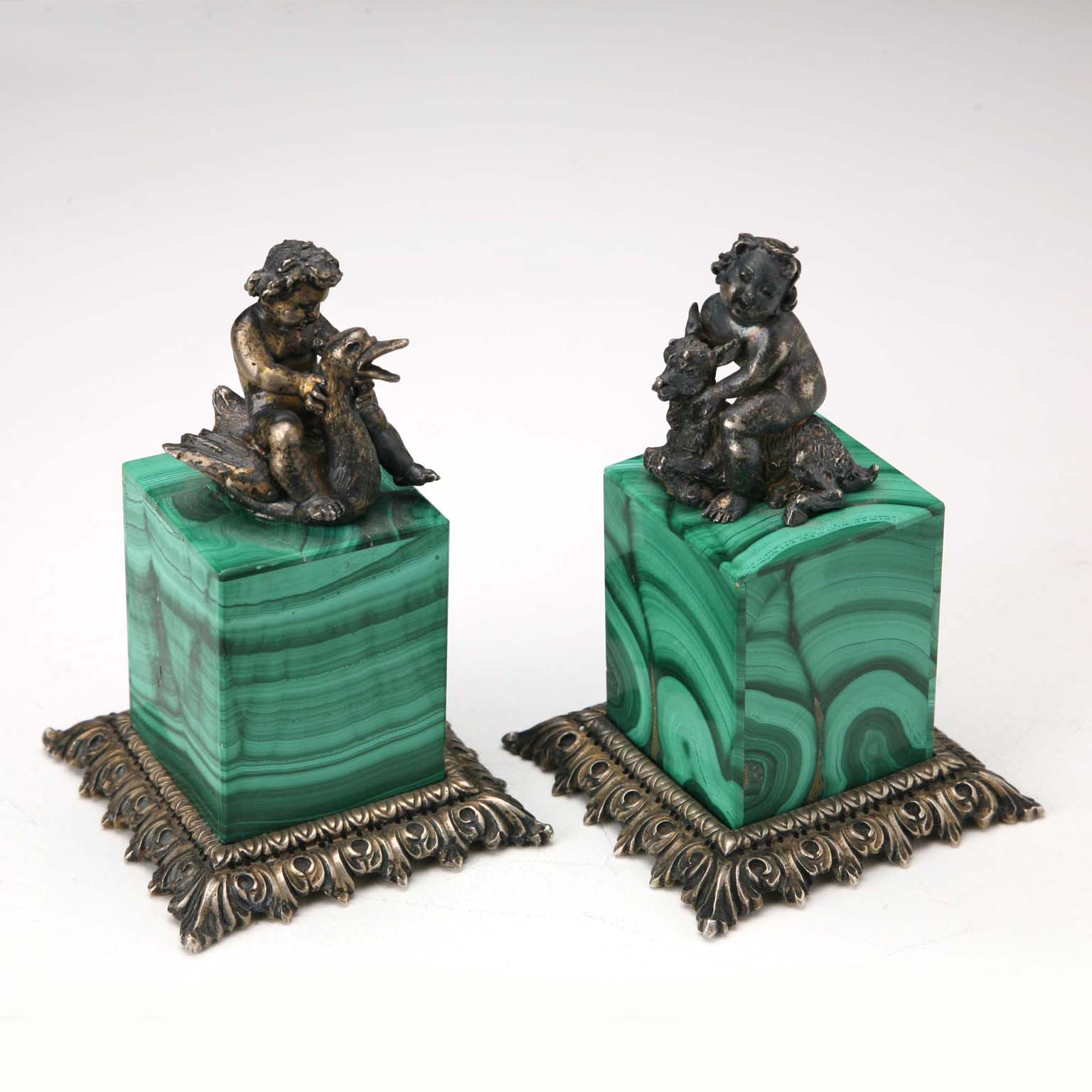 Vier silberne Skulpturen mit verspielten Szenen von Kindern mit Tieren. Sockel aus Malachit. Silberpunzen unter dem Sockel eingraviert. Silberschmiedemarke nicht identifizierbar. Ca. 440 Gramm.