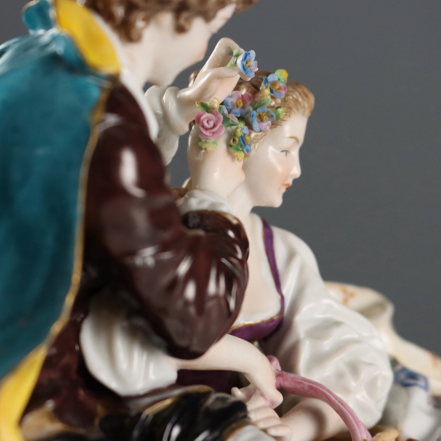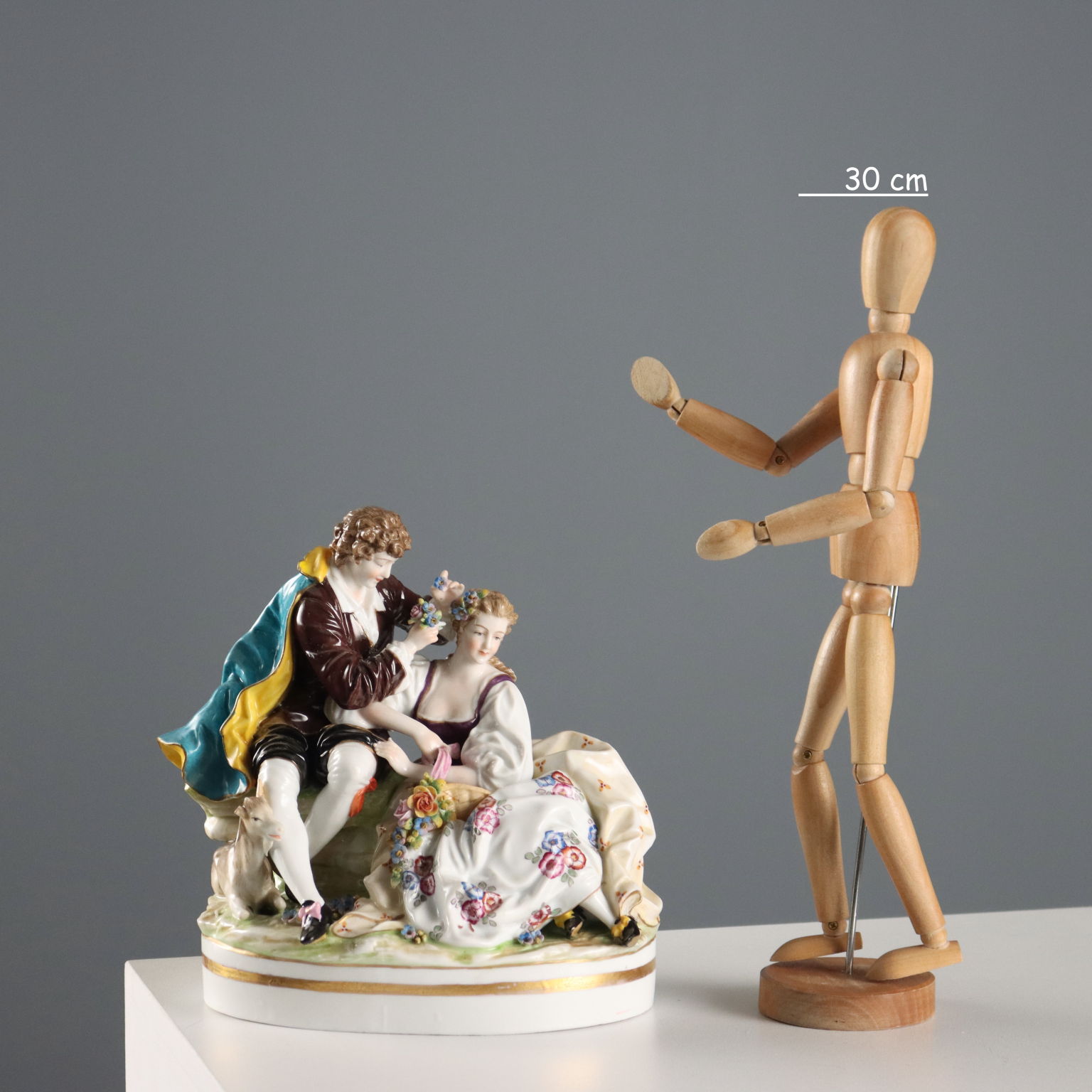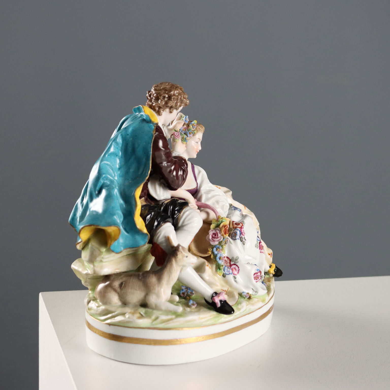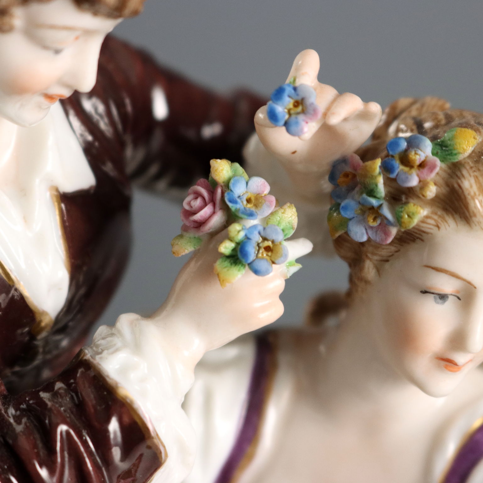 Porzellanskulptur, die eine Dame und einen Herrn in einer galanten Szene darstellt. Marke der Thüringer Fabrik E & A Müller.