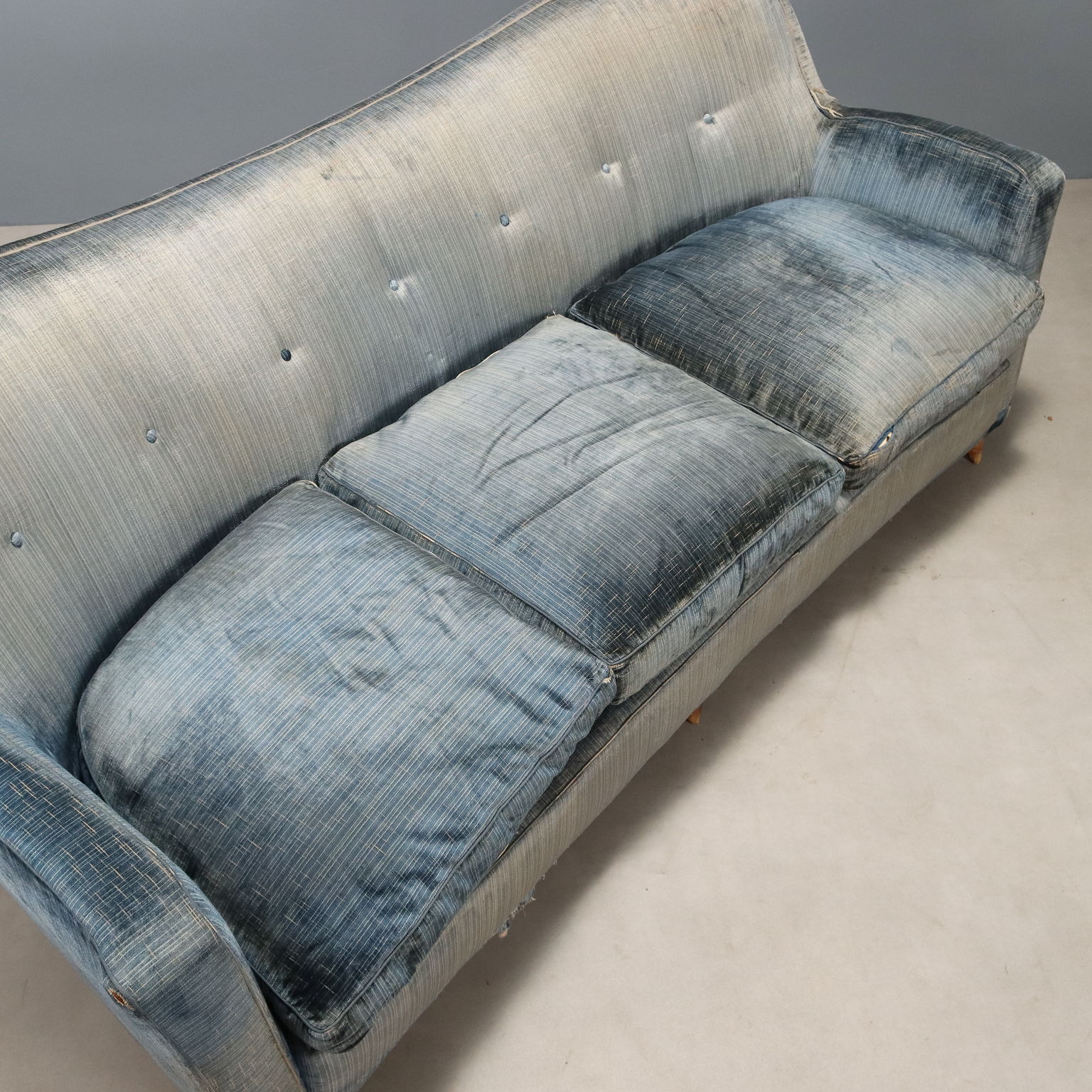 Dreisitzer-Sofa, Federkern, Federkissen, Samtbezug. Restaurierungsbedürftig.