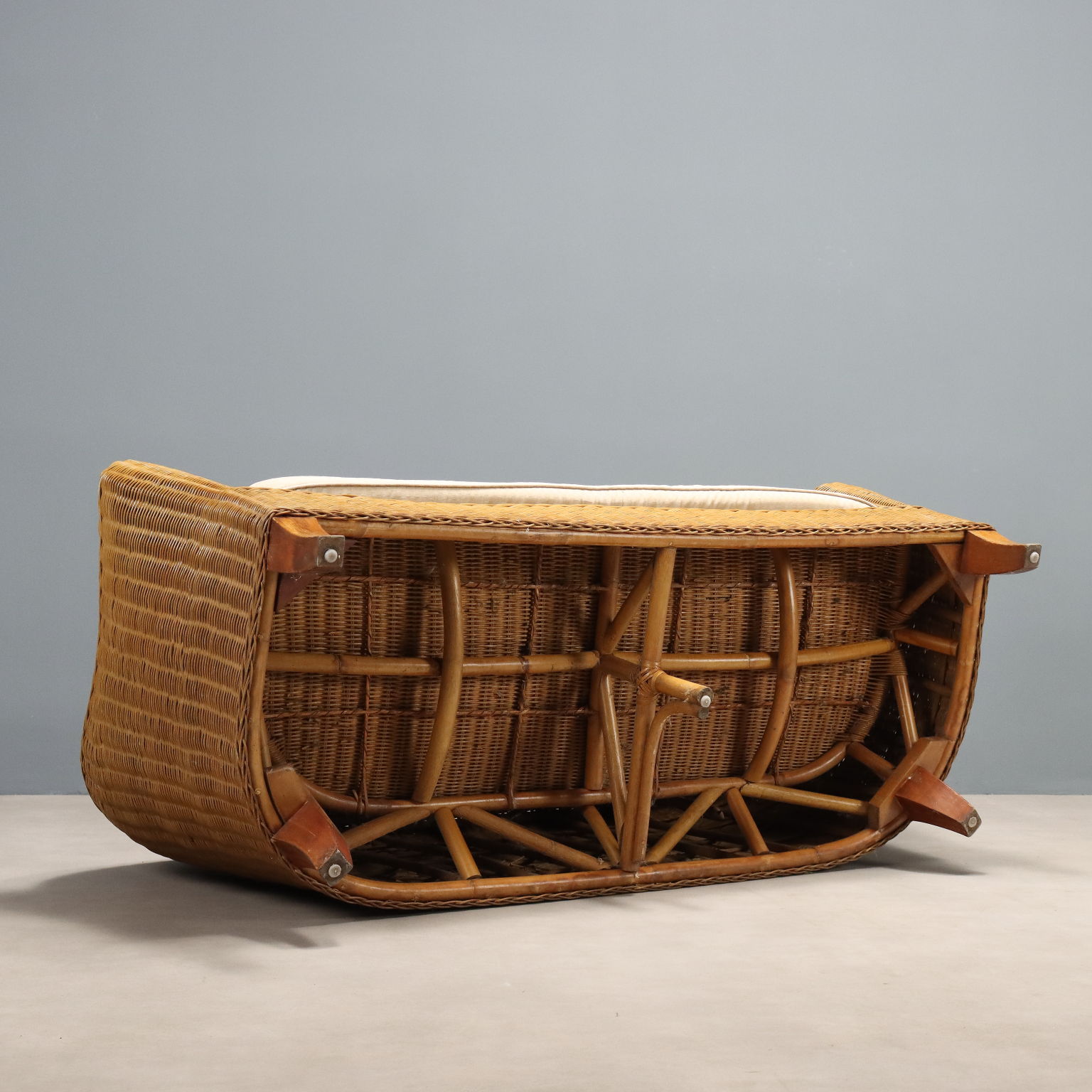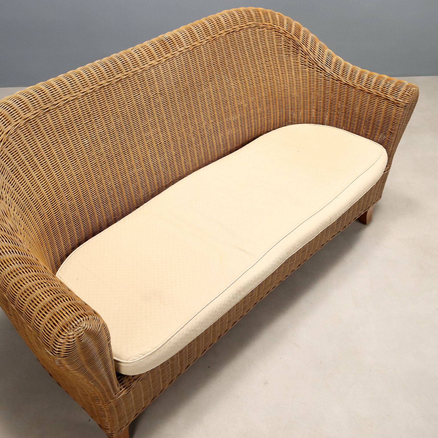 Vintage Korbsessel-Sofa mit weißem Kissen. Insgesamt in gutem Zustand mit einigen Gebrauchsspuren.