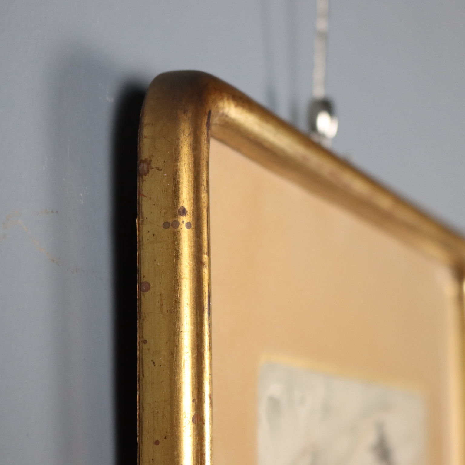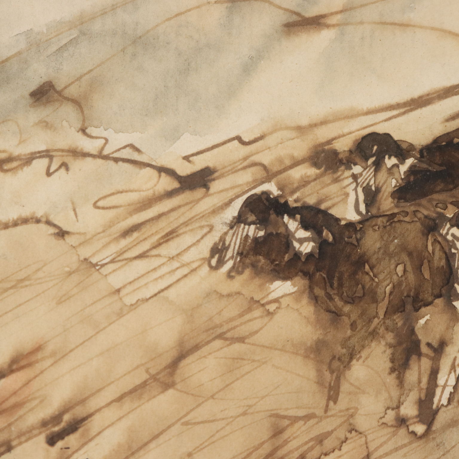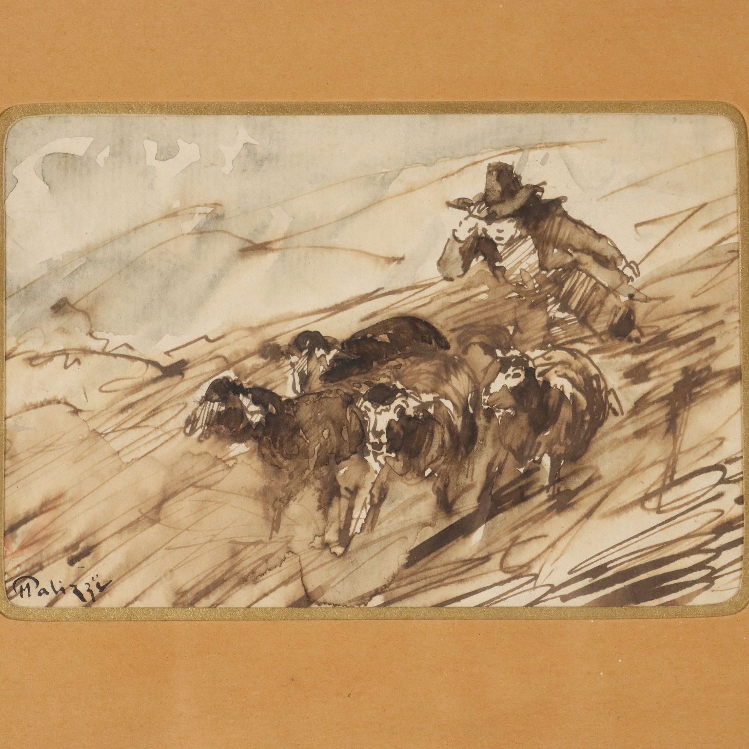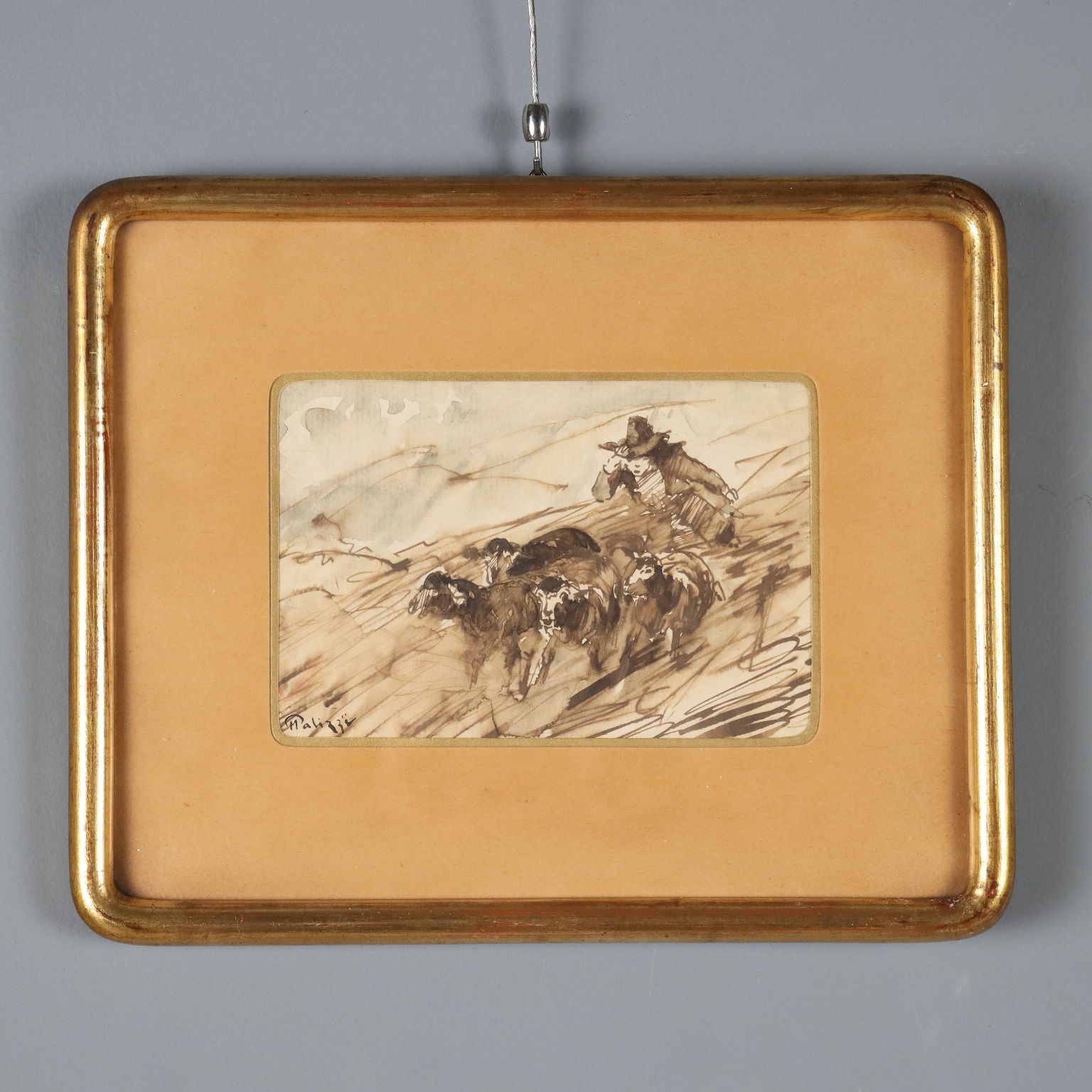Tusche auf Papier. Signiert unten links. Der neapolitanische Künstler Filippo Palizzi, auch bekannt als „Tiermaler“, gilt als einer der Erneuerer der neapolitanischen Malerei des 19. Jahrhunderts. Er wandte sich von der akademischen Malerei ab und widmete sich, inspiriert von zeitgenössischen französischen Einflüssen, dem Studium der Natur, insbesondere einfacher Sujets wie kleinen Landschaften und Tierbildern. So schuf er Werke von intensivem Realismus, die zugleich von einer intimen, poetischen Note durchdrungen sind. Besonders hervorzuheben ist die akribische Ausführung der Details seiner dargestellten Motive. Herden mit Hirten sind ein wiederkehrendes Thema in seinem Werk, wie auch in dieser kleinen Zeichnung. Das Werk befindet sich in einem zeitgenössischen Rahmen.