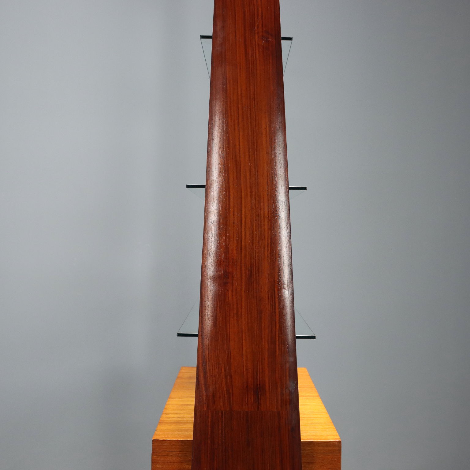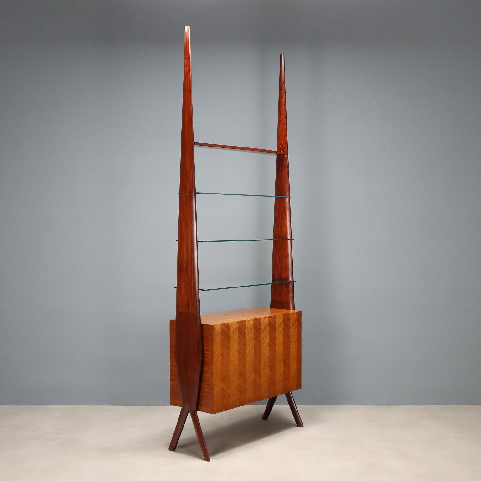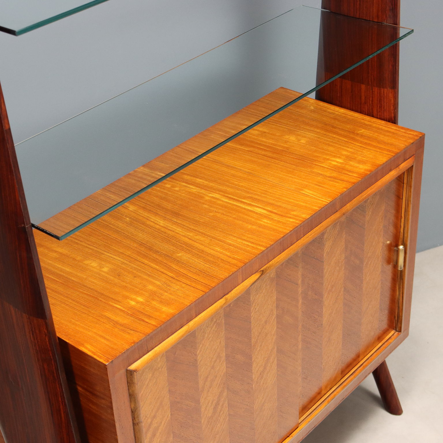 Elegantes, freistehendes, italienisches Vintage-Bücherregal aus dem 20. Jahrhundert mit exotisch furnierten Holzrahmen, einem mahagonifurnierten Staufach und vier Regalböden (drei aus Glas, einer aus Holz). Messinggriffe. Restauriert.