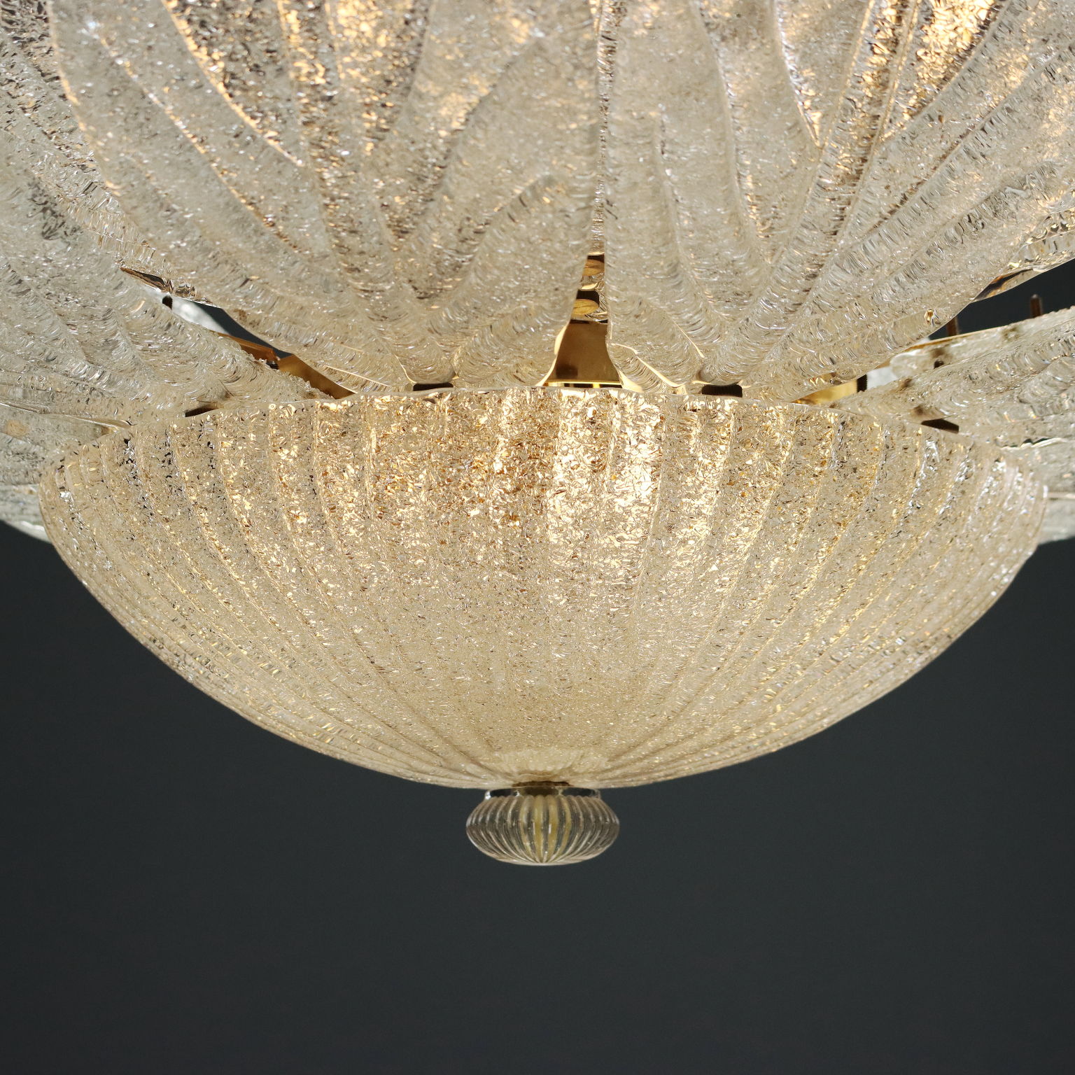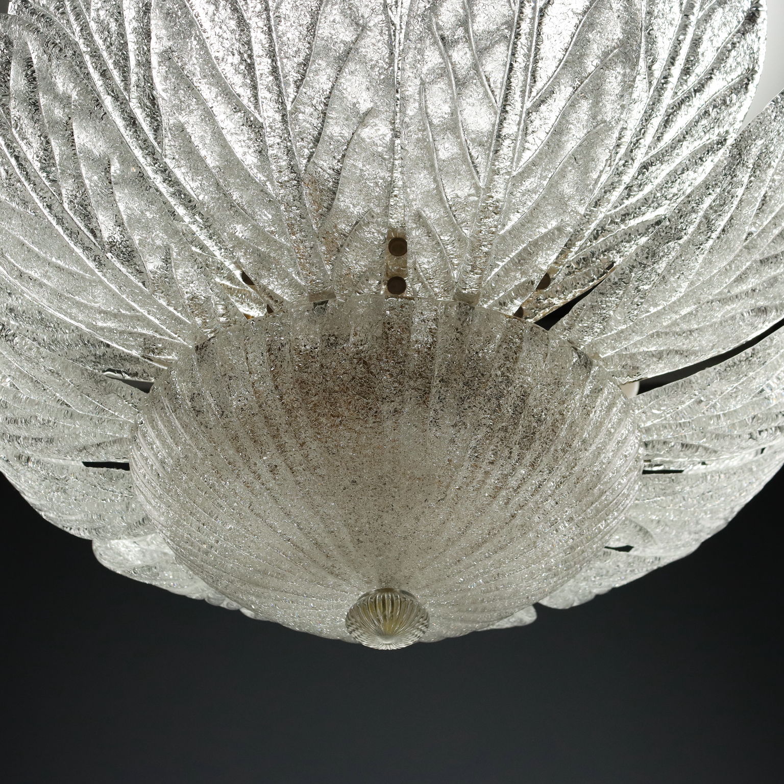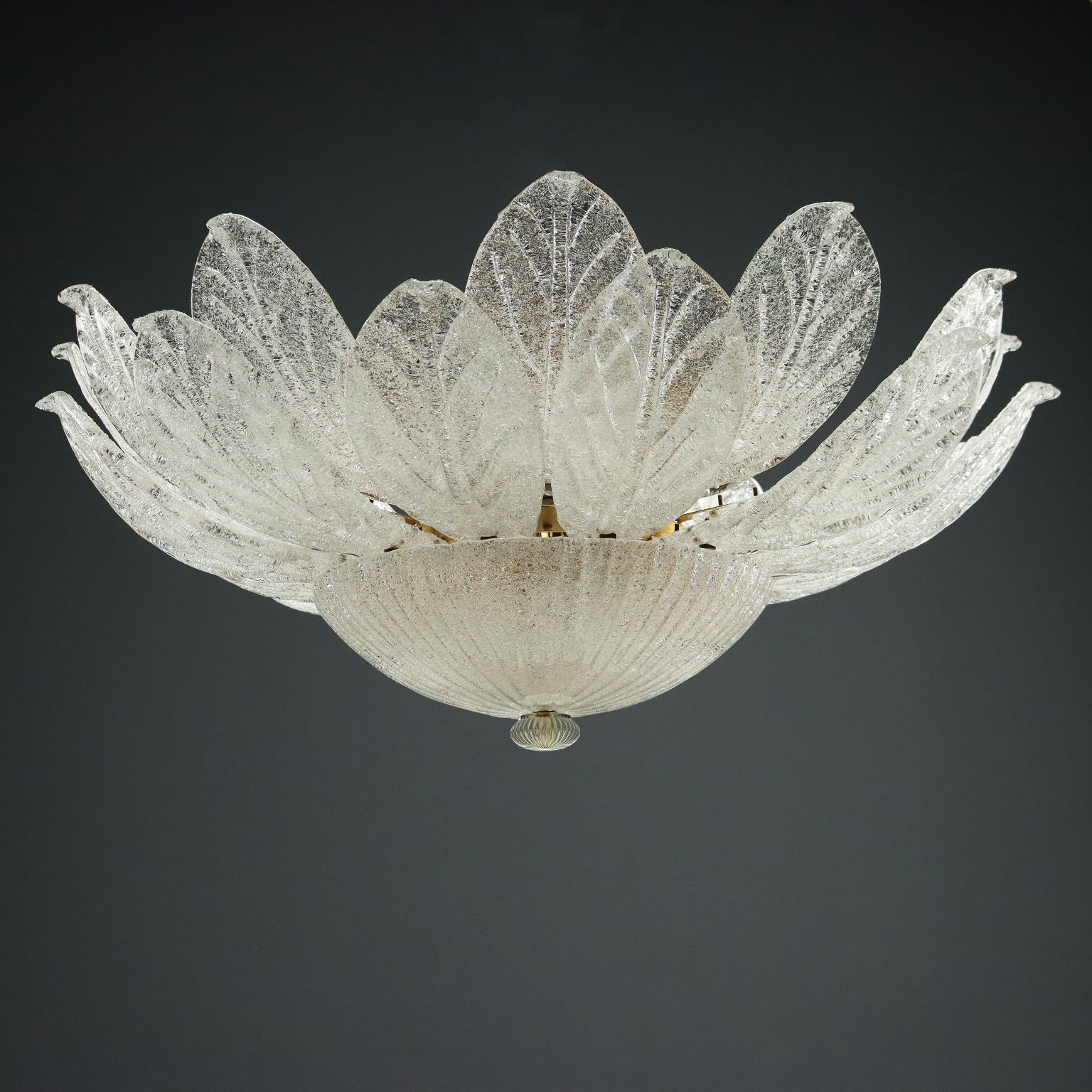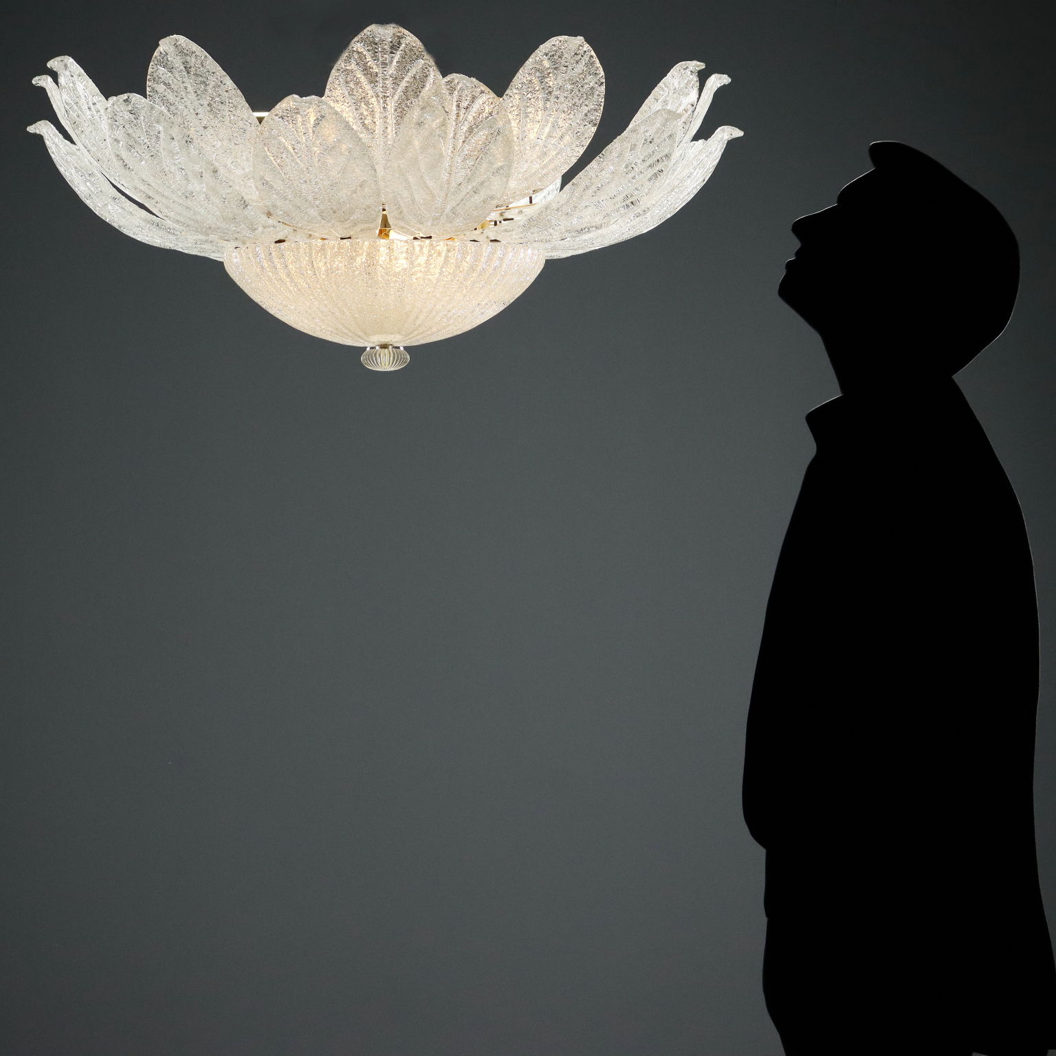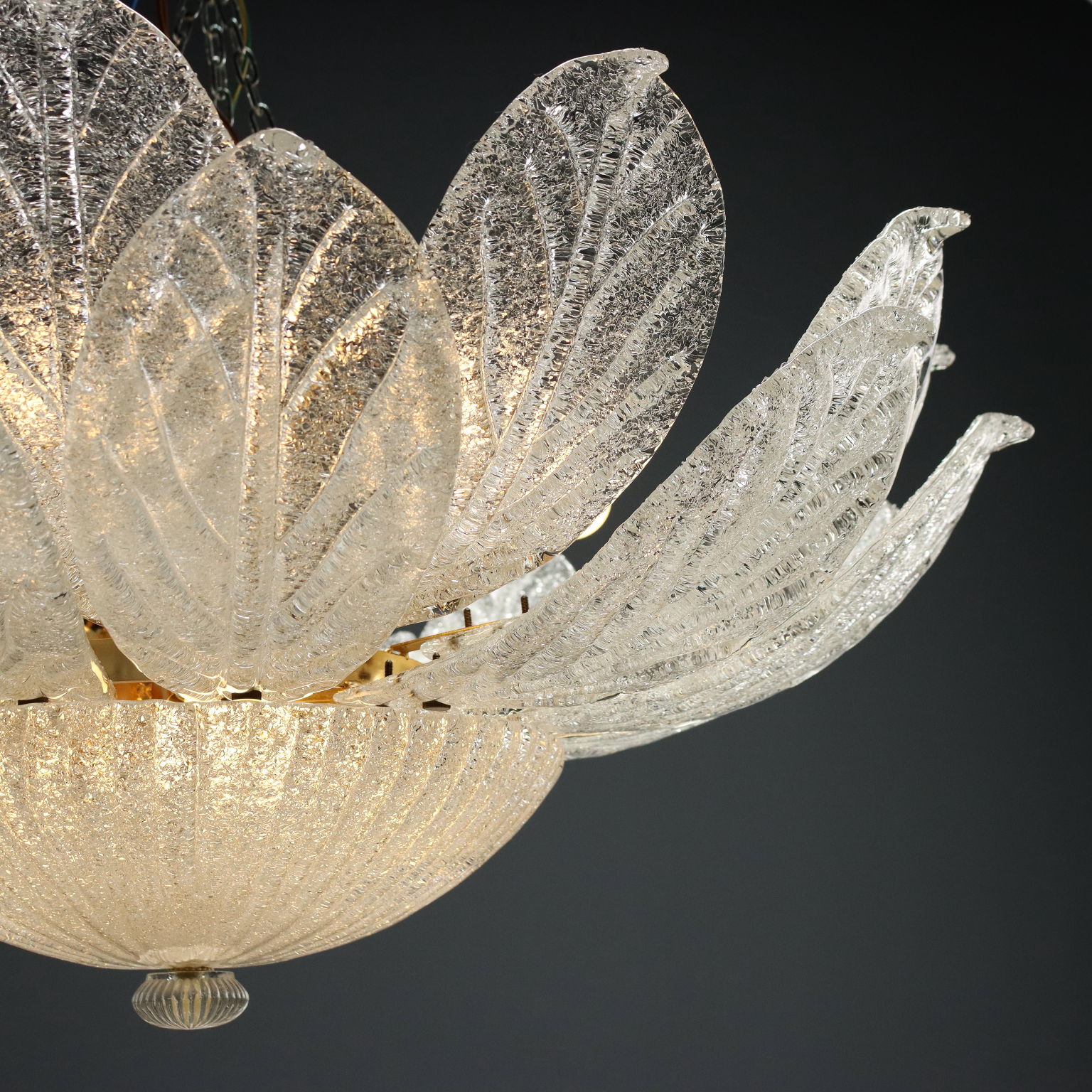 Deckenleuchte mit vergoldeter Metallfassung und handgefertigten Blättern aus Muranoglas. E27-Fassung.