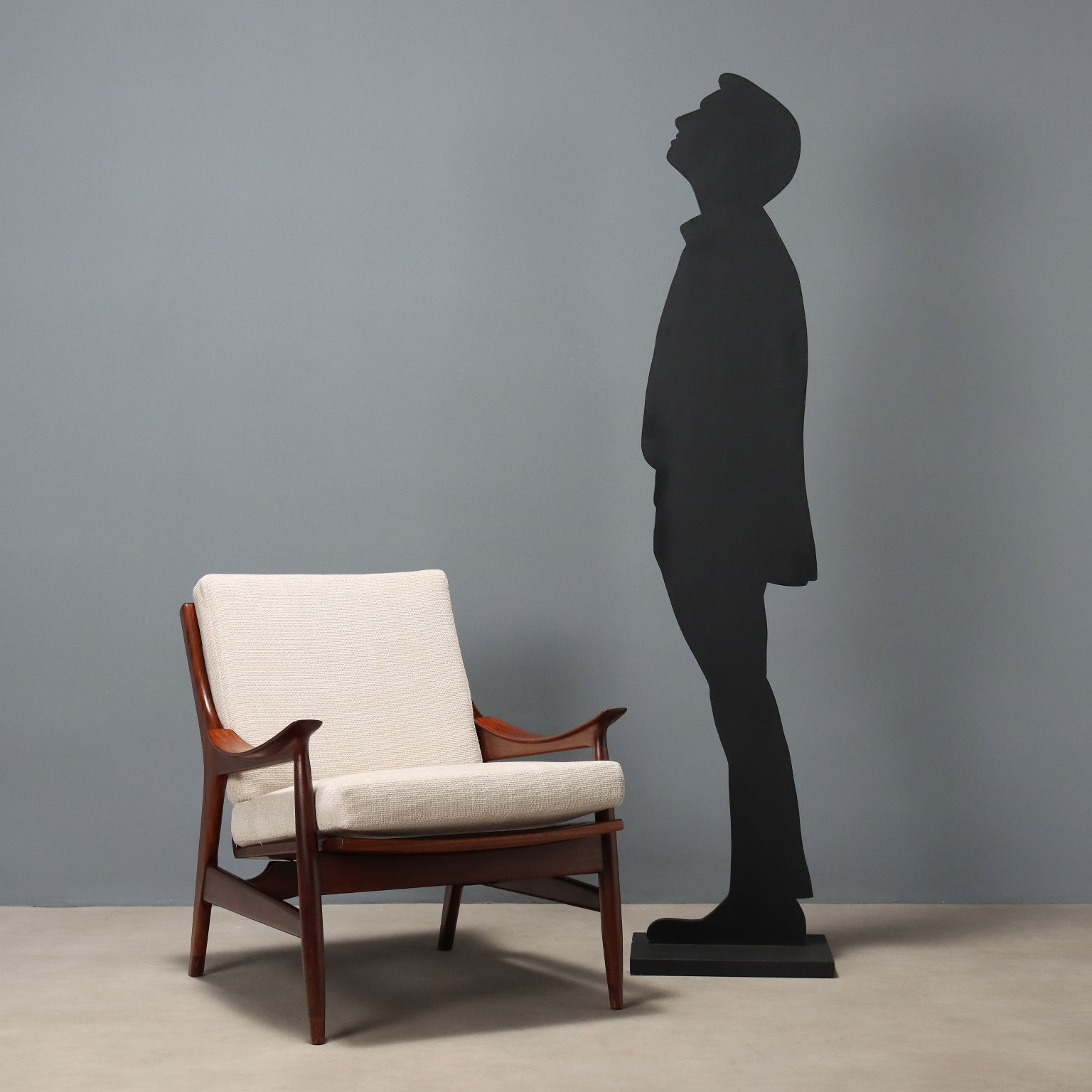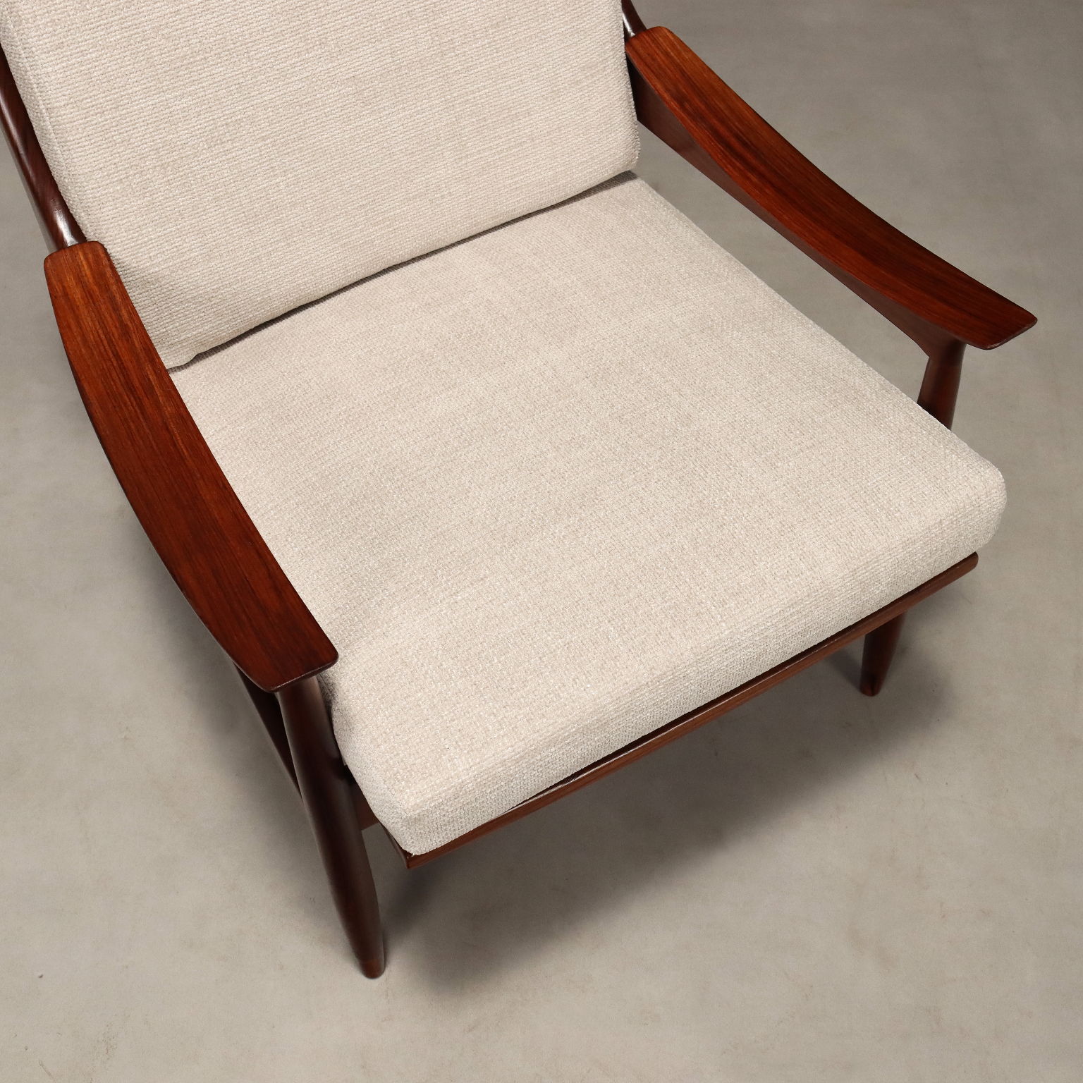Vintage-Sessel mit sichtbarem Teakholzgestell, Sitz- und Rückenkissen auf neu bezogenen, cremeweißen Stoffkordeln. Der Sessel wurde in unserer Werkstatt restauriert.